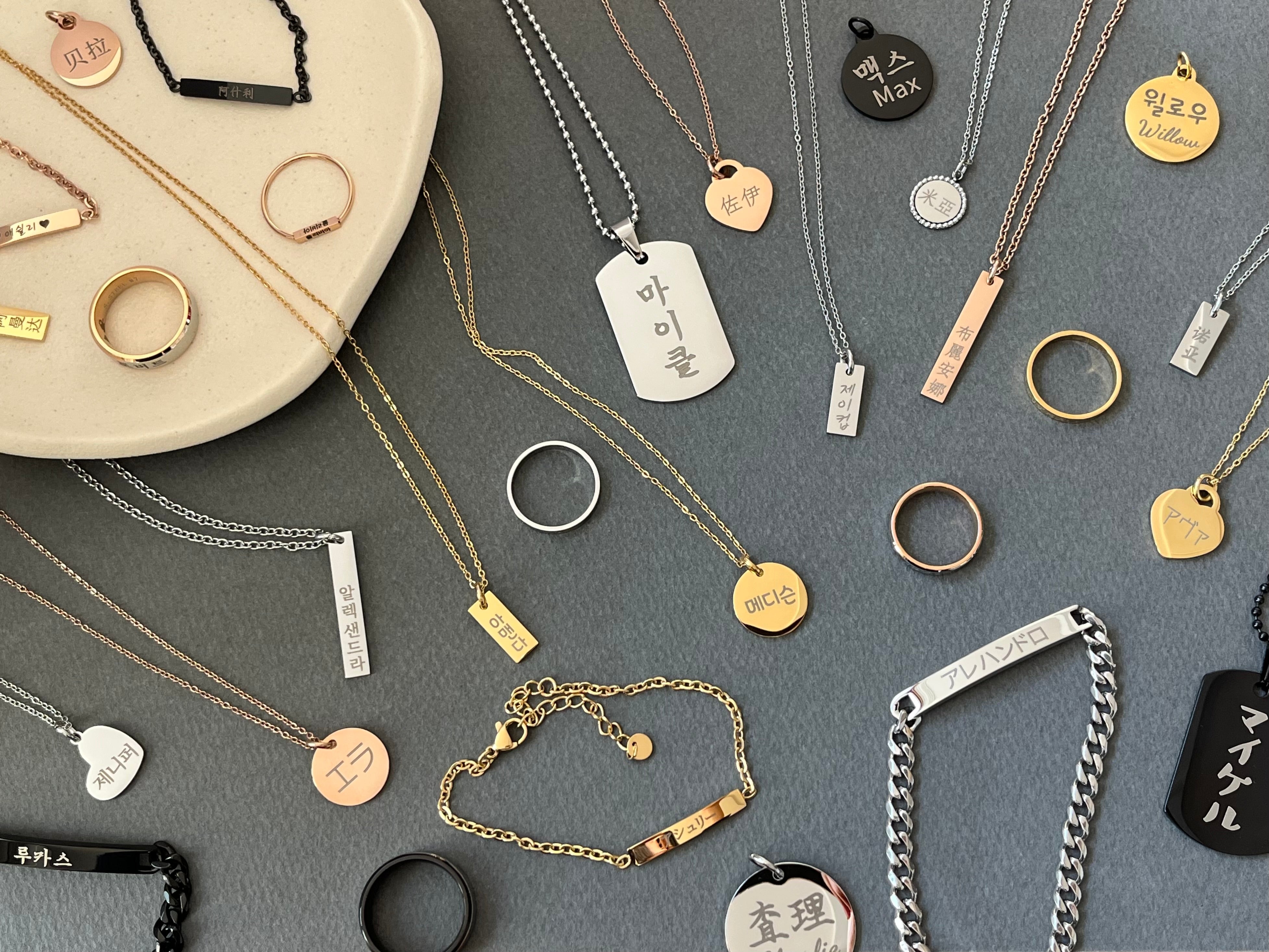 Personalized Name Jewelry in Korean, Chinese, Japanese, and English Letters