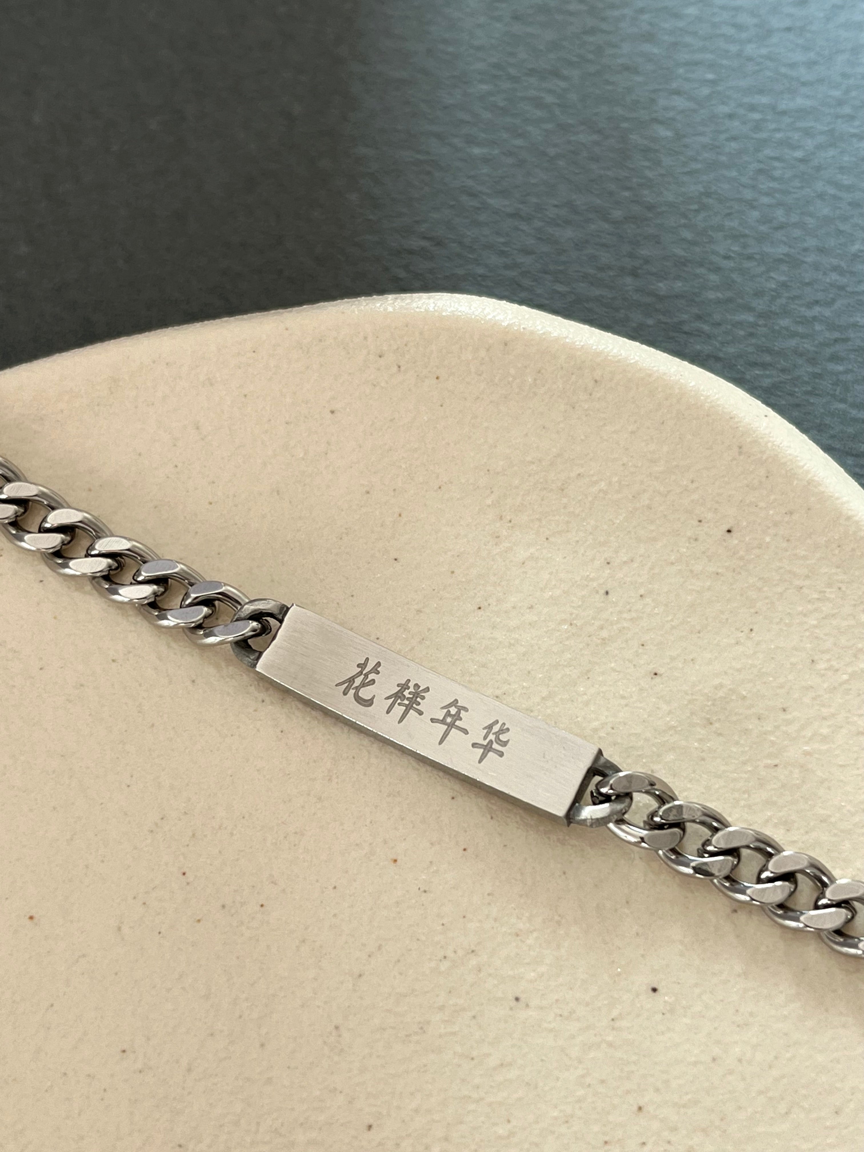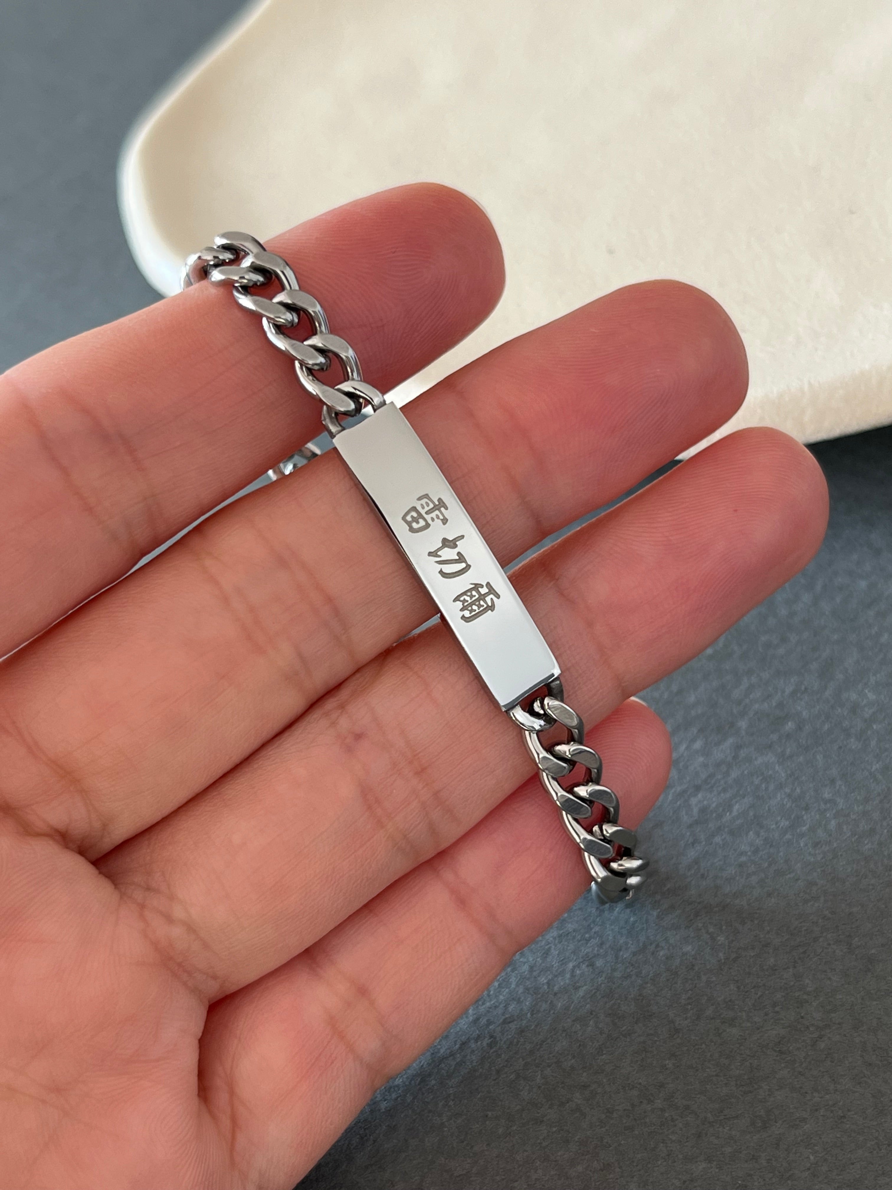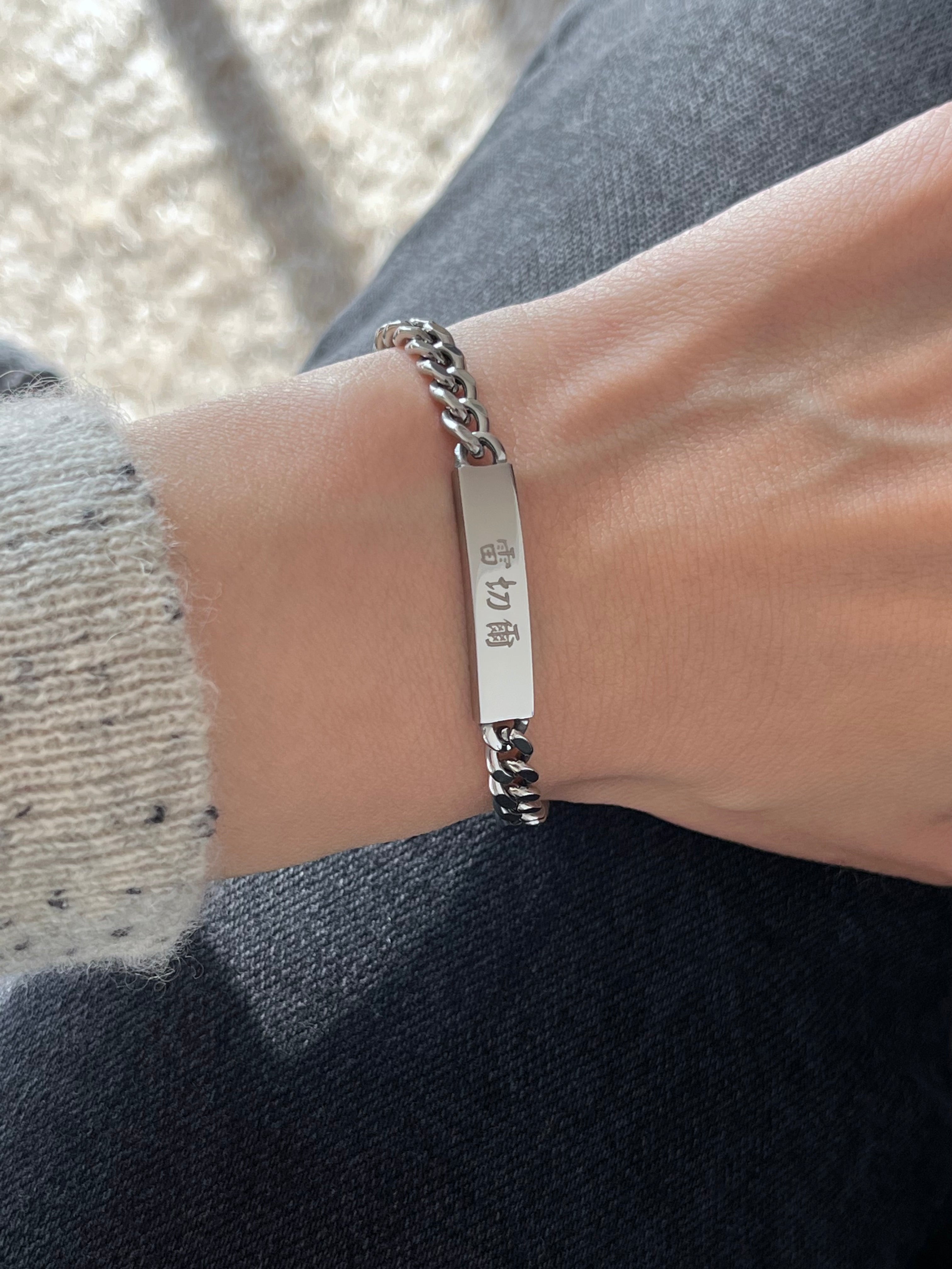 This is a personalized engraved Chinese name medium bar bracelet in stainless steel. Stainless steel jewelry is strong and almost never tarnish or corrode.