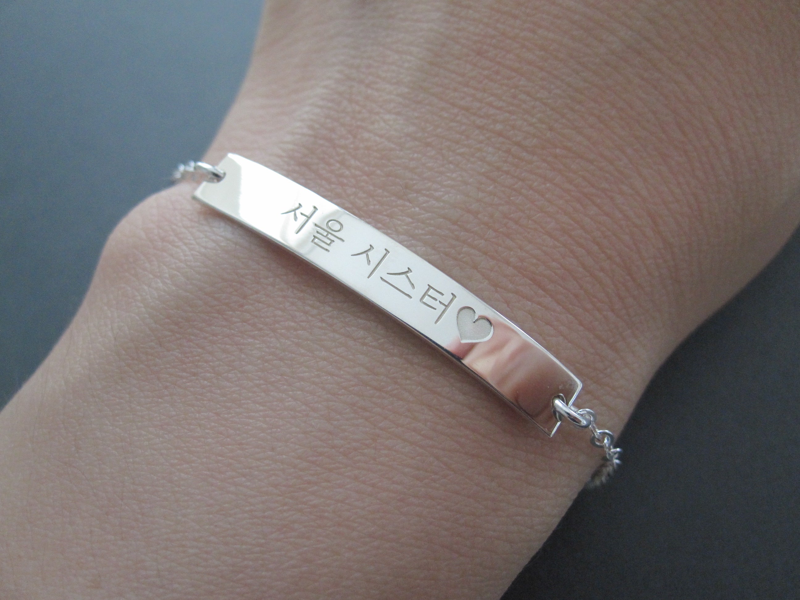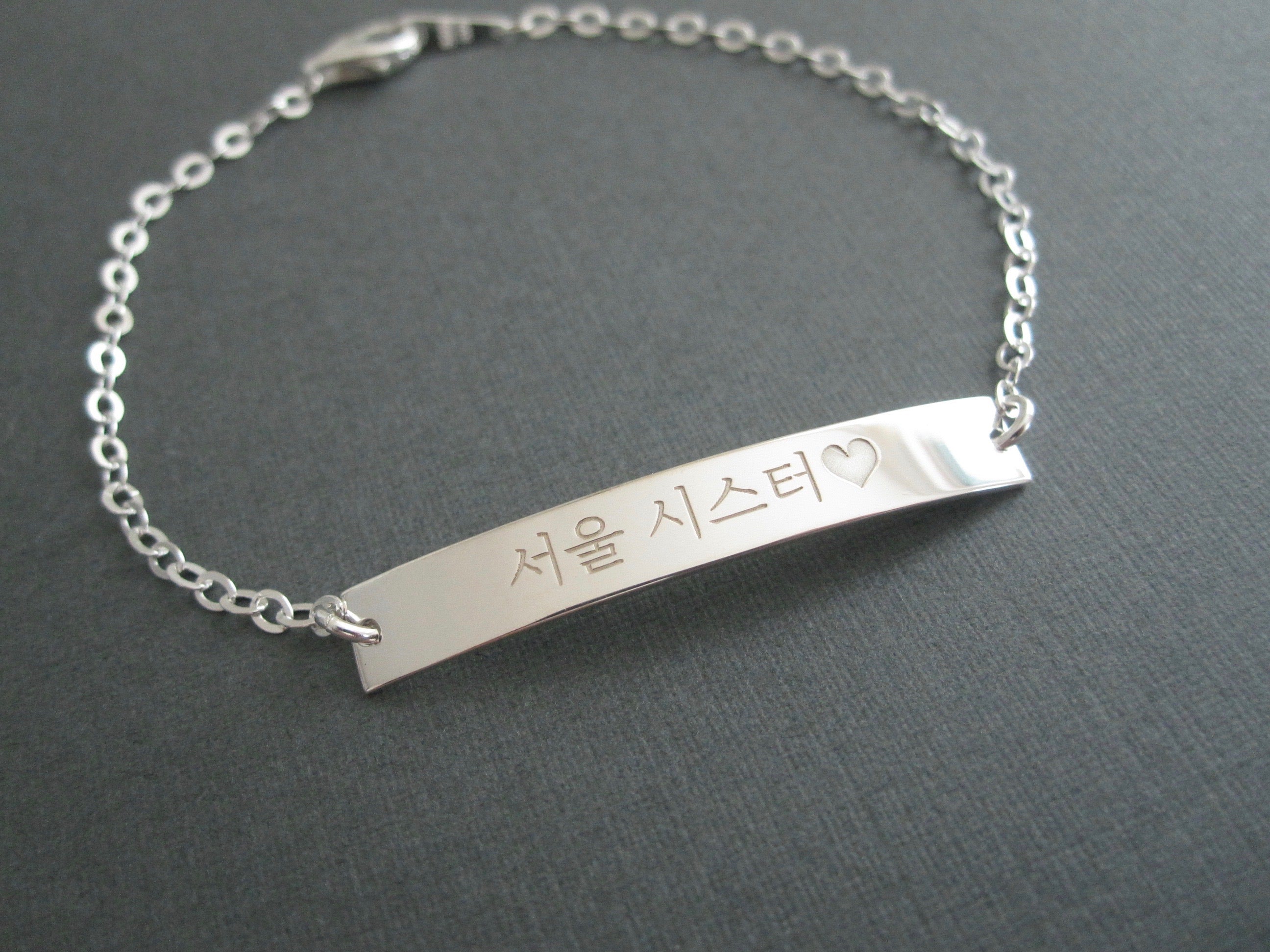 The sample bracelet is engraved with Seoul Sister in Korean in the font style #2. Please check the font options in the pictures.