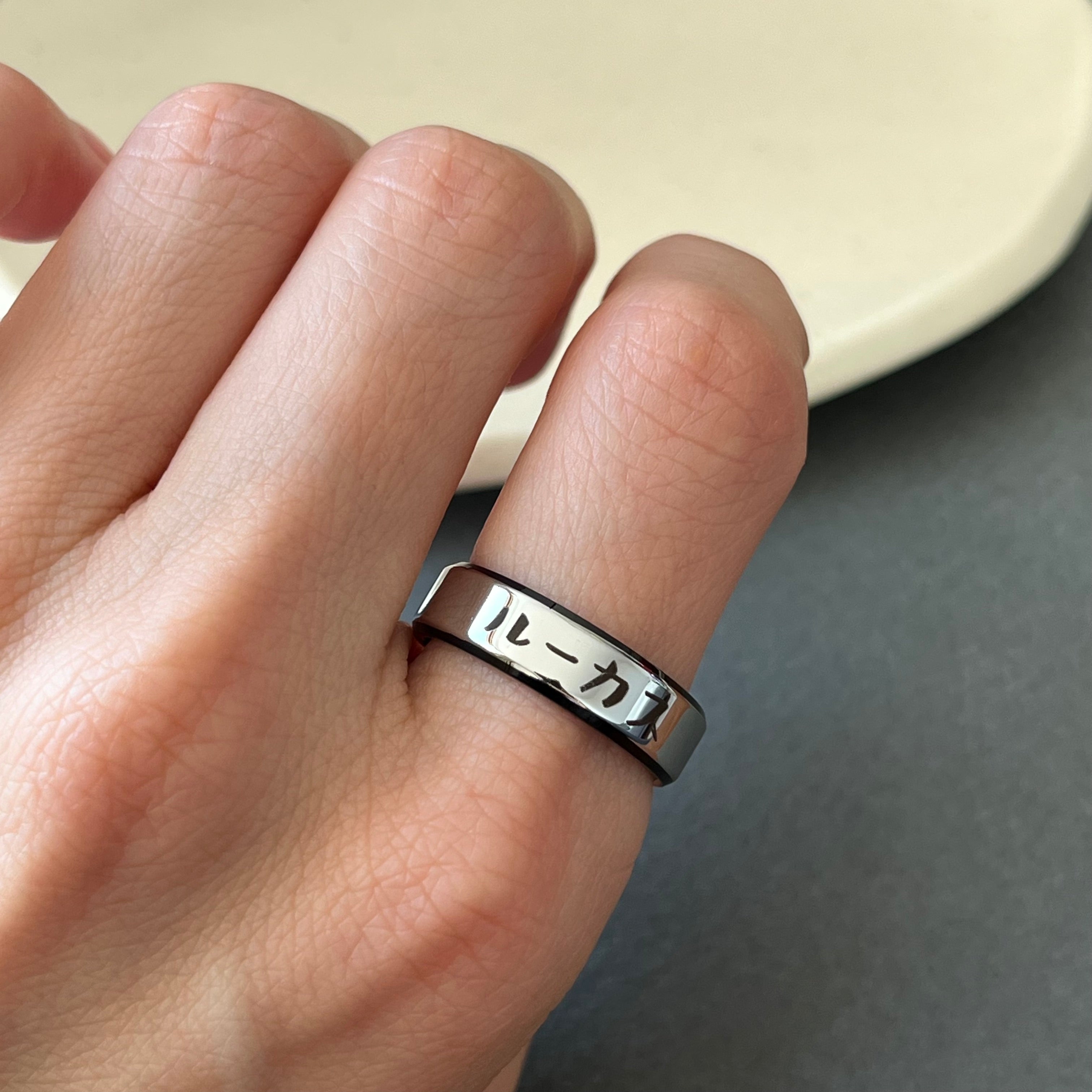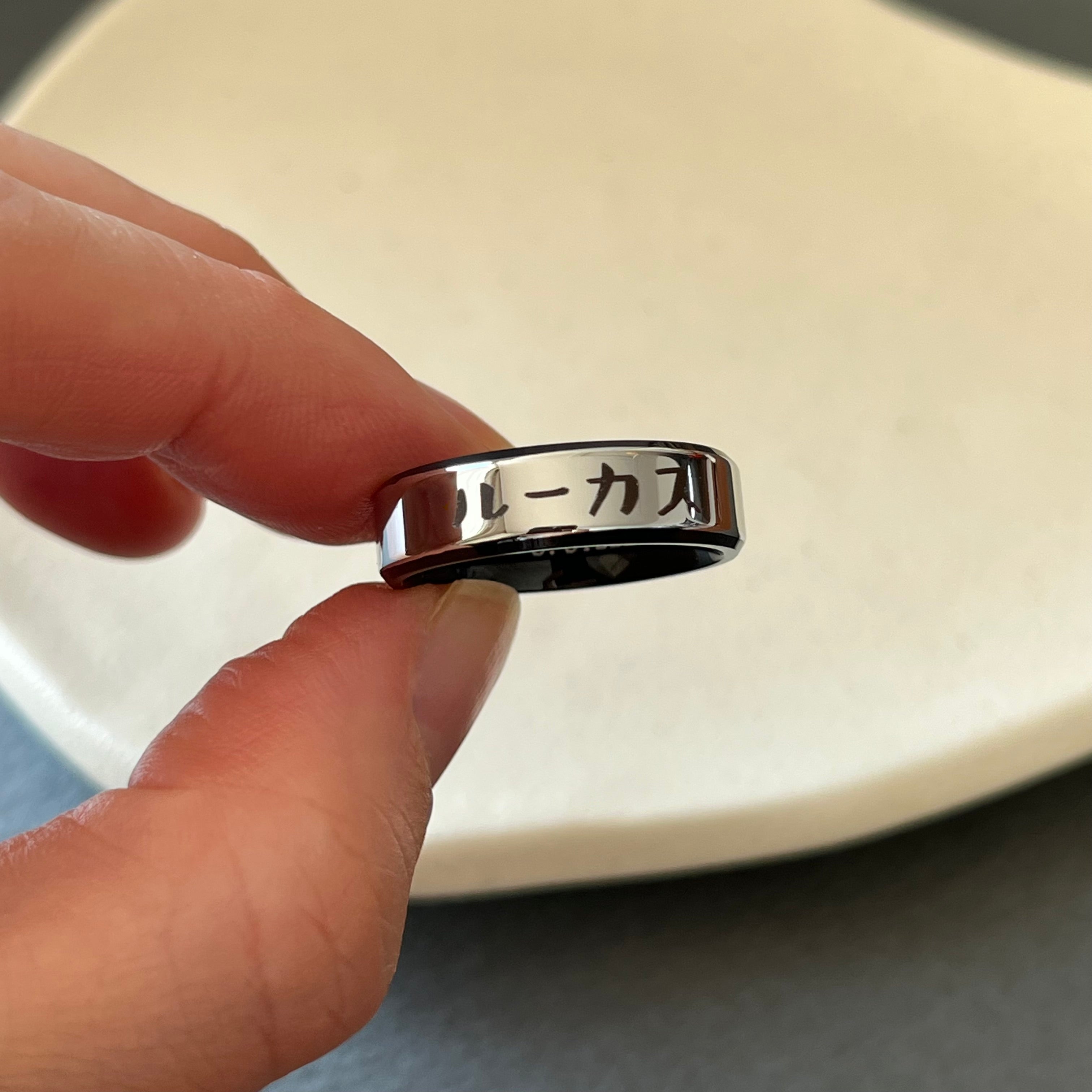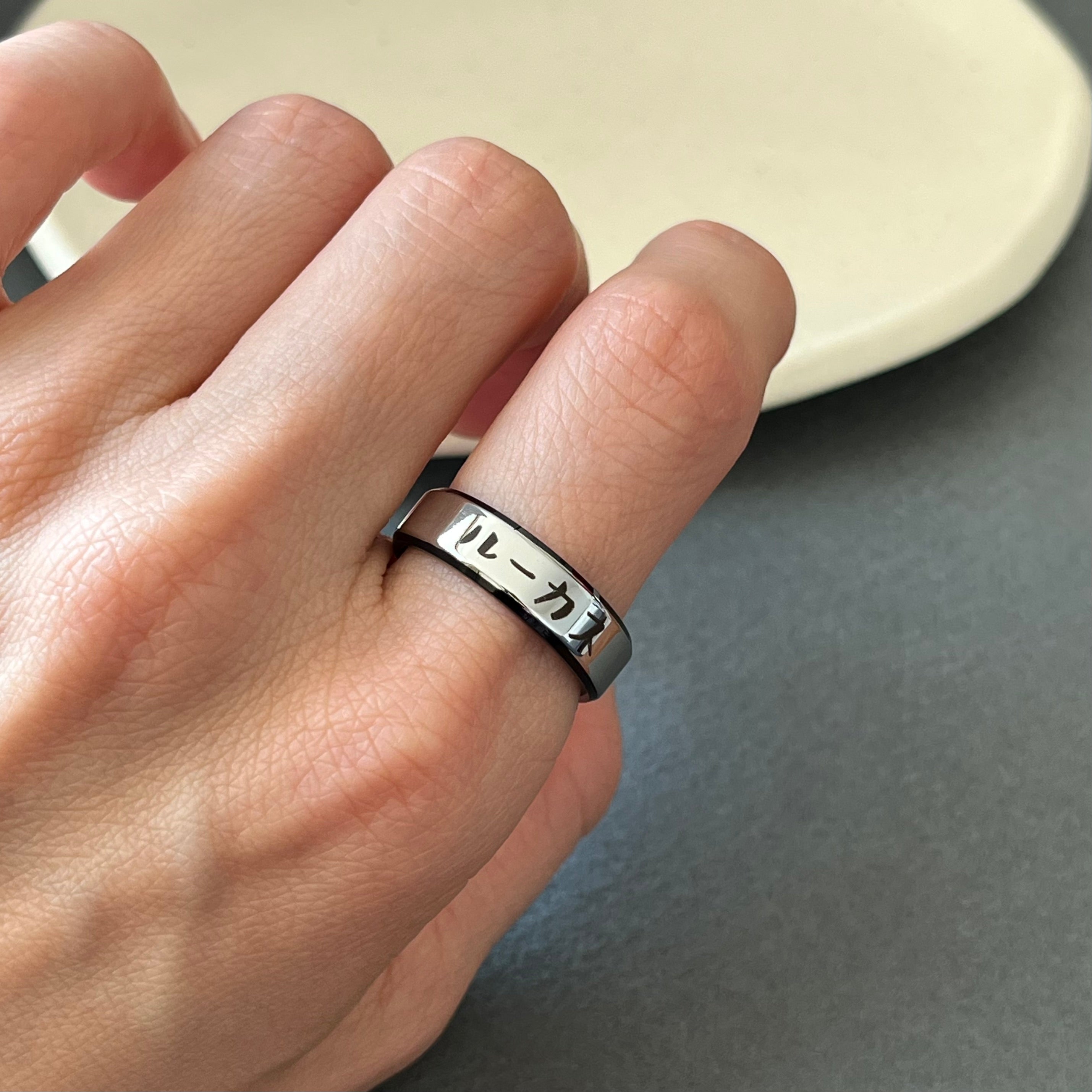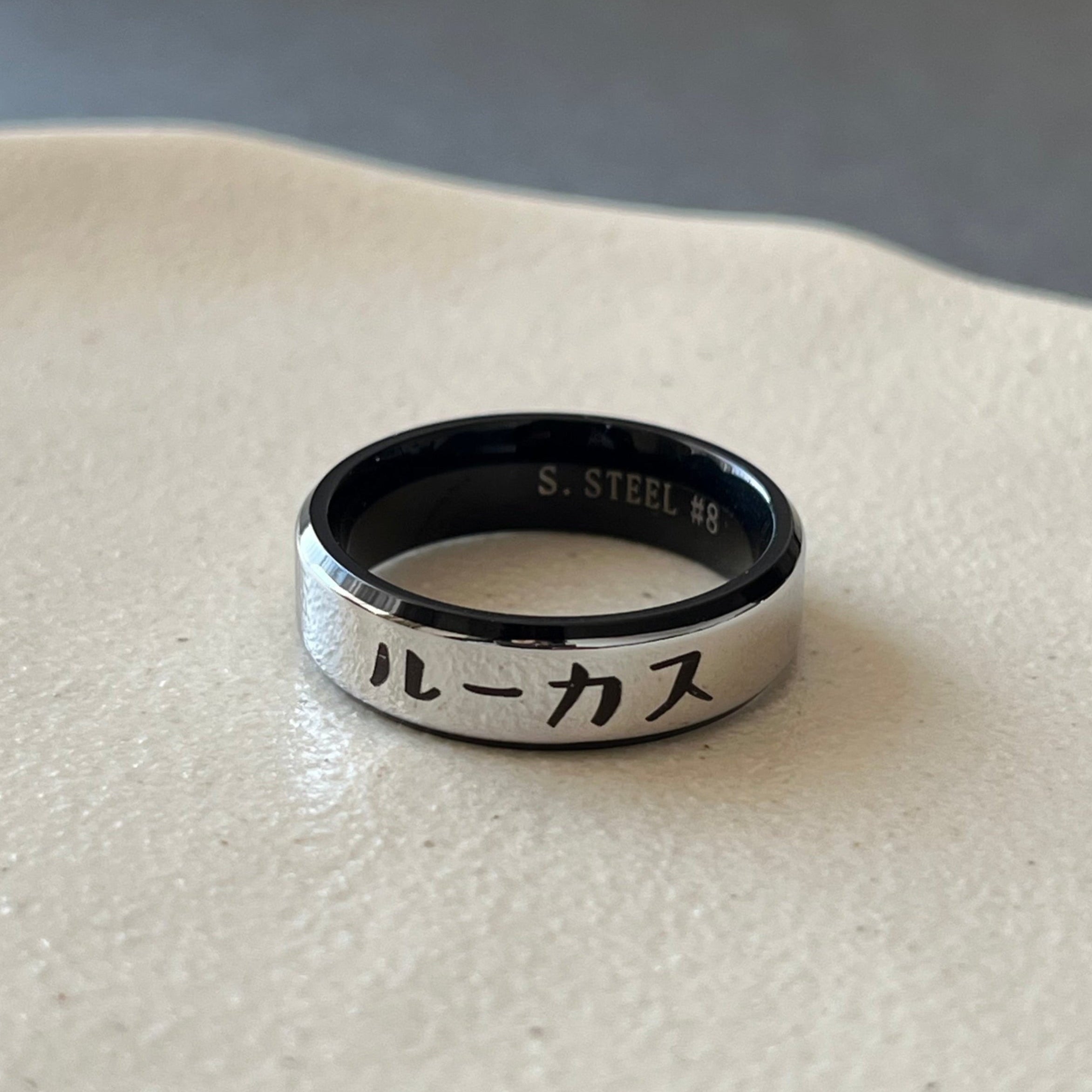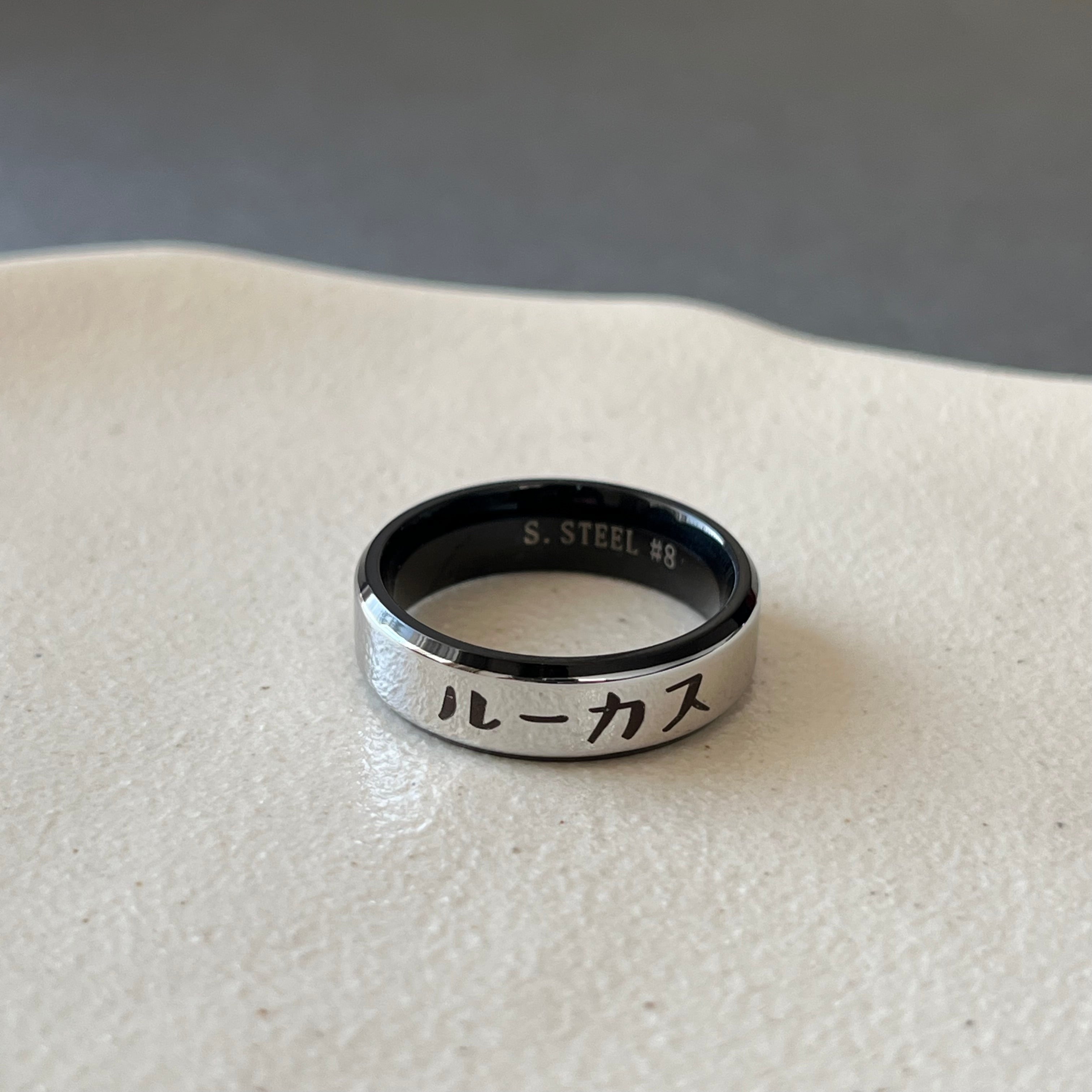 Personalized Japanese Name Black And Silver Two Tone Stainless Steel Band Ring In Dark Engraving- Custom Japanese Ring - Japanese Characters