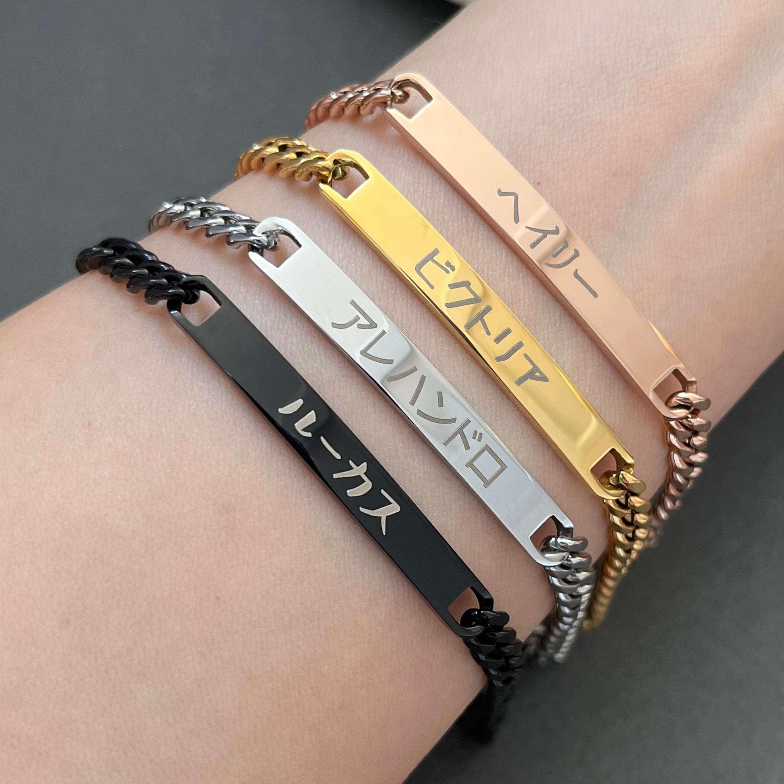 This is a personalized engraved Japanese name large bar bracelet in stainless steel.