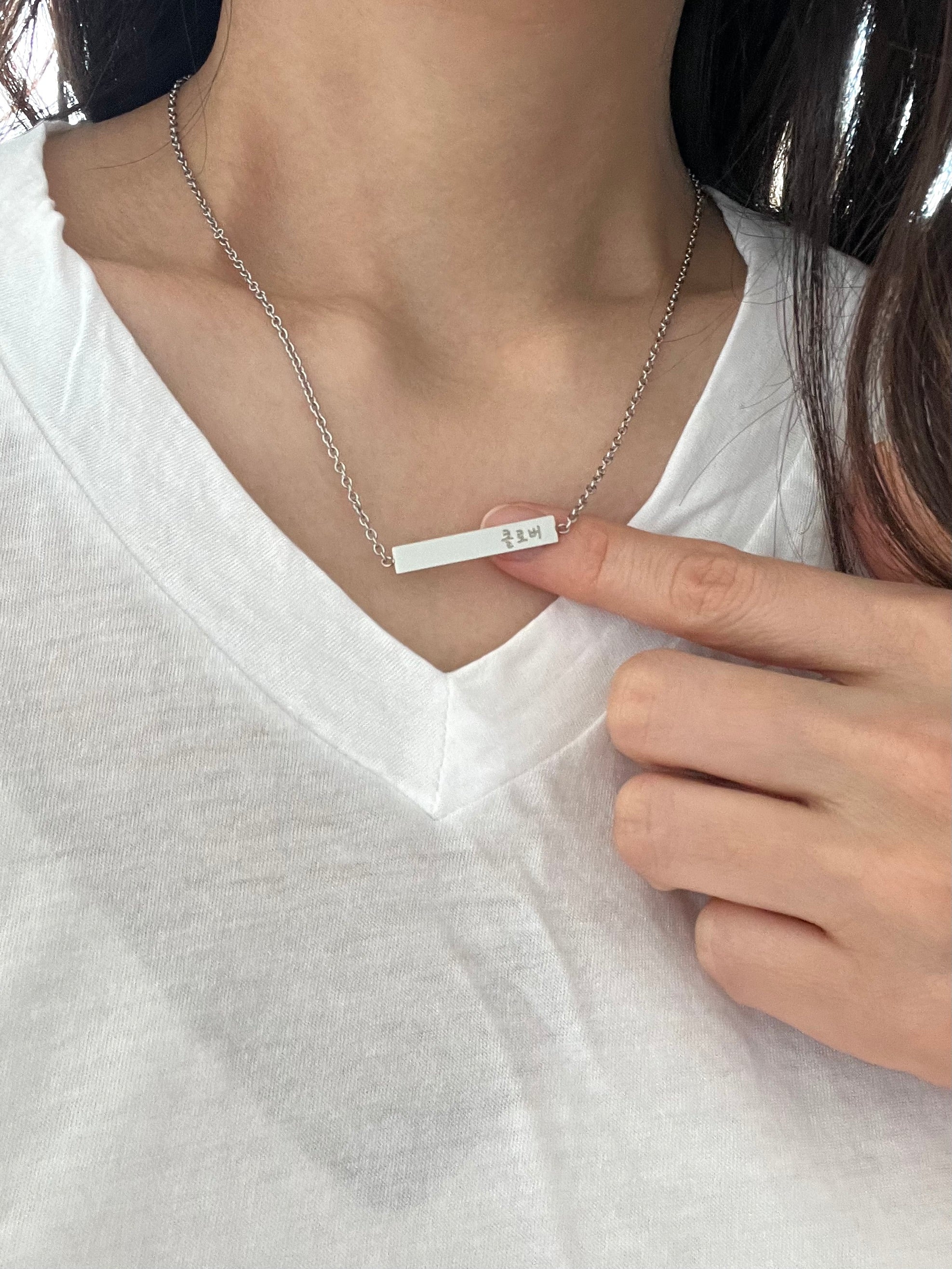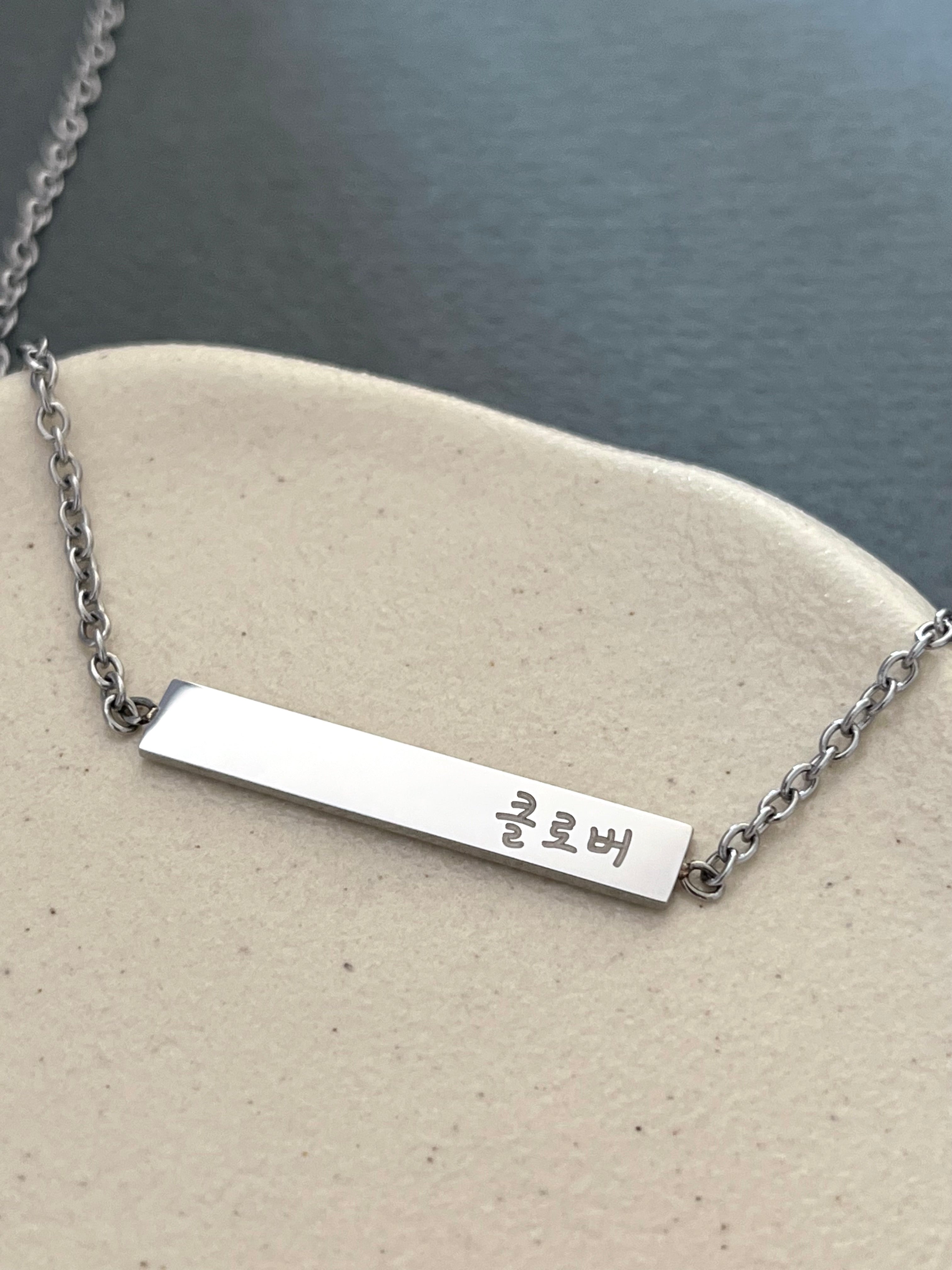 This is a personalized engraved Korean name bar necklace in stainless steel. Stainless steel jewelry is strong and almost never tarnish or corrode.