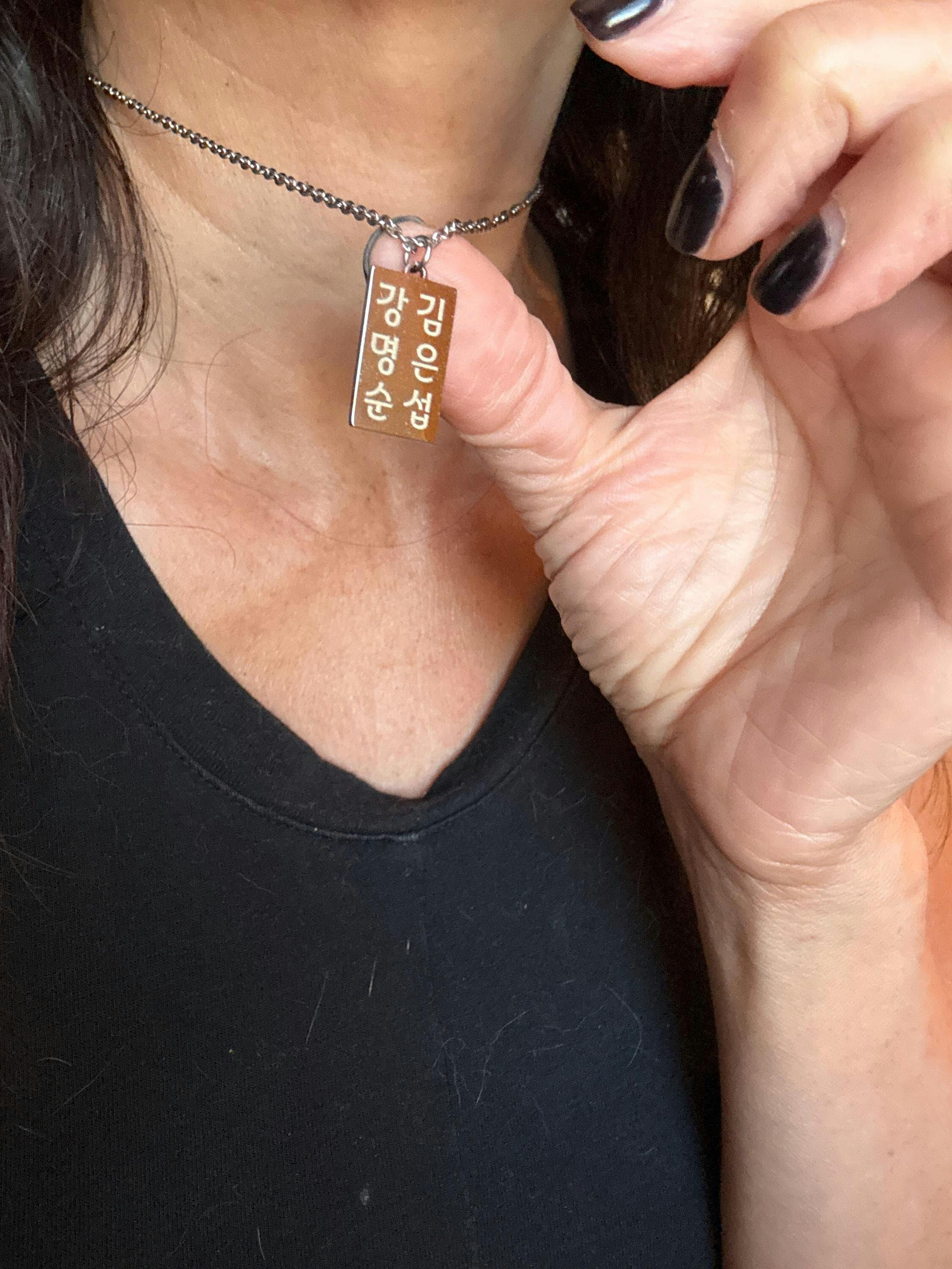 This is a personalized engraved Korean name tag necklace in stainless steel. Stainless steel jewelry is strong and almost never tarnish or corrode.