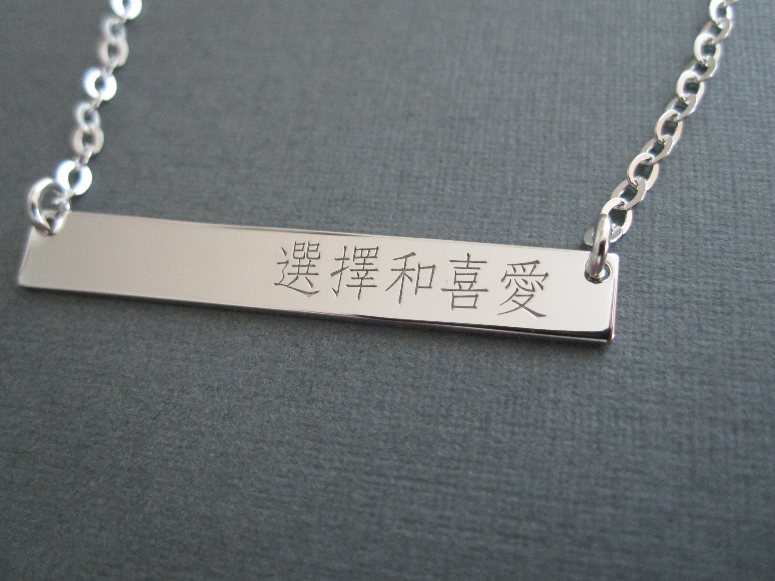 This is a personalized engraved Chinese name bar sterling silver necklace.