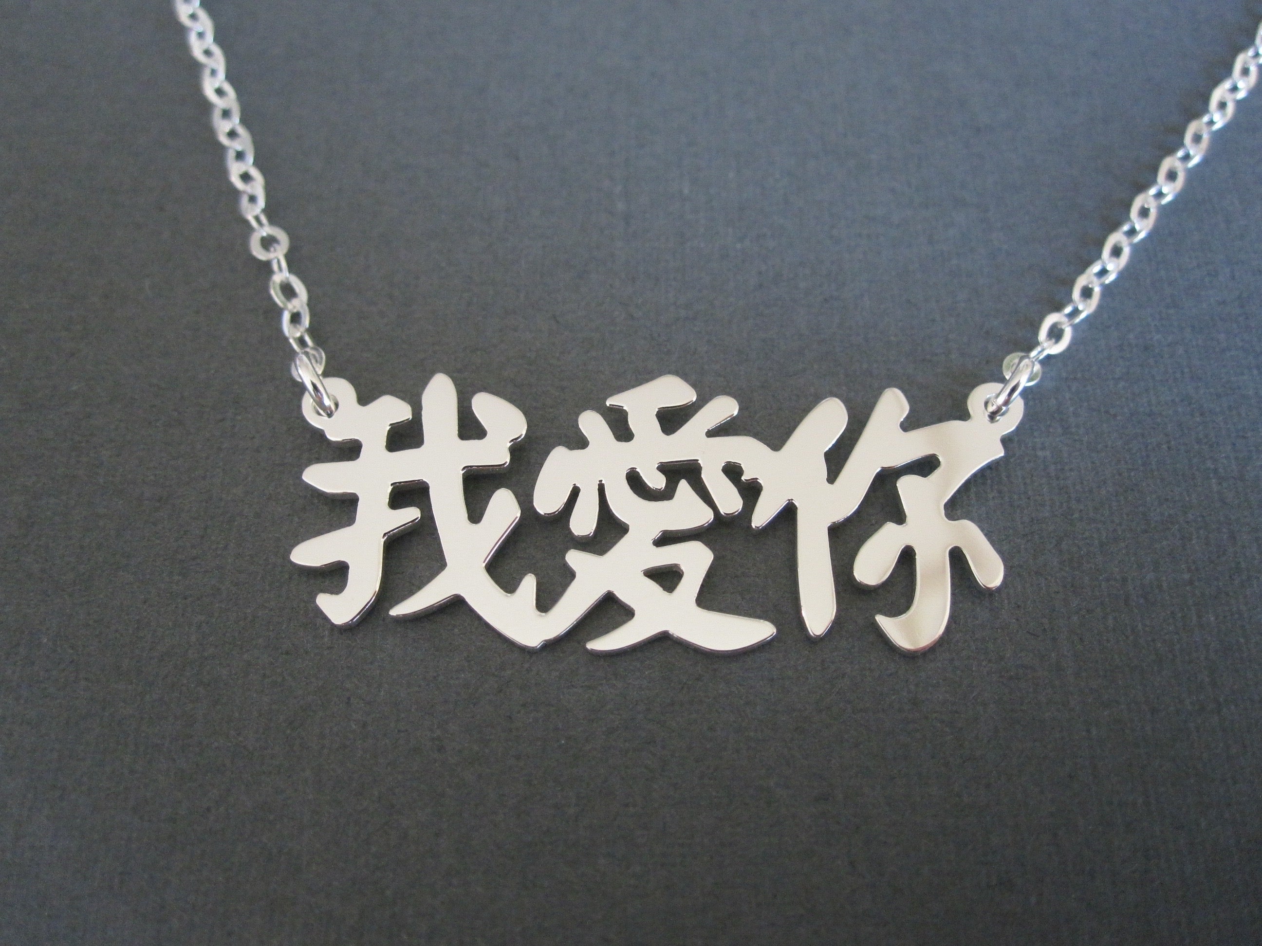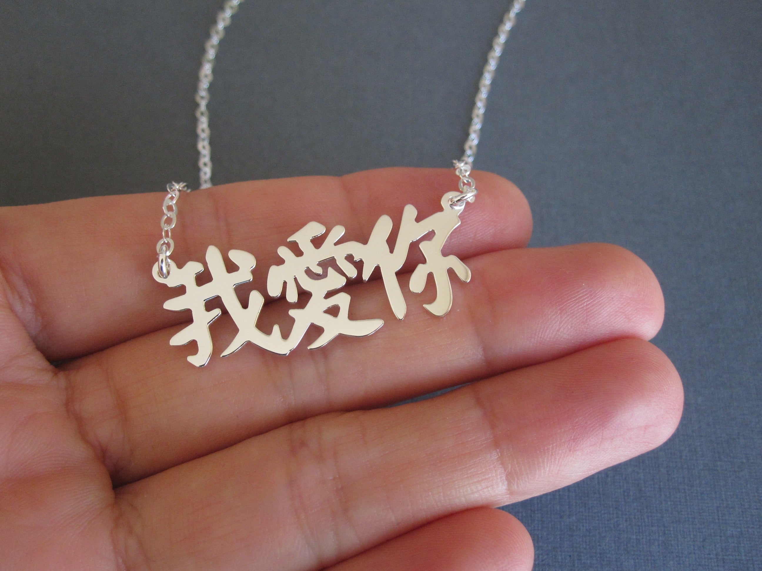 The sample necklace is made with I Love You in Chinese (3 characters) in the font style #3. Please check the font options in the pictures: fonts #3, 4, and 5 are written in Traditional Chinese only, and #6 is written in Simplified Chinese only. #1 and 2 is available for both Traditional and Simplified Chinese. Simplified Chinese will be used for the font #1 & 2 if you don't have a preference.