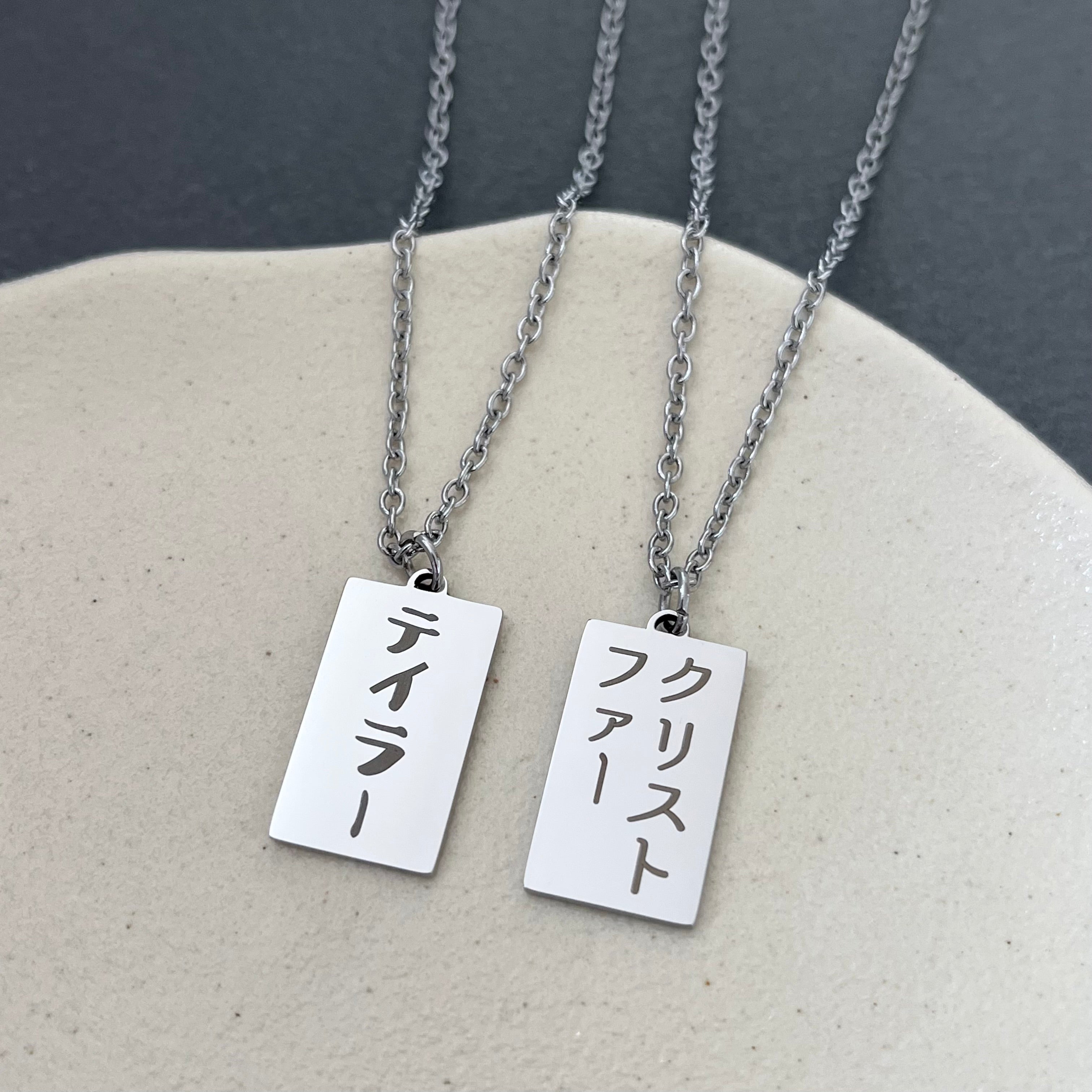 The necklace on the left has Taylor engraved in Japanese font #6, and the necklace on the right has Christopher engraved in Japanese font #5. Japanese is engraved vertically, and English is engraved horizontally as shown in the photos. If there are many characters, they are engraved in two or three lines.