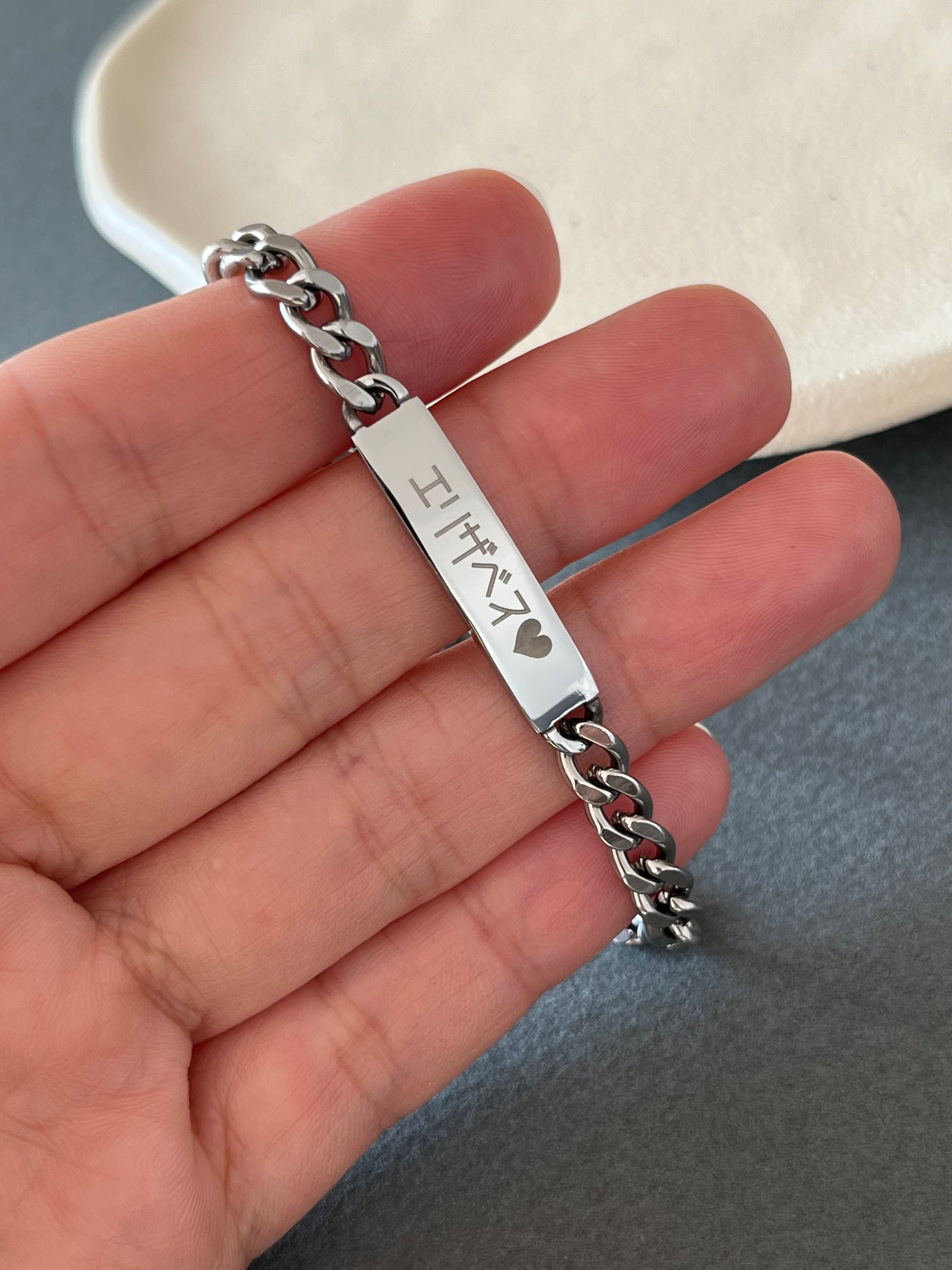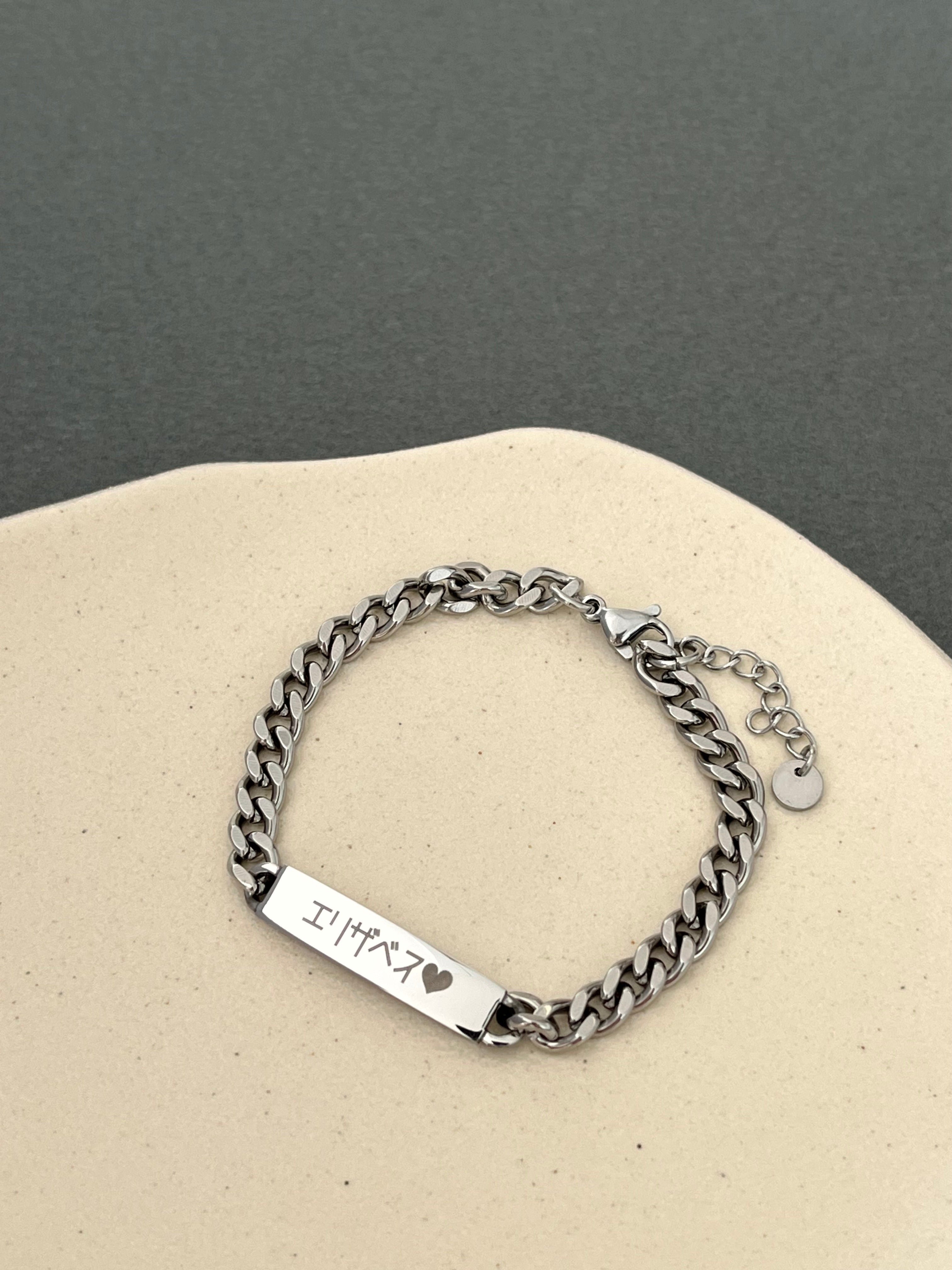 Personalisiertes graviertes japanisches Namensarmband aus mittelgroßem Edelstahl – japanischer Schmuck – Hiragana – Katakana – Kanji