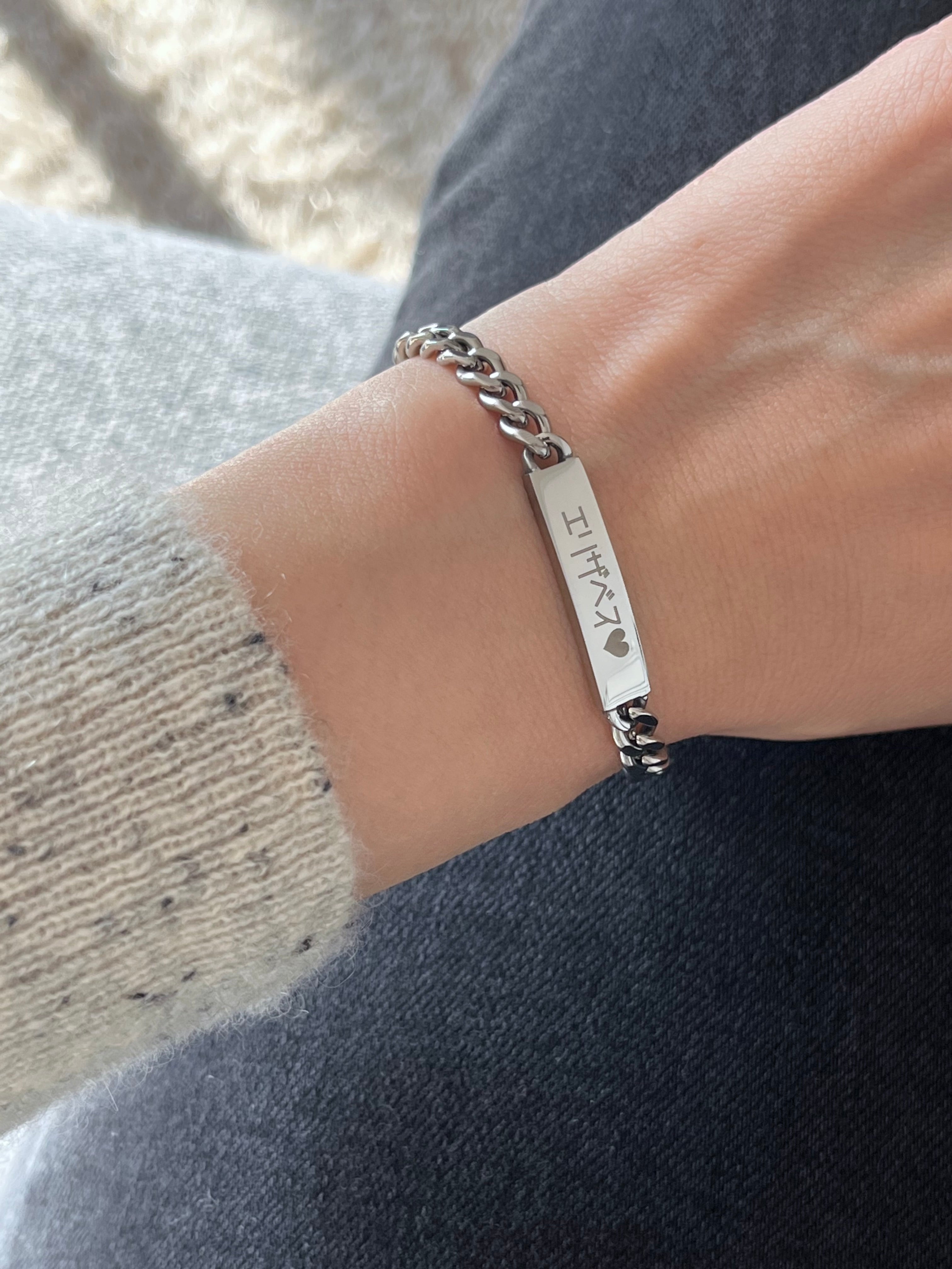 Dieses Angebot gilt für ein personalisiertes, graviertes, mittelgroßes Stabarmband aus Edelstahl mit japanischem Namen. Edelstahlschmuck ist robust und läuft fast nie an oder korrodiert.