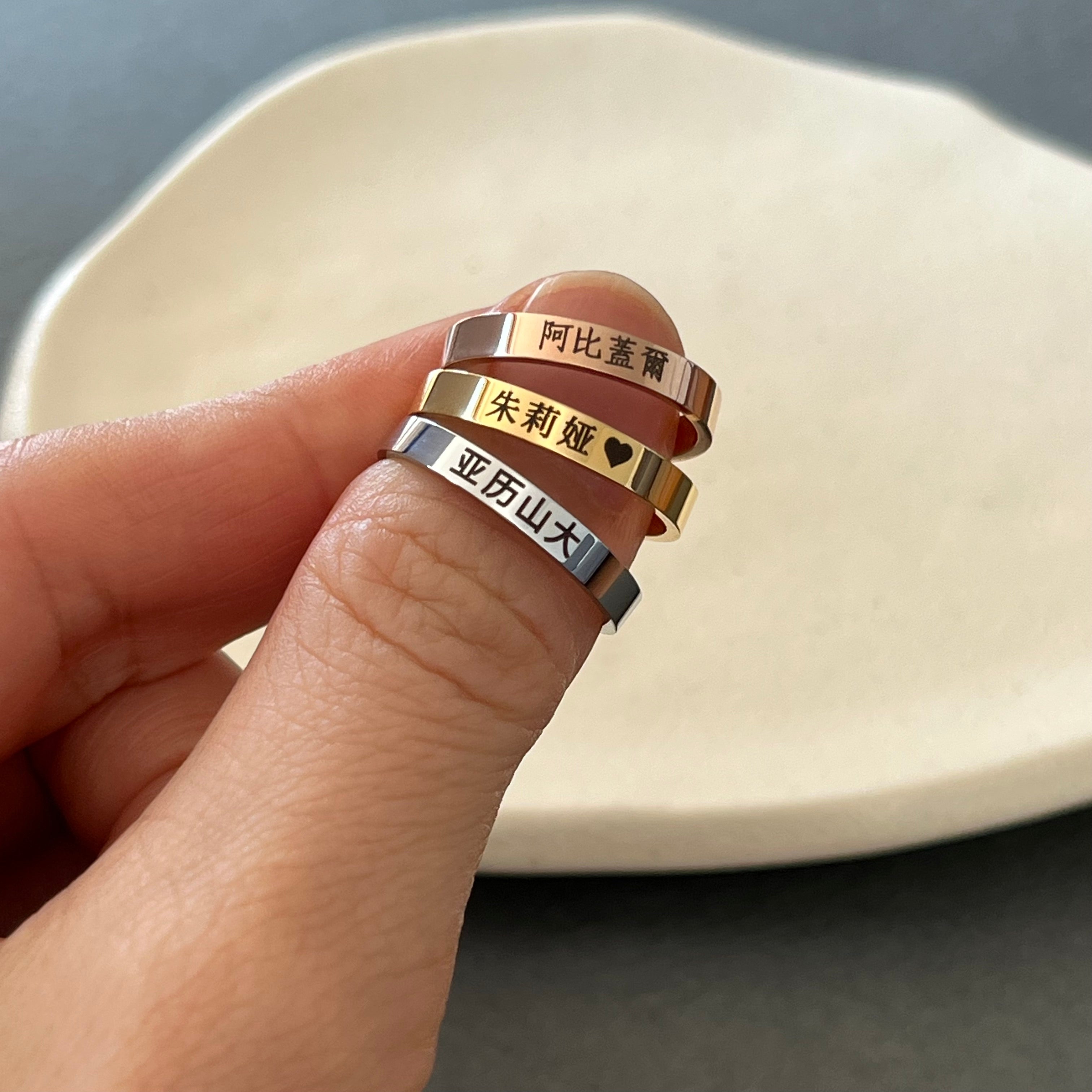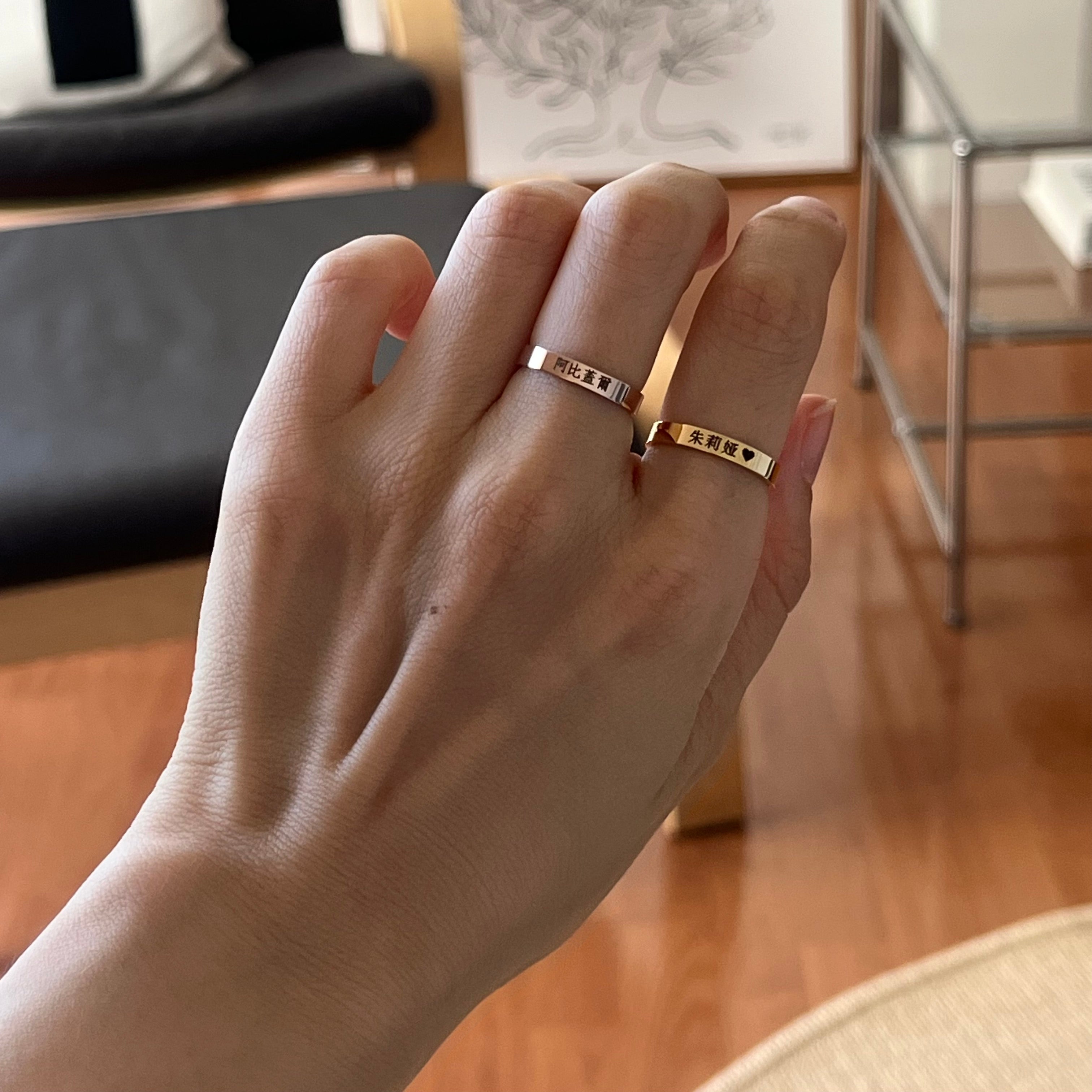 Dies ist ein personalisierter dunkel gravierter chinesischer Namensring aus Edelstahl.