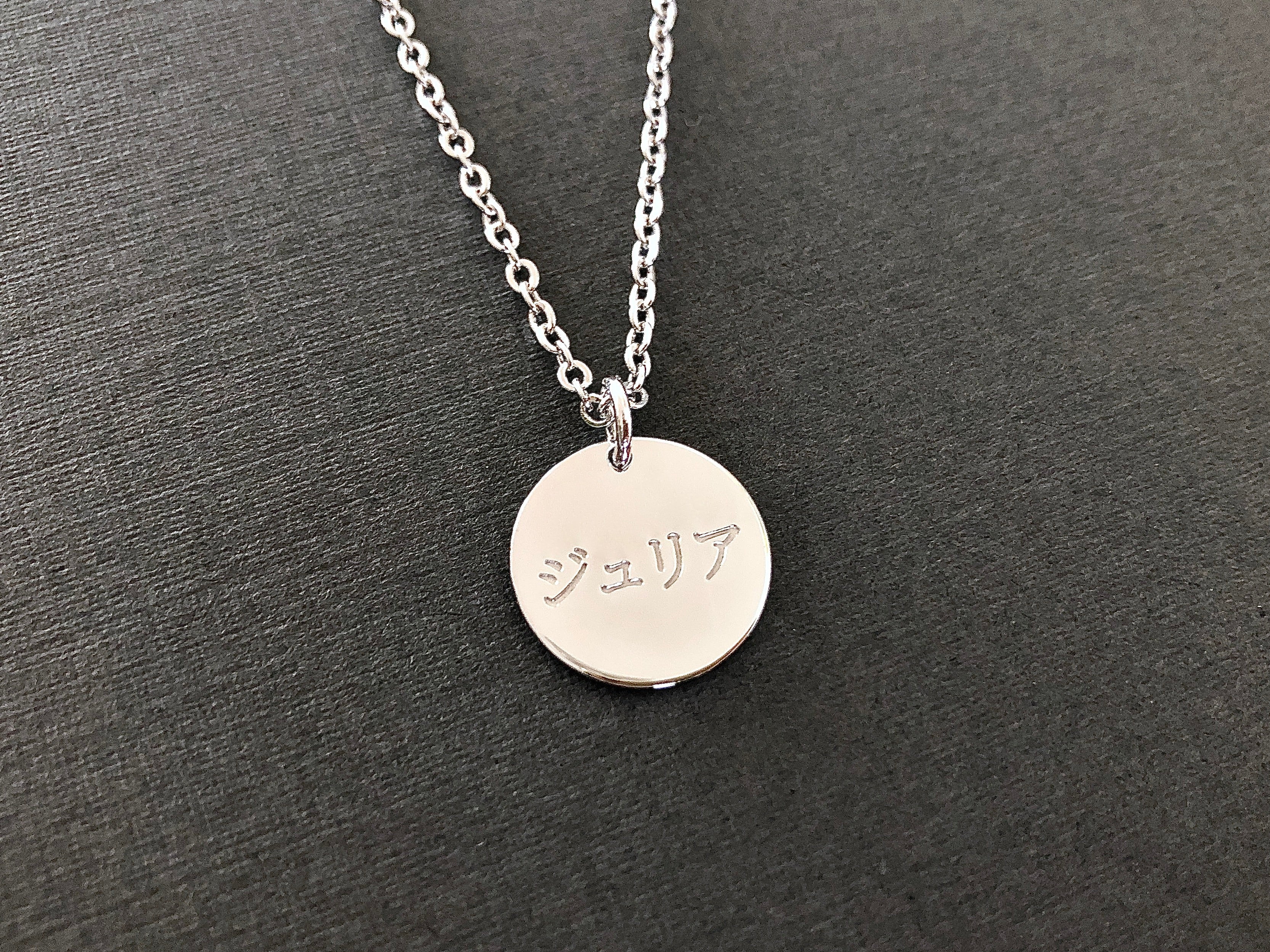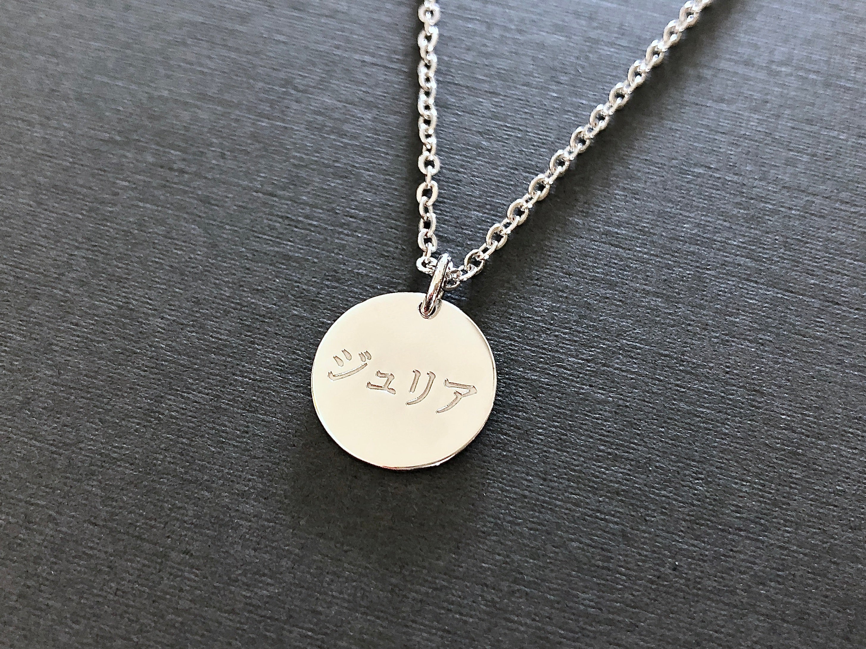 Halskette mit rundem Anhänger aus Sterlingsilber mit personalisierter Gravur und japanischem Namen – japanische Schriftzeichen – Hiragana – Katakana – Kanji – japanische Geschenke