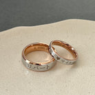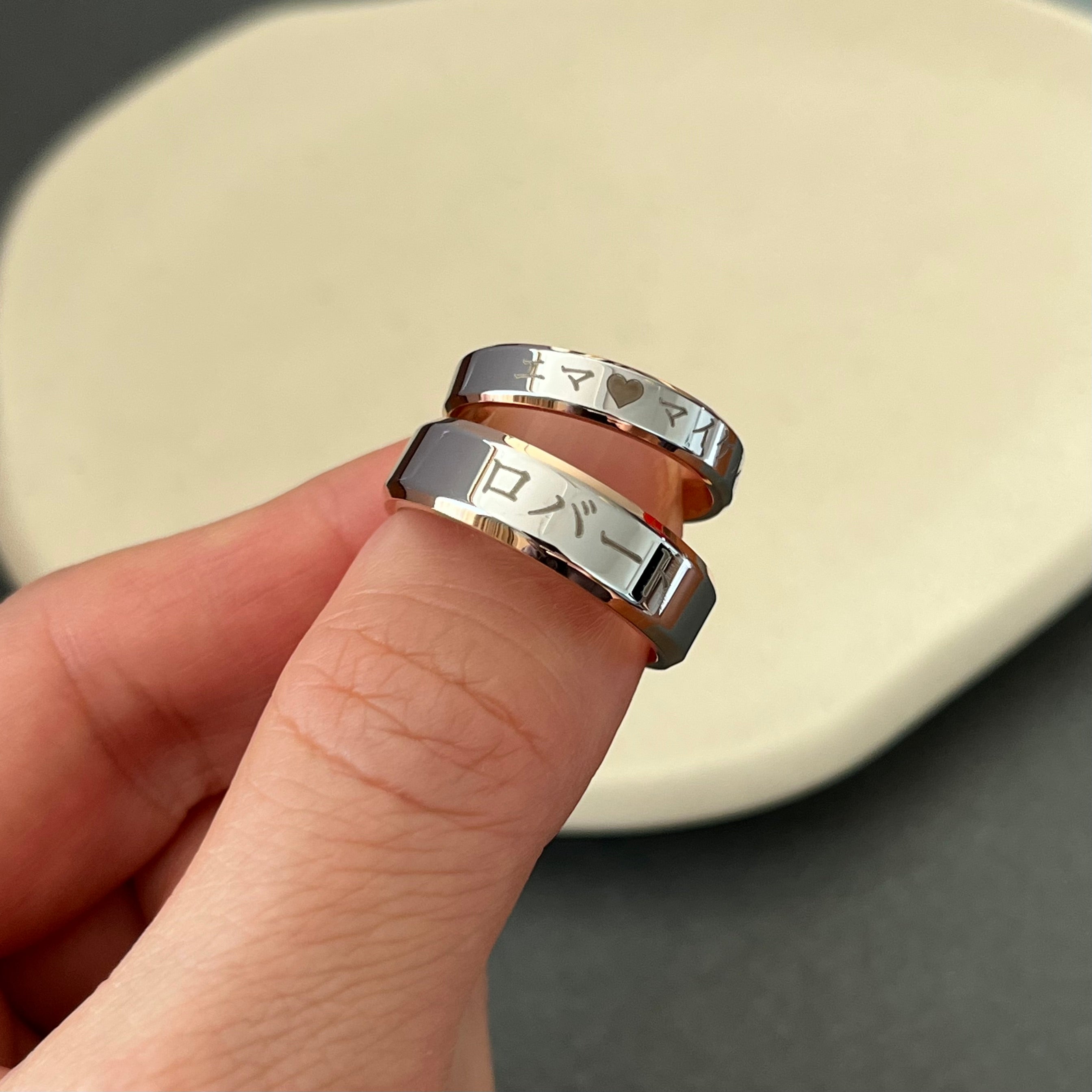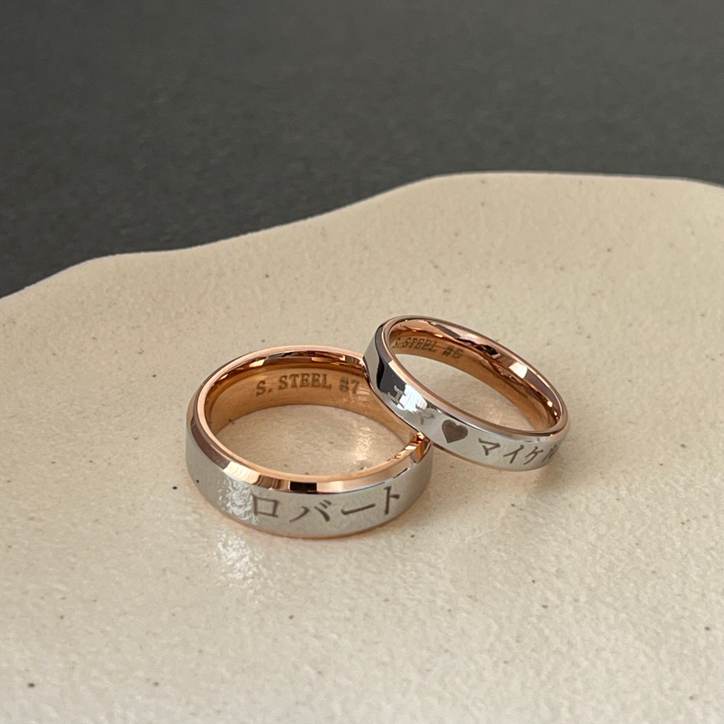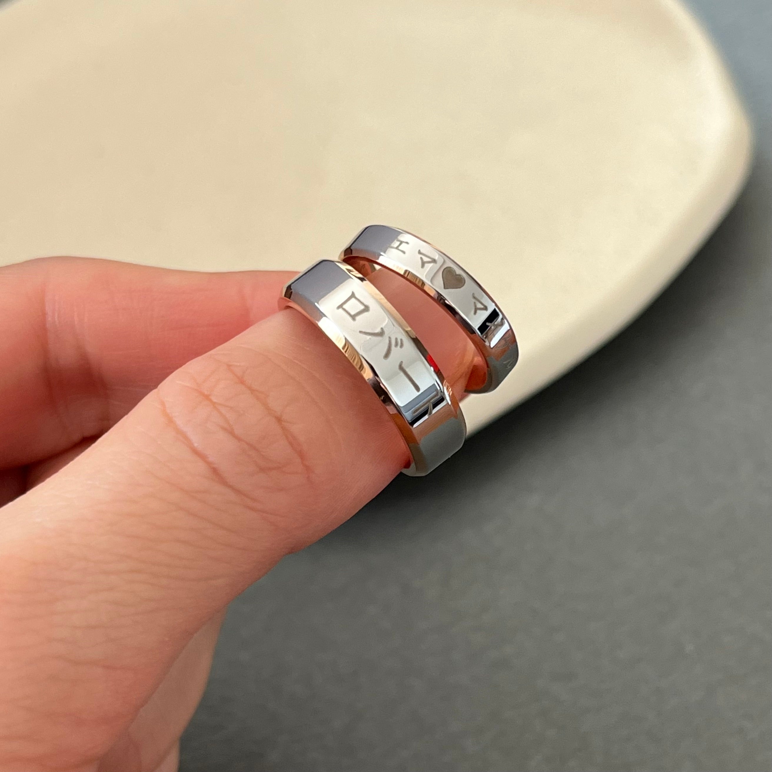 Personalisierte japanische Namensringe aus Edelstahl in zweifarbiger Rose und Silber - Individuelle japanische Paarringe - Japanische Eheringe