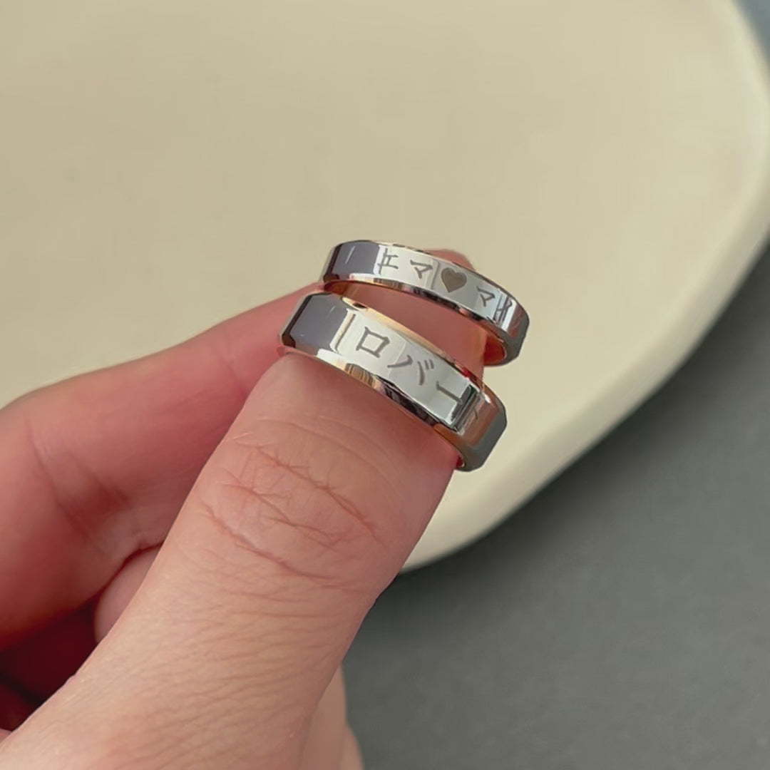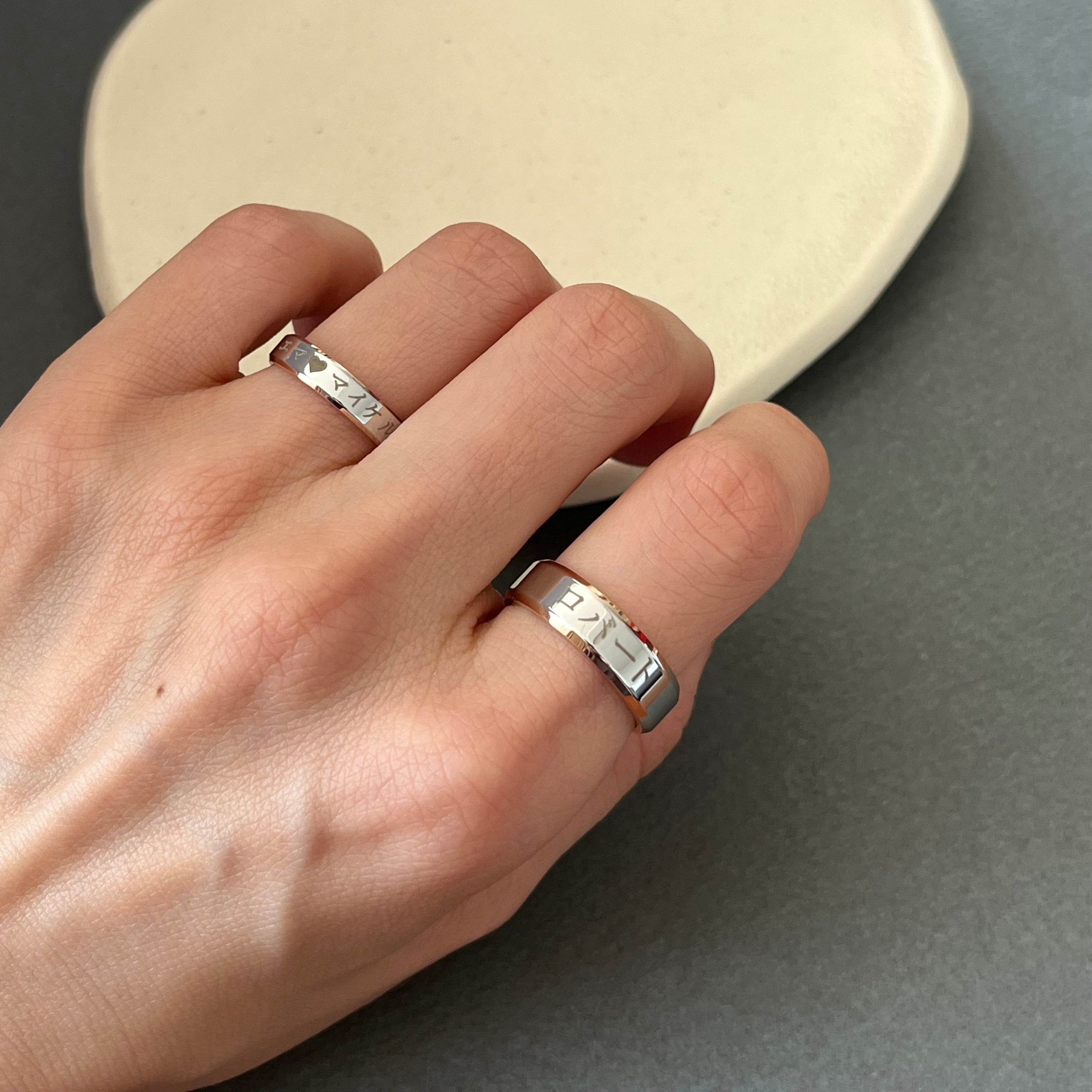 Auf dem dünneren Ring sind Emma und Michael auf Japanisch sowie ein Herz zwischen den Namen eingraviert. Auf dem dickeren Ring ist „Robert“ auf Japanisch eingraviert. Beide Ringe sind im Schriftstil #2.