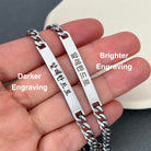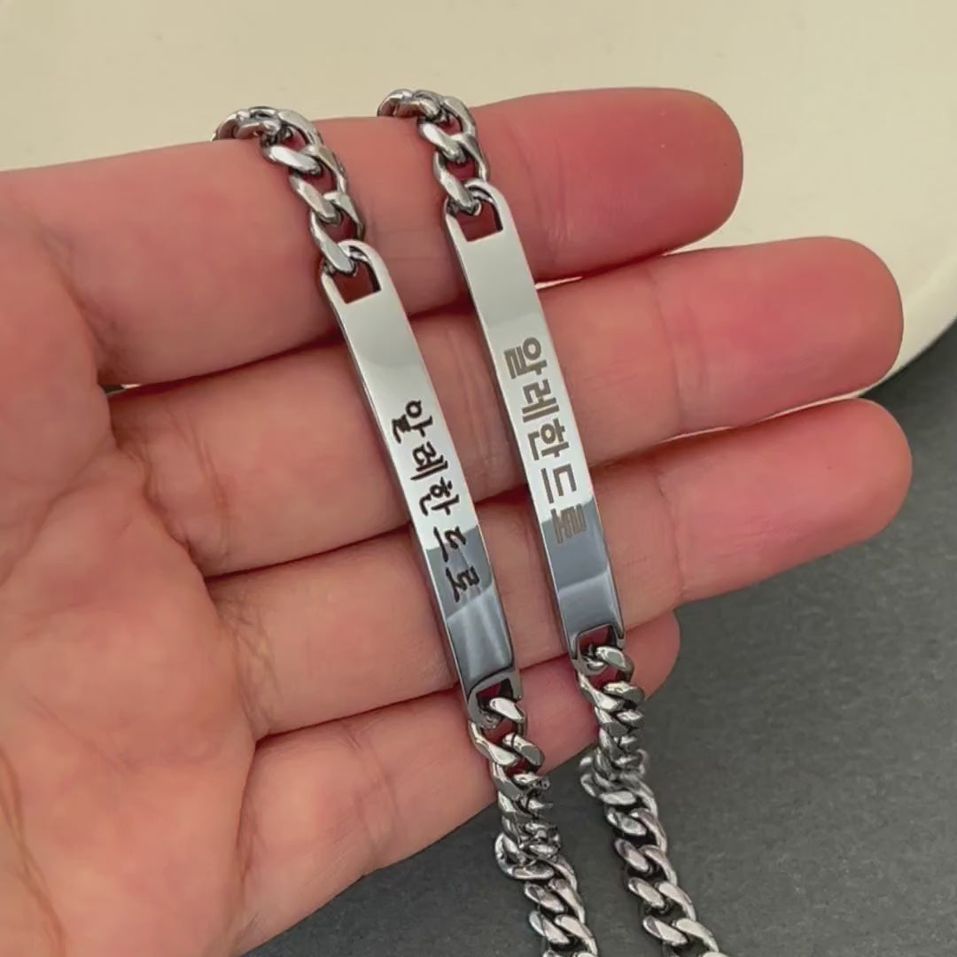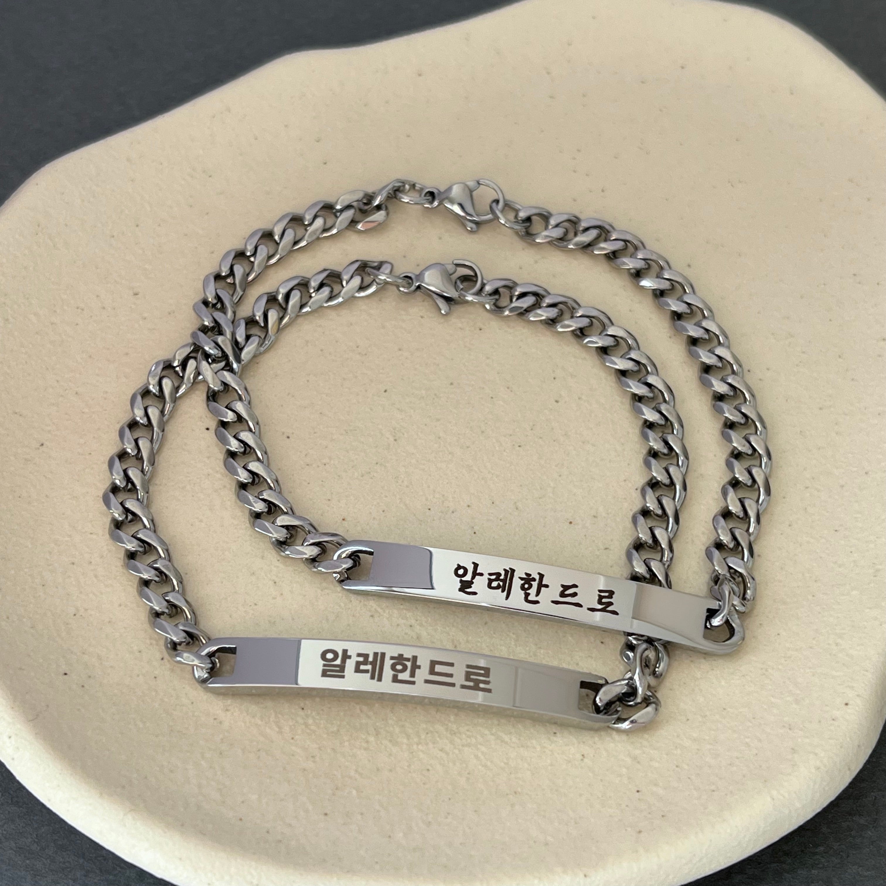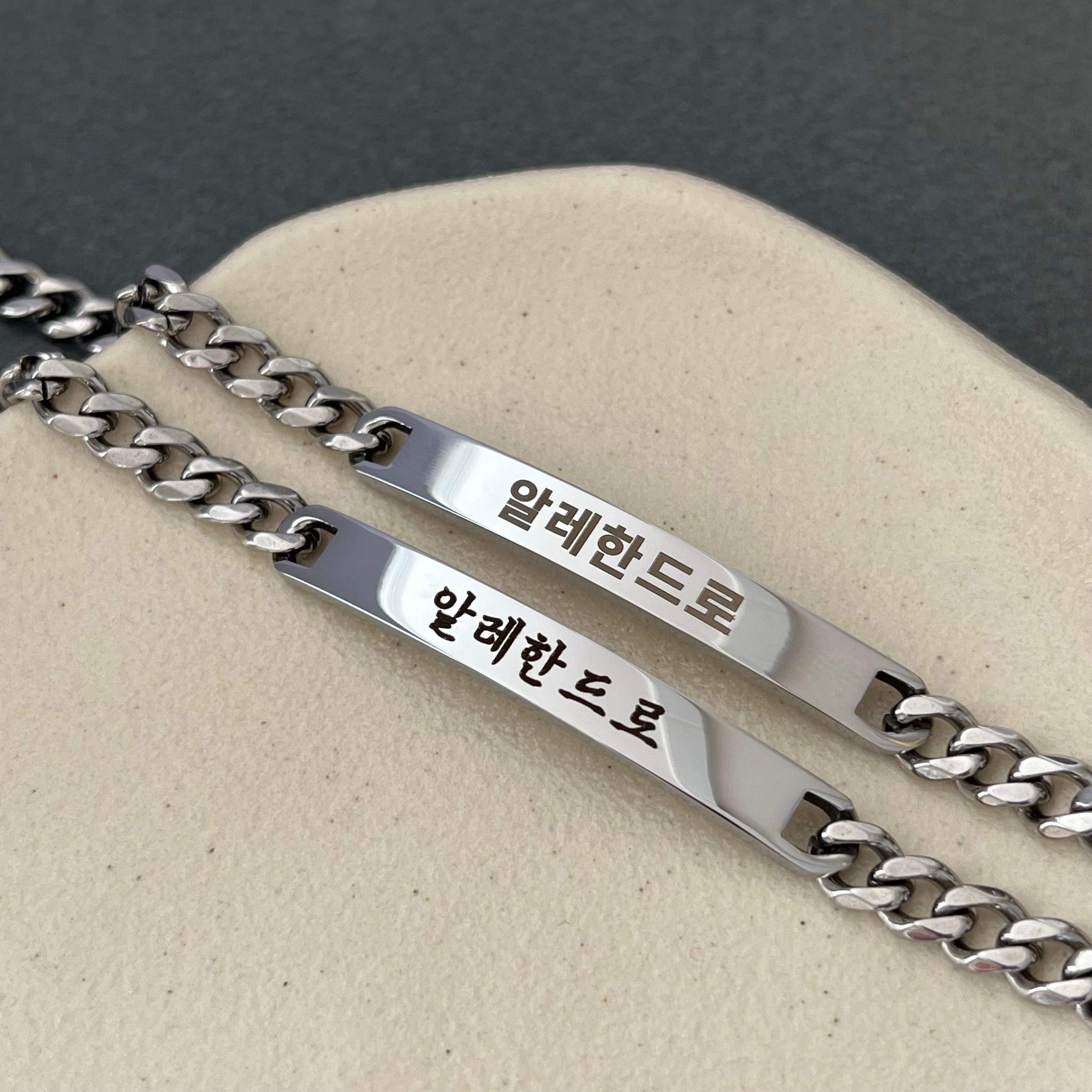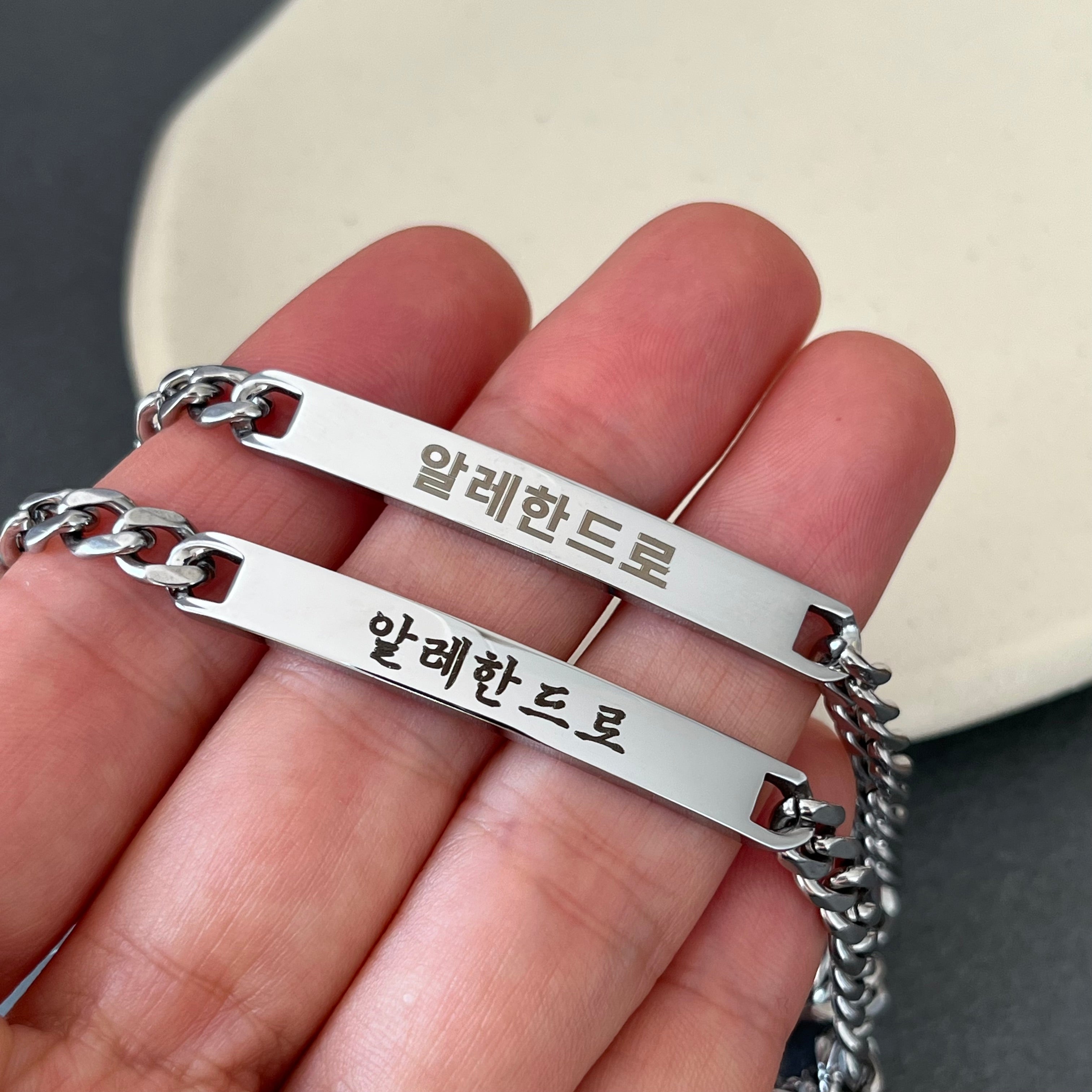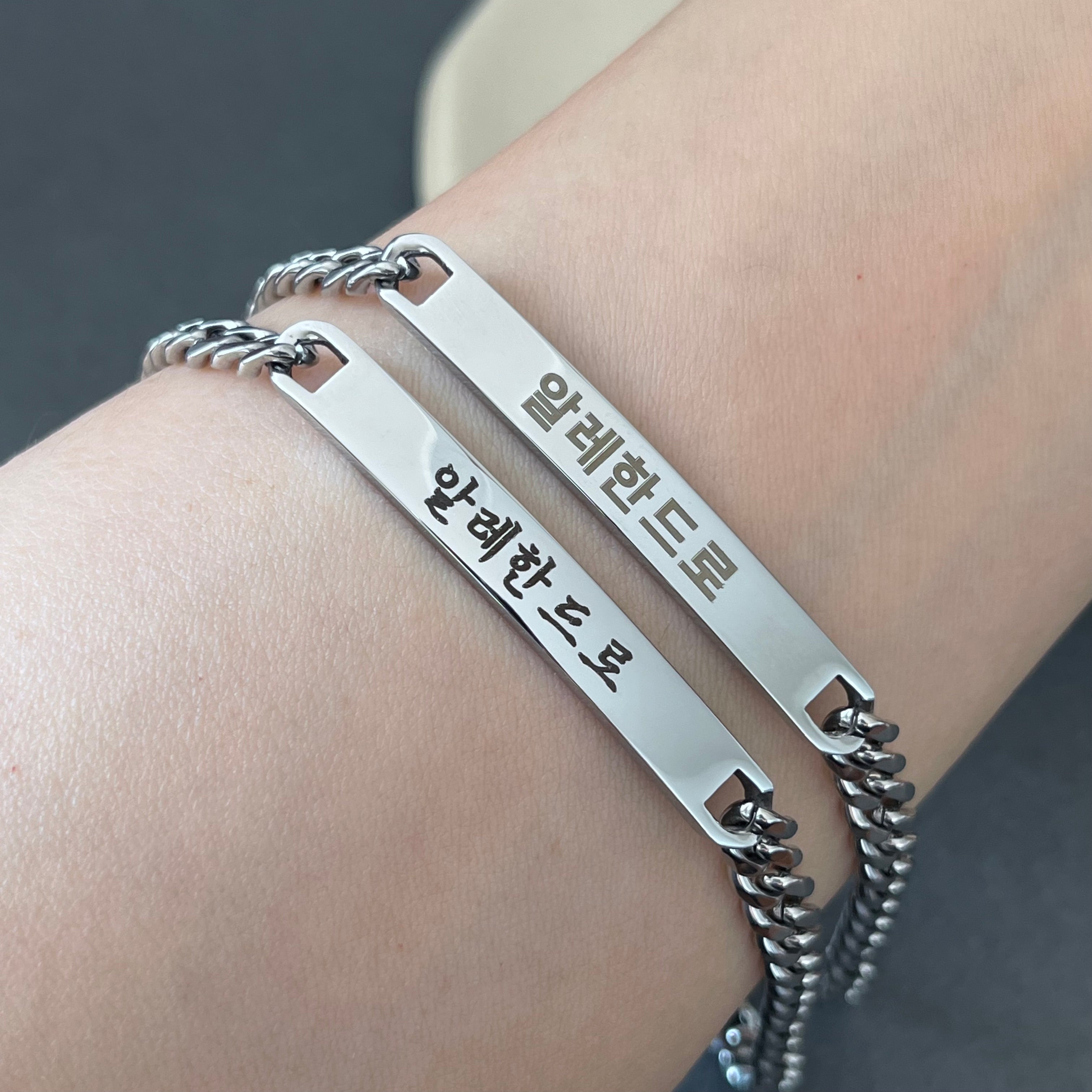 Beide Armbänder sind mit dem koreanischen Namen „Alejandro“ in der Schriftart #1 (hellere Gravur) und #8 (dunklere Gravur) graviert. Bitte überprüfen Sie die Schriftartoptionen in den Bildern.