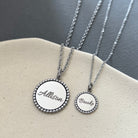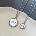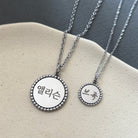 Dies ist eine personalisierte Halskette mit einem runden koreanischen Namensanhänger und Verzierungen aus Edelstahl. Edelstahlschmuck ist robust und läuft oder korrodiert so gut wie nie.