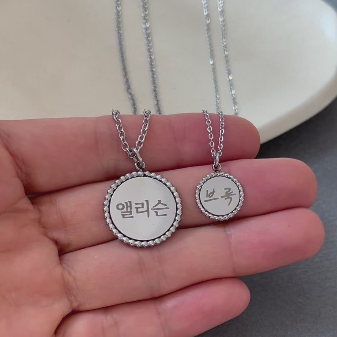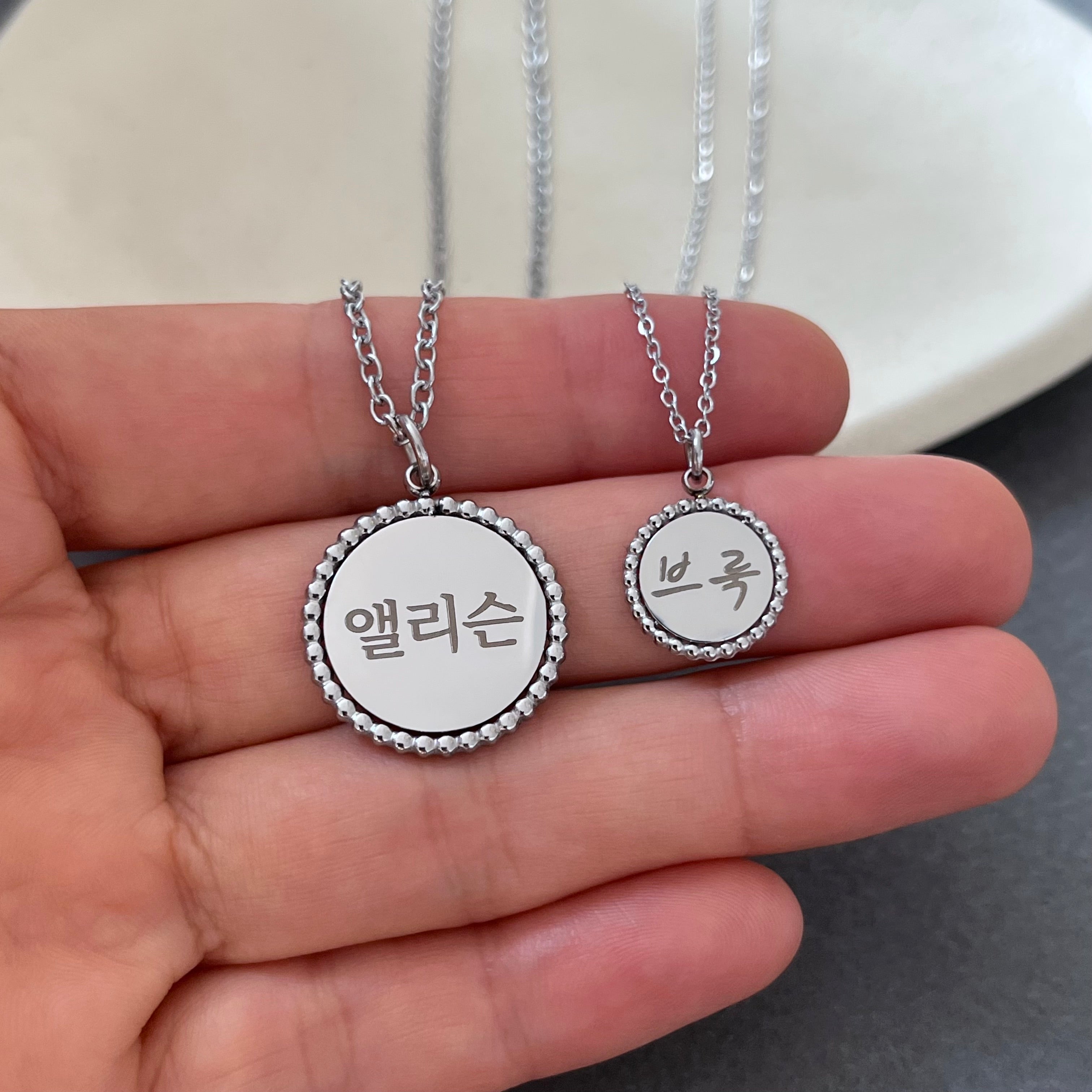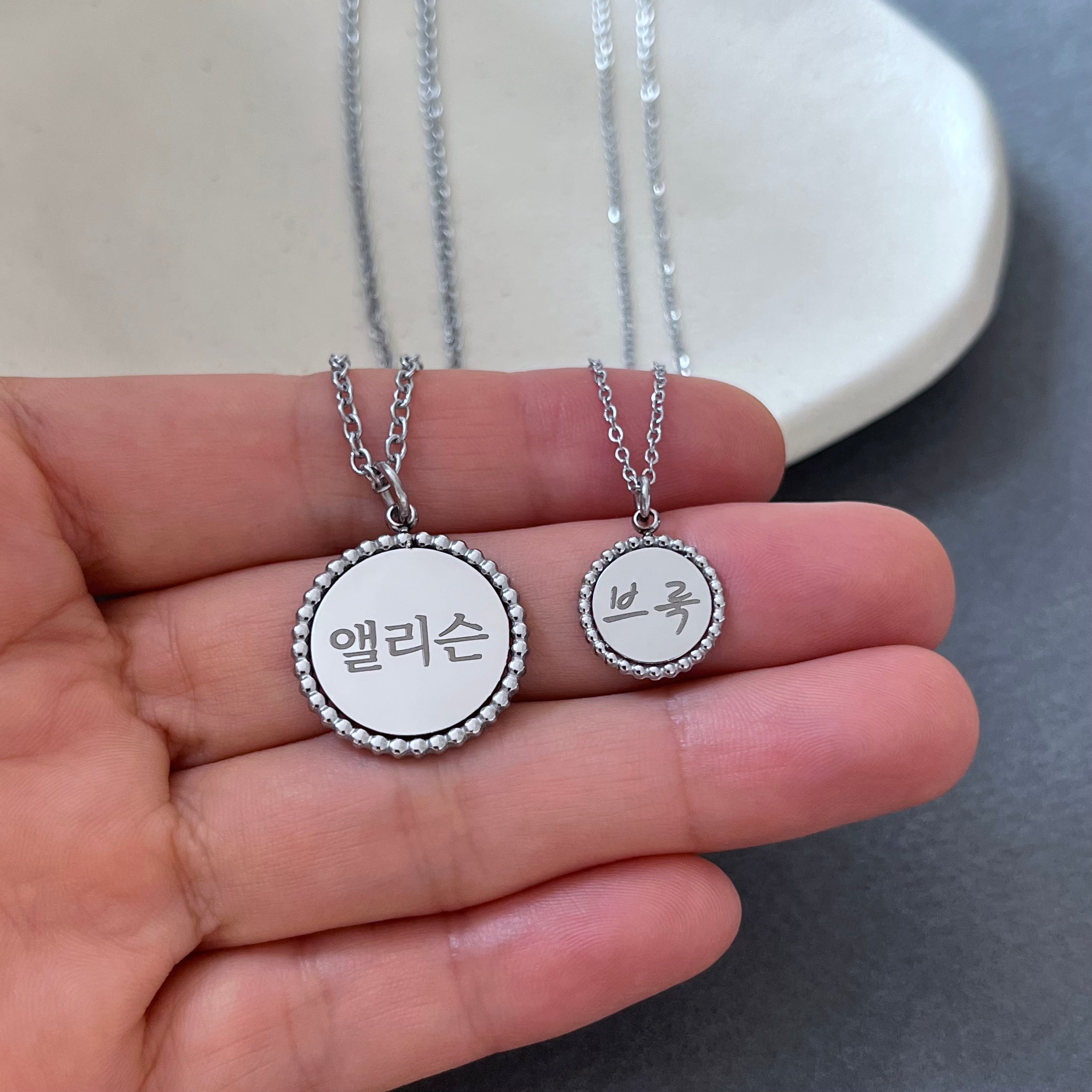 Personalisierter runder Anhänger mit graviertem koreanischem Namen und Verzierungen aus Edelstahl in 2 Anhängergrößen – Korea-Schmuck – Hangul