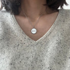 Die Anhänger sind in zwei Größen erhältlich: 10 mm und 16 mm. Die schmalere Kette ist 45 cm lang und verfügt über eine 5 cm lange Verlängerungskette. Die dickere Kette ist in verschiedenen Längen erhältlich. Das Model trägt eine schmalere 45 cm lange Kette mit Verlängerungskette und eine dickere 40 cm lange Kette.