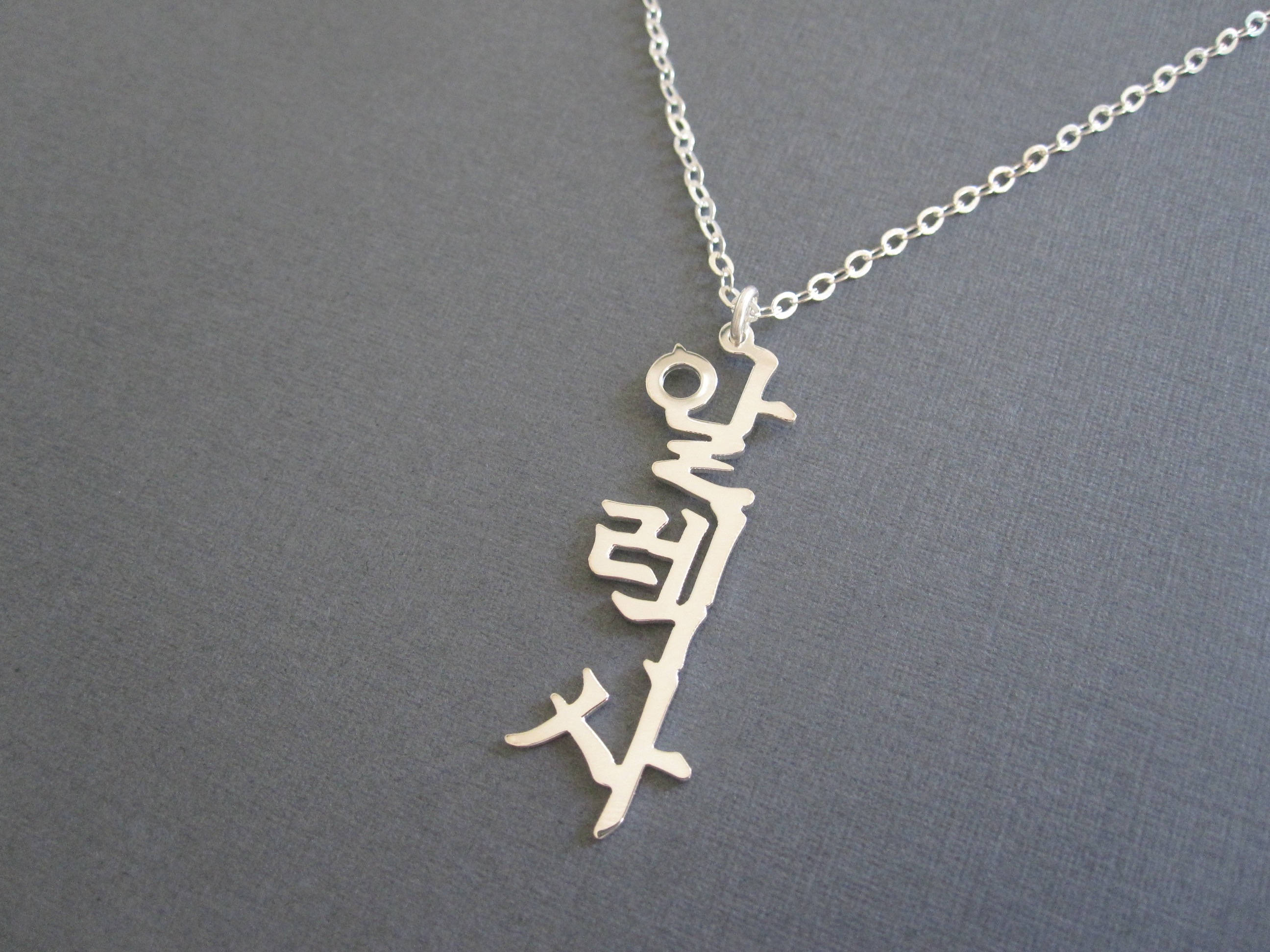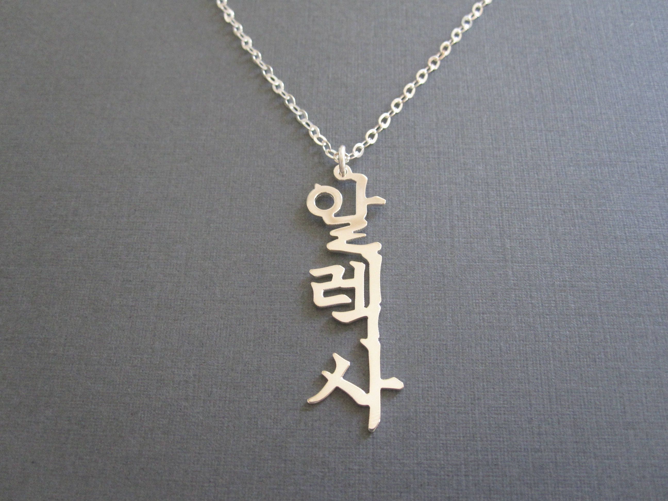 Die Beispielhalskette wurde mit Alexa auf Koreanisch (3 Zeichen) im Schriftstil Nr. 8 hergestellt. Bitte überprüfen Sie die Schriftartoptionen in den Bildern. 3 oder 4 koreanische Zeichen werden etwa 3 cm (1,2 Zoll) bis 4 cm (1,6 Zoll) lang hergestellt. 1 oder 2 Zeichen werden kürzer sein. Das Modell trägt eine 42 cm (16,5 Zoll) lange Halskette.