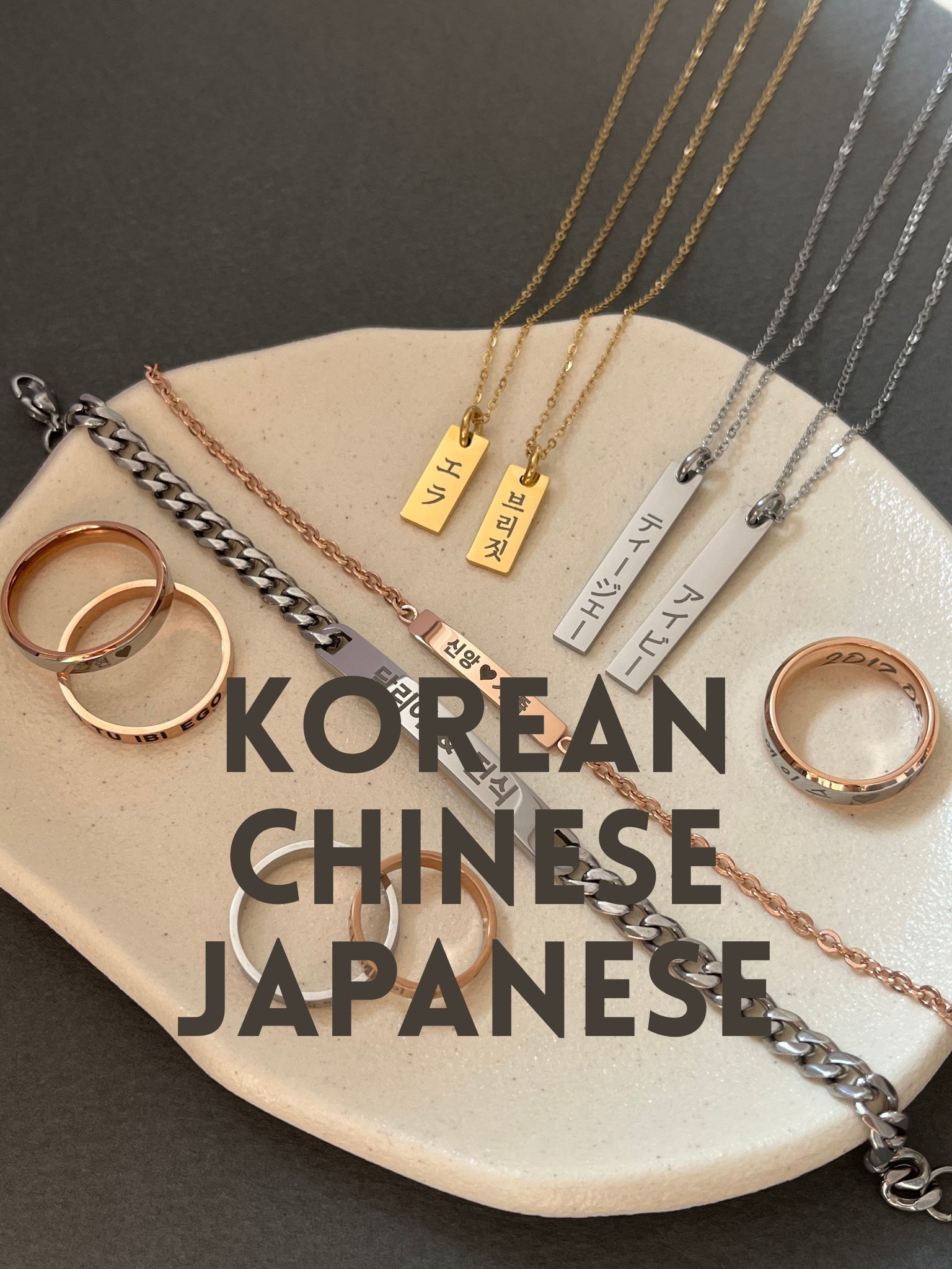 Personalisierter Namensschmuck in koreanischen, chinesischen, japanischen und römischen Alphabeten - individueller Namensschmuck