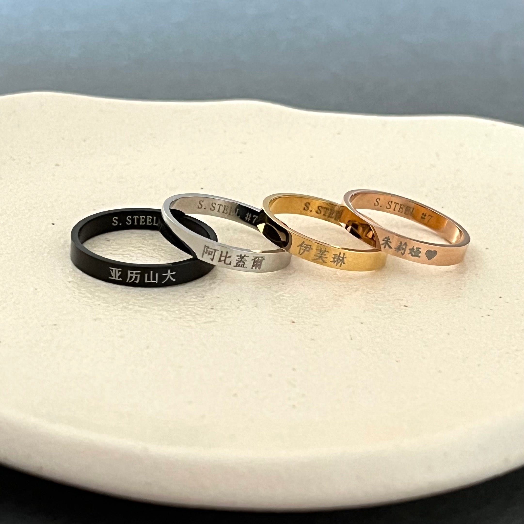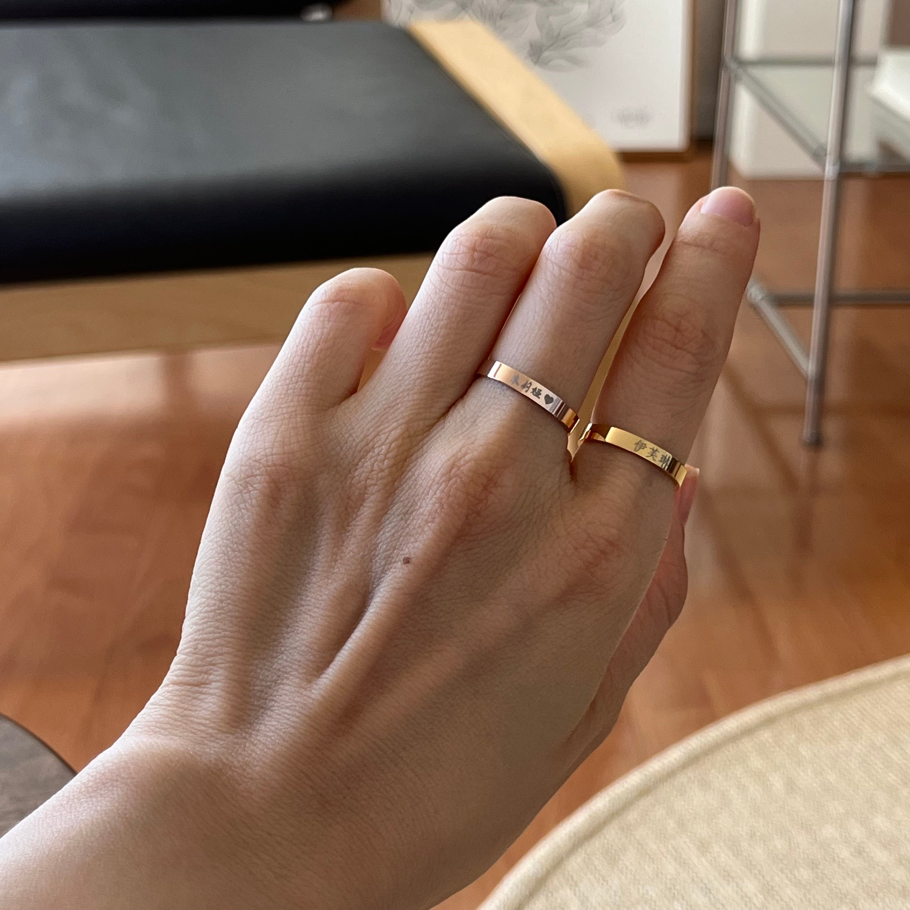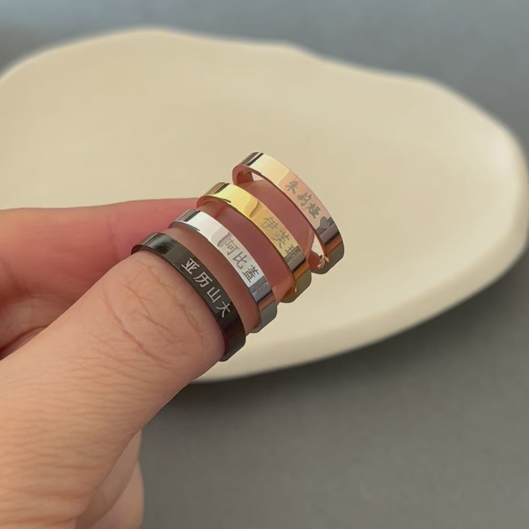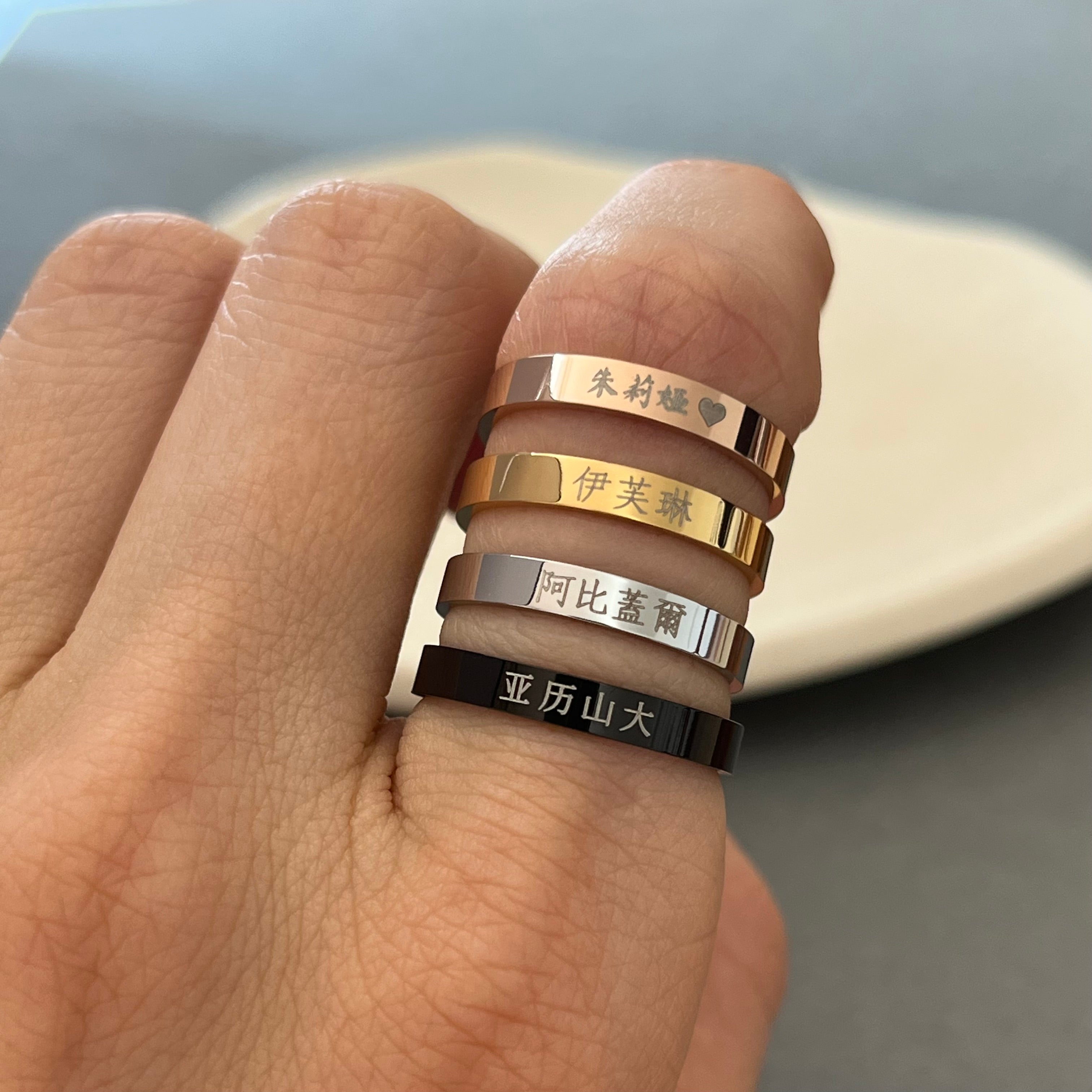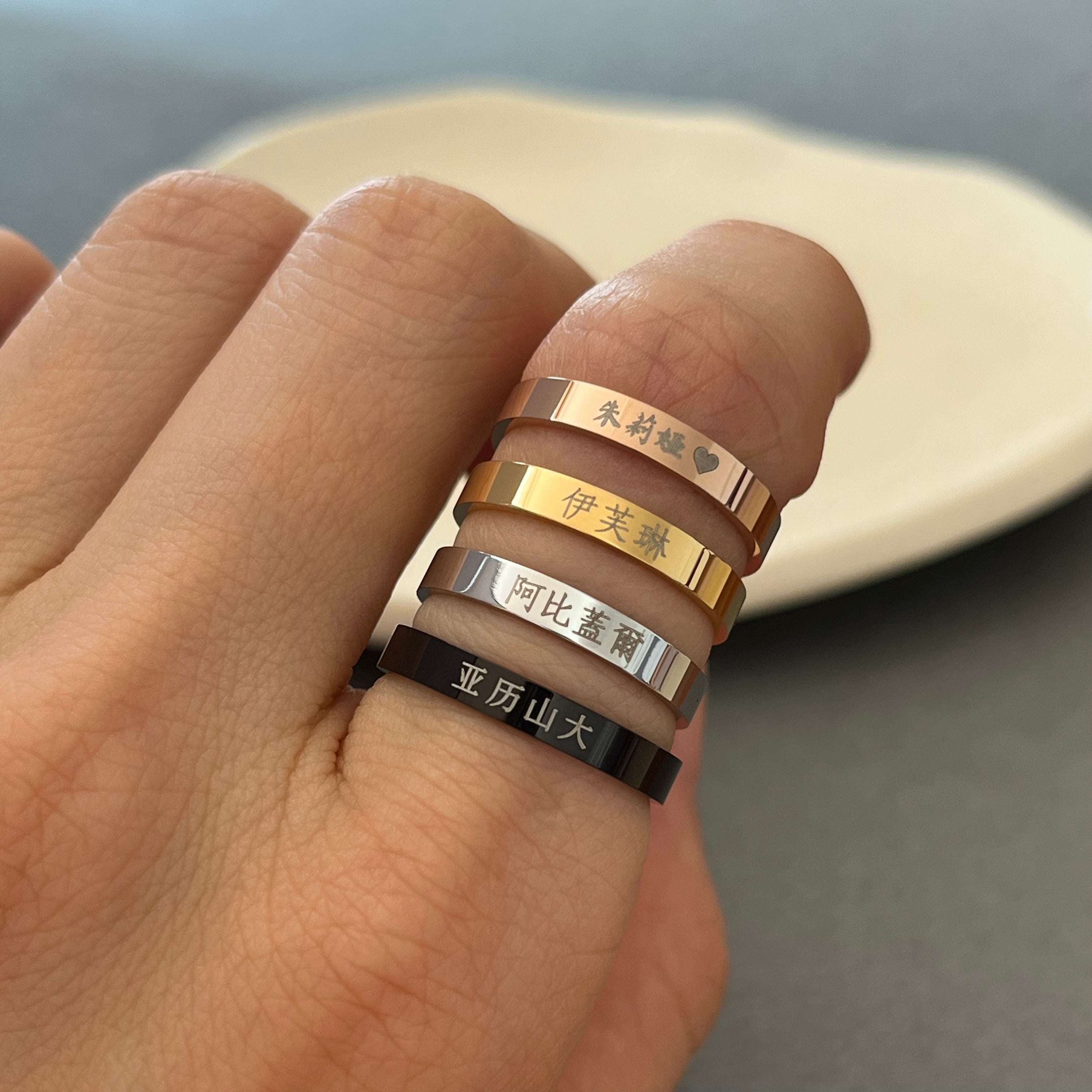Dies ist ein personalisierter, gravierter chinesischer Namensring aus Edelstahl.