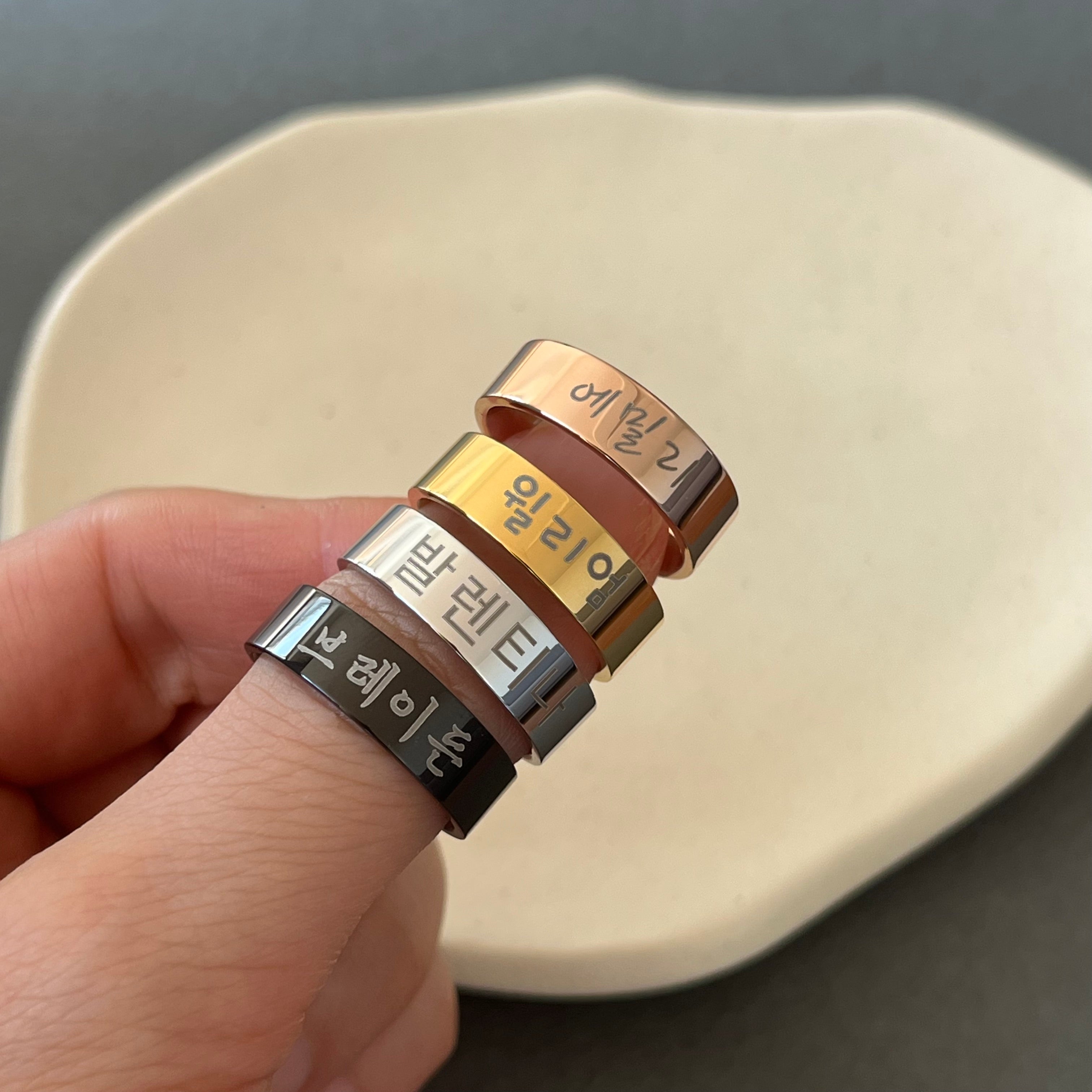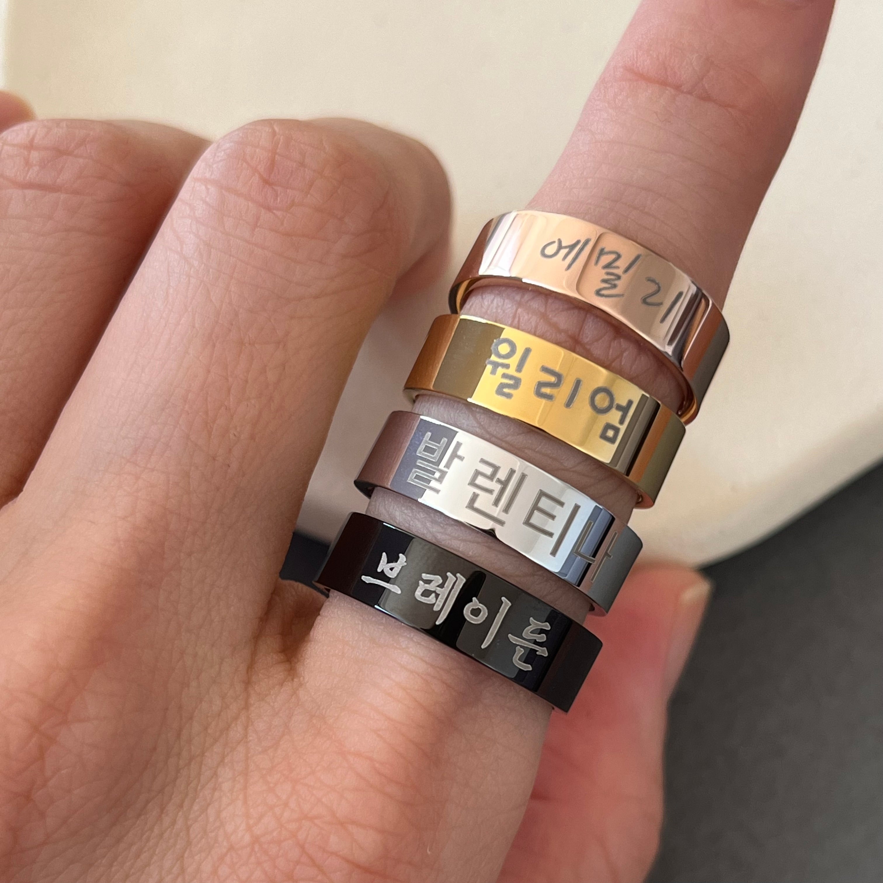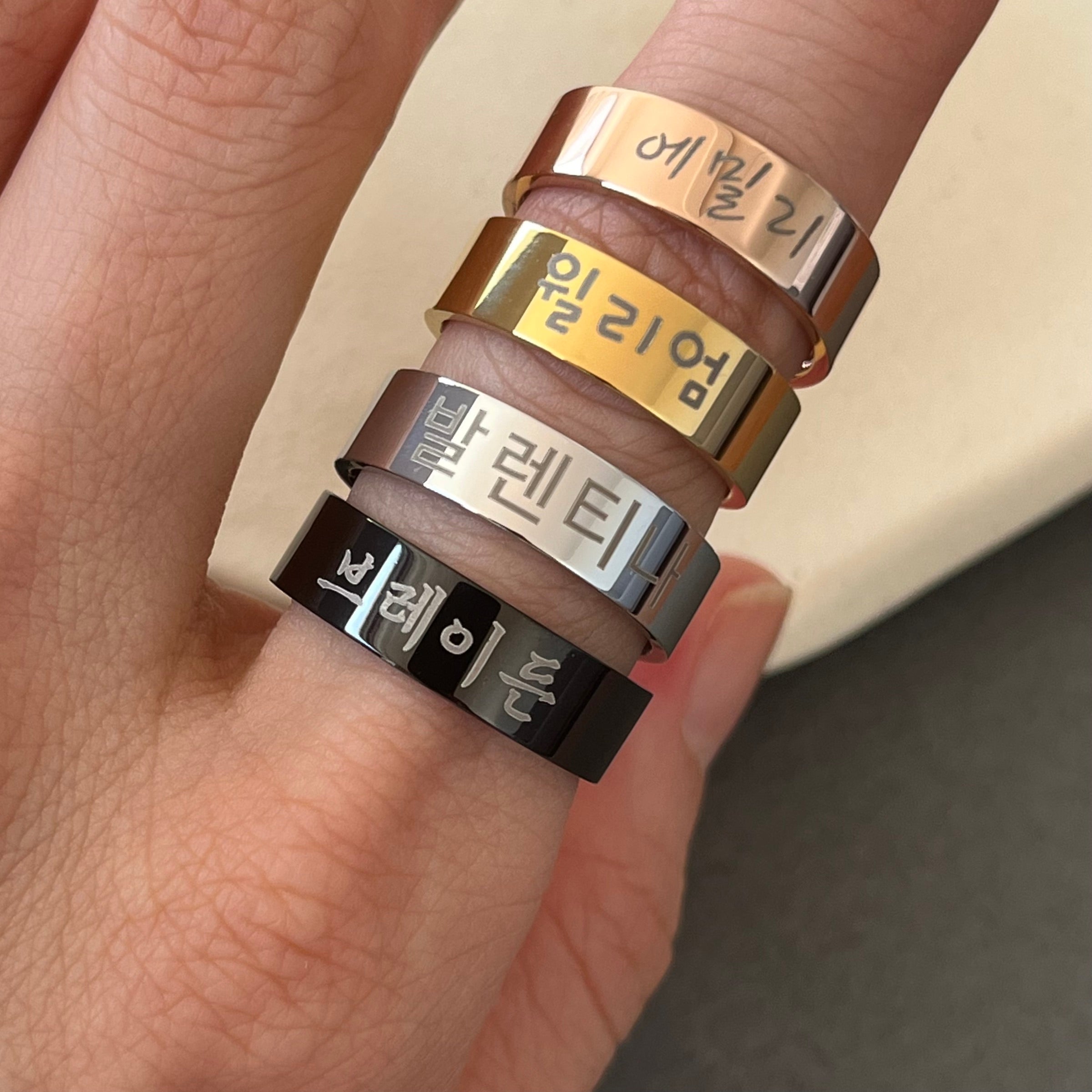 Il s'agit d'une bague avec nom coréen gravé personnalisé en acier inoxydable.