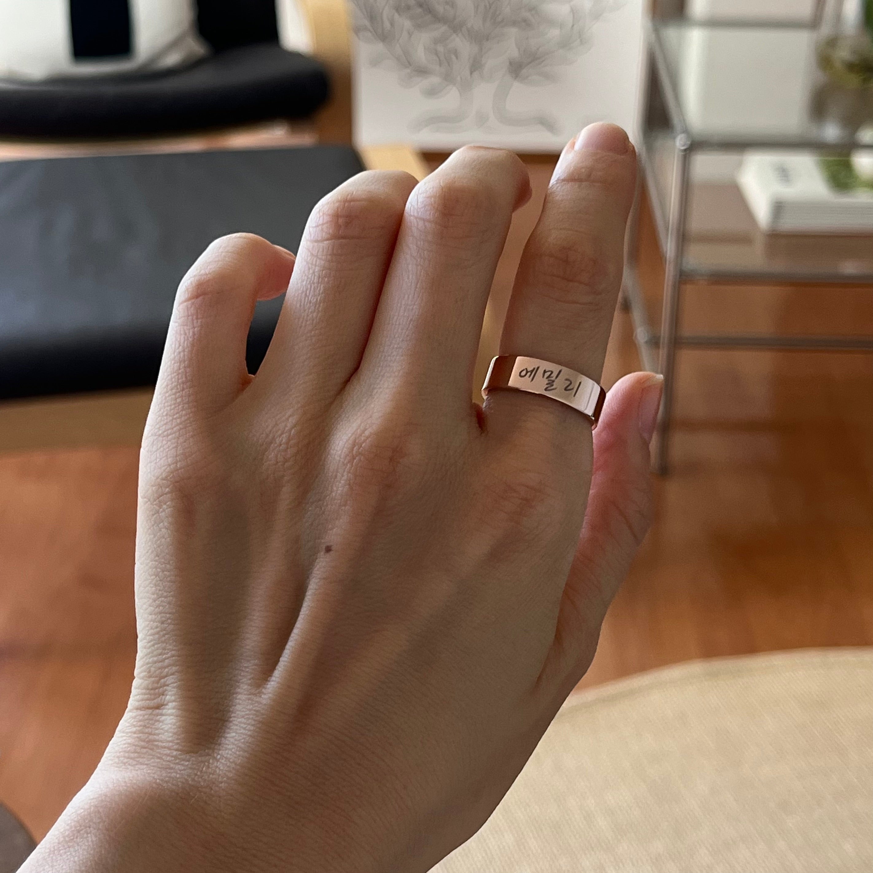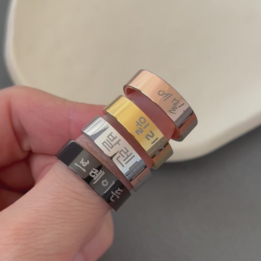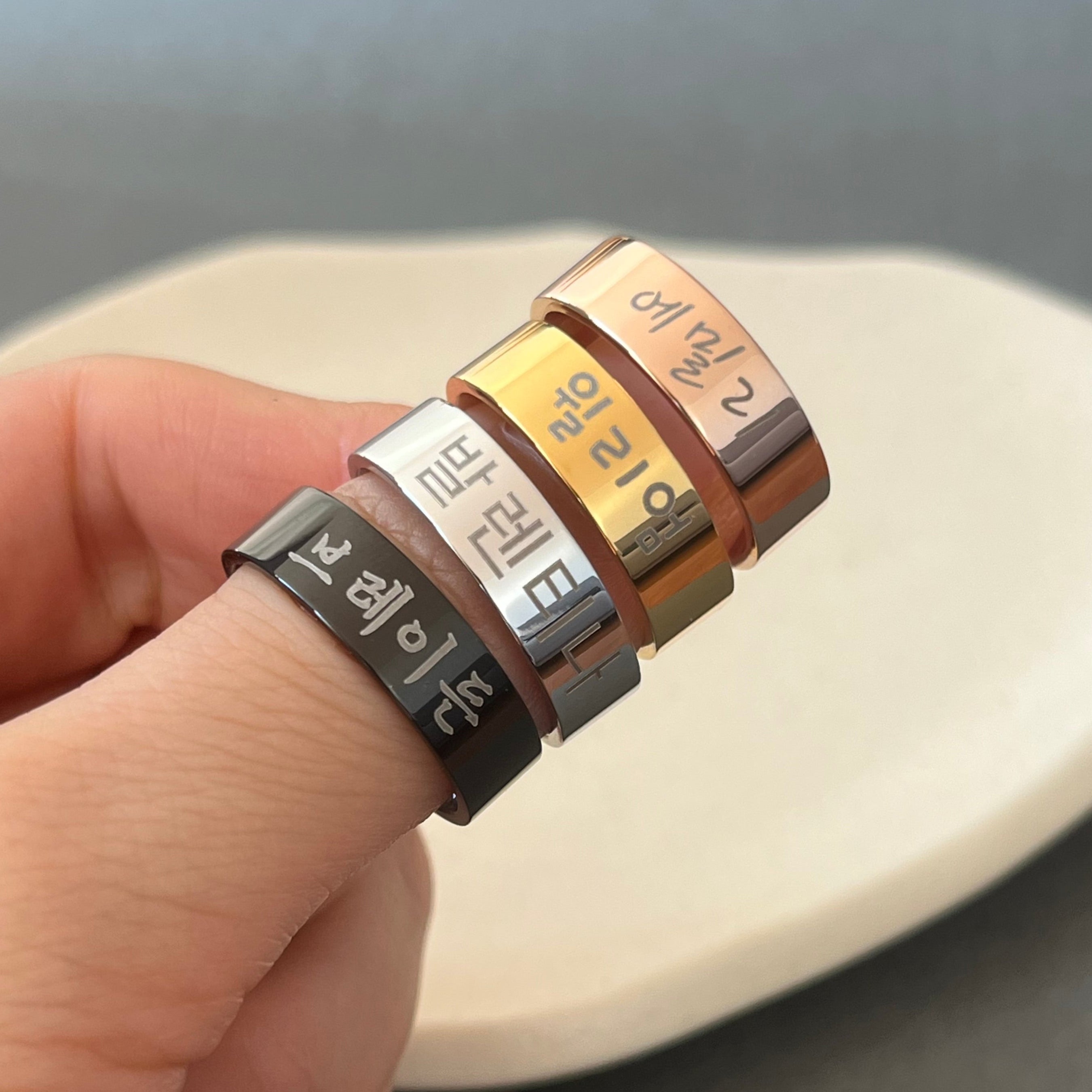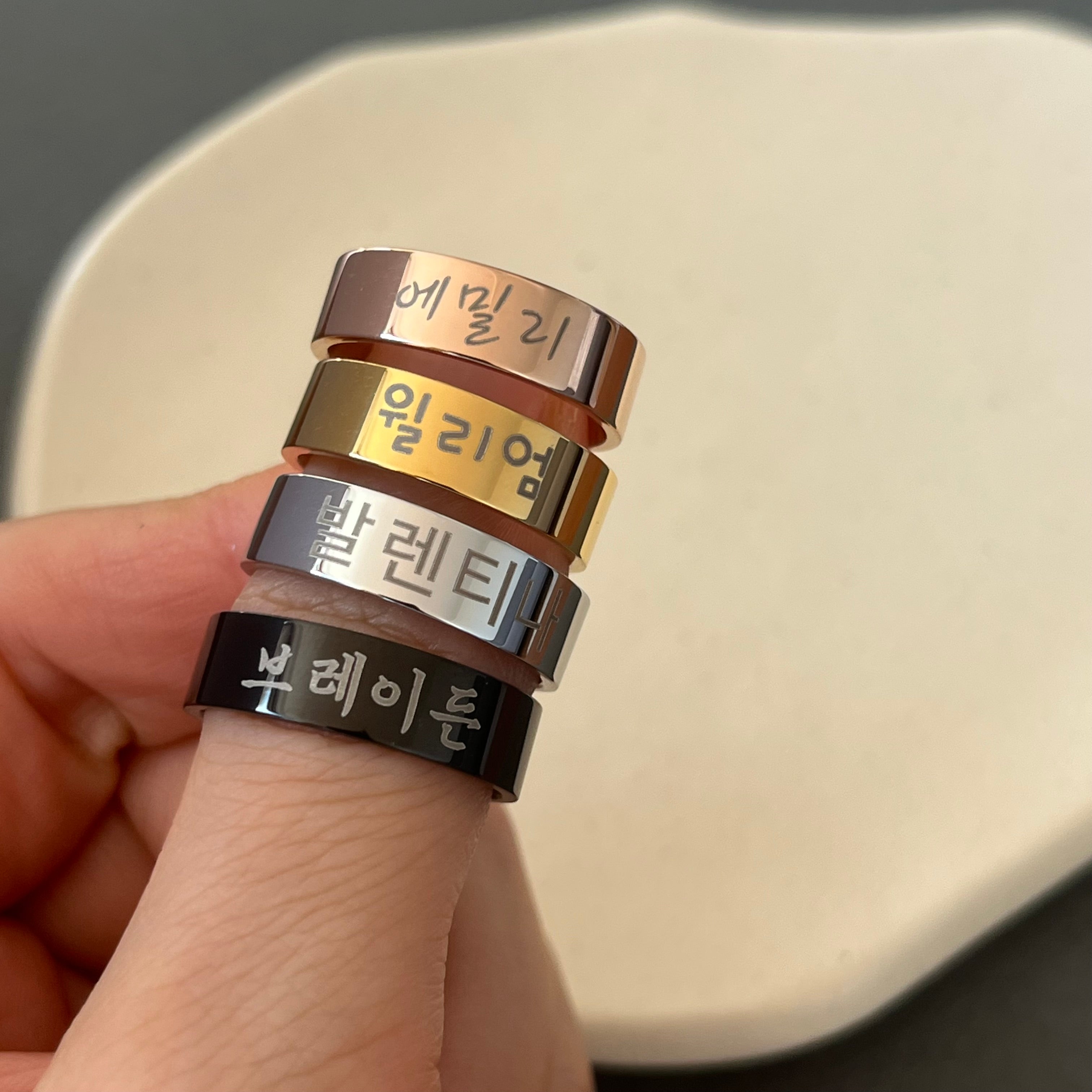 Il s'agit d'une bague avec nom coréen gravé personnalisé en acier inoxydable.