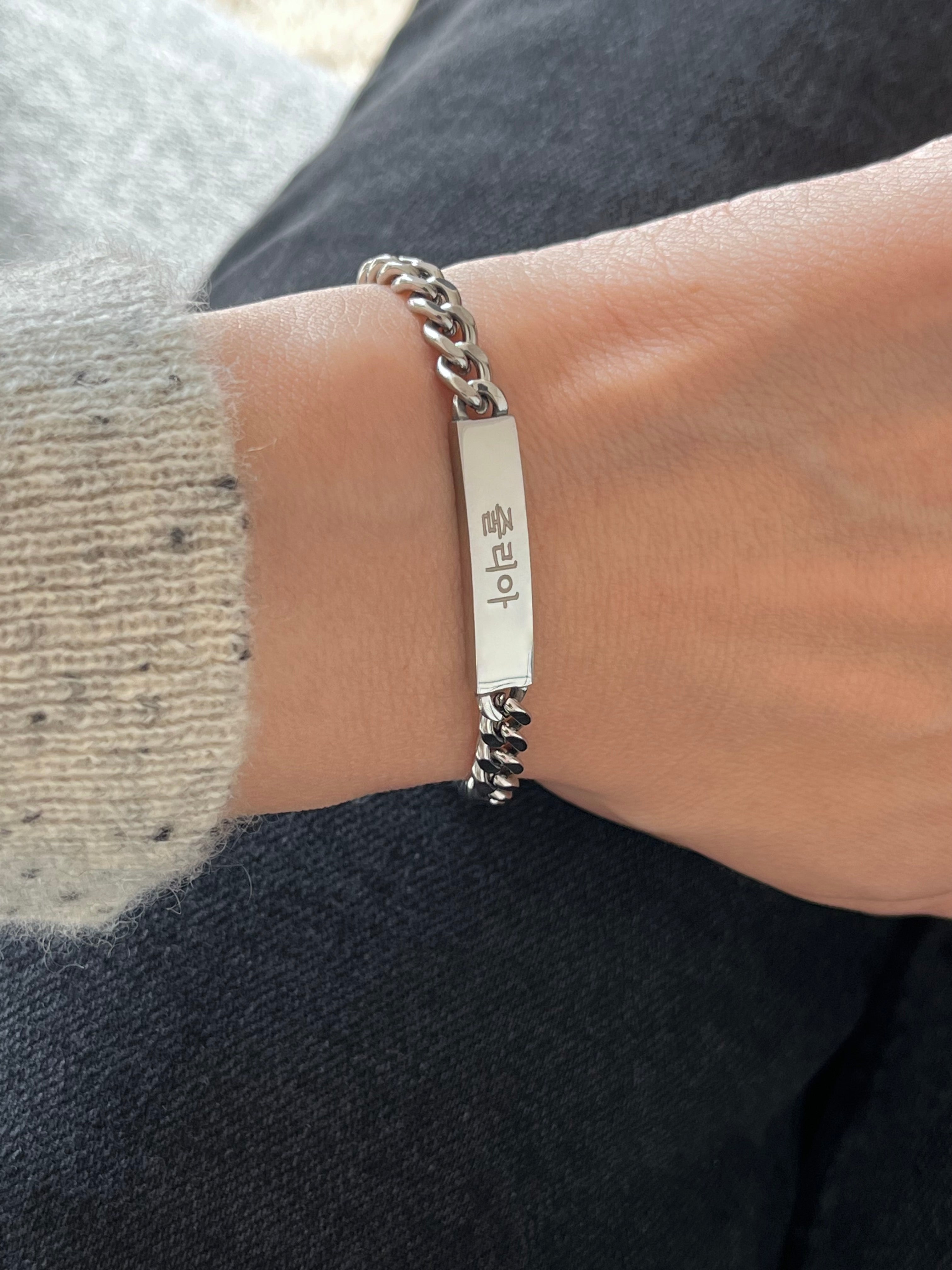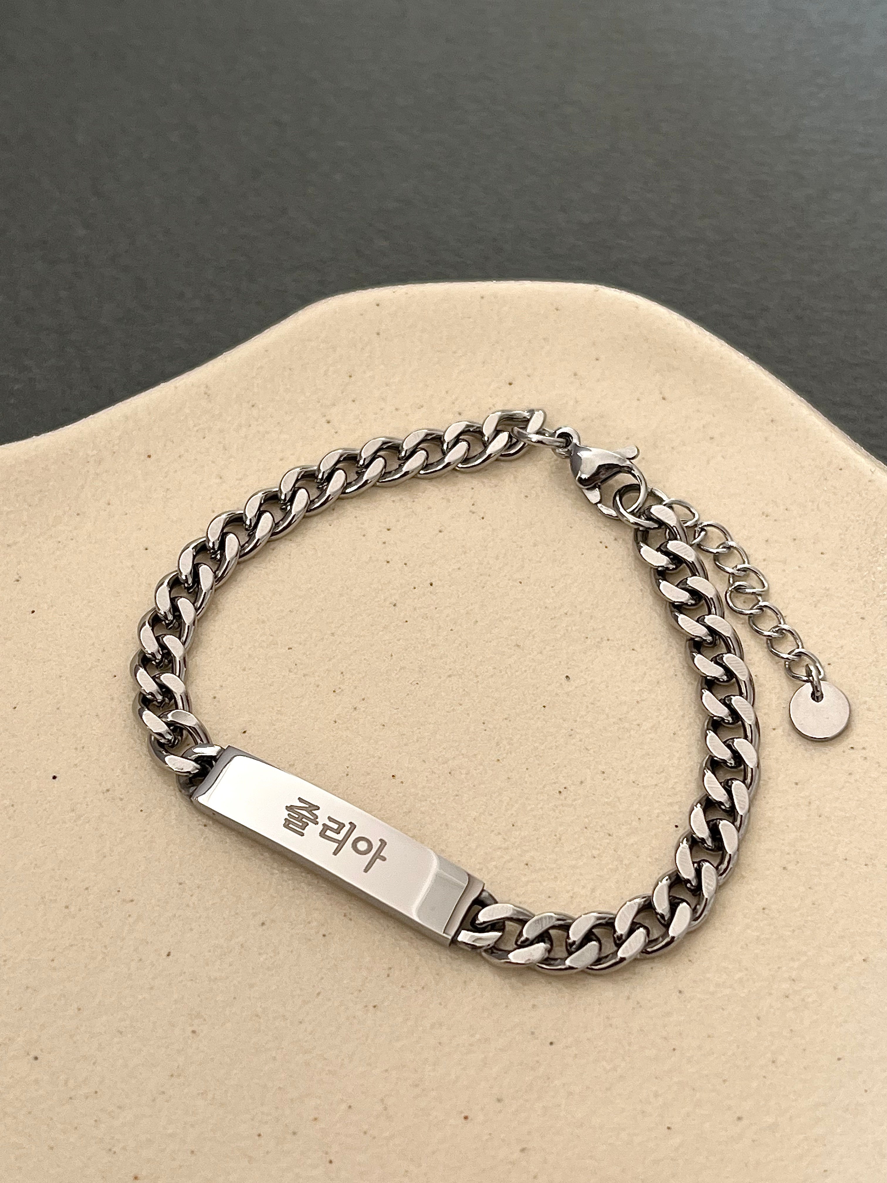 Cette liste est pour un bracelet en acier inoxydable de taille moyenne avec un nom coréen gravé personnalisé. Les bijoux en acier inoxydable sont solides et ne ternissent ou ne se corrodent presque jamais.