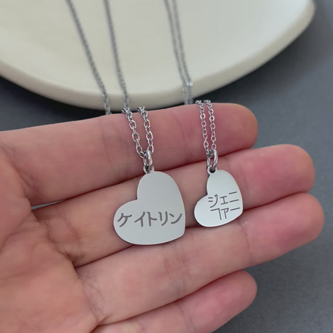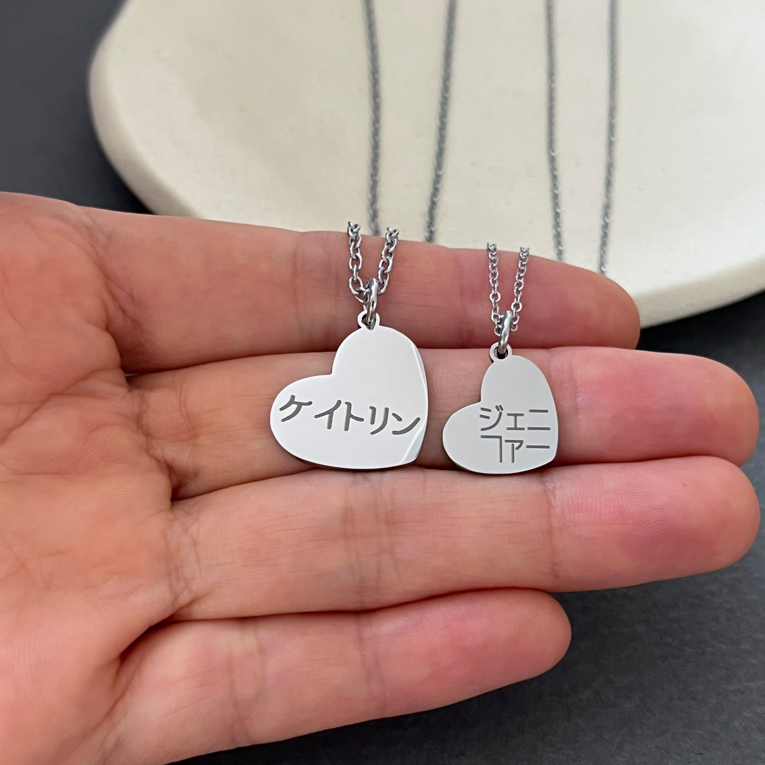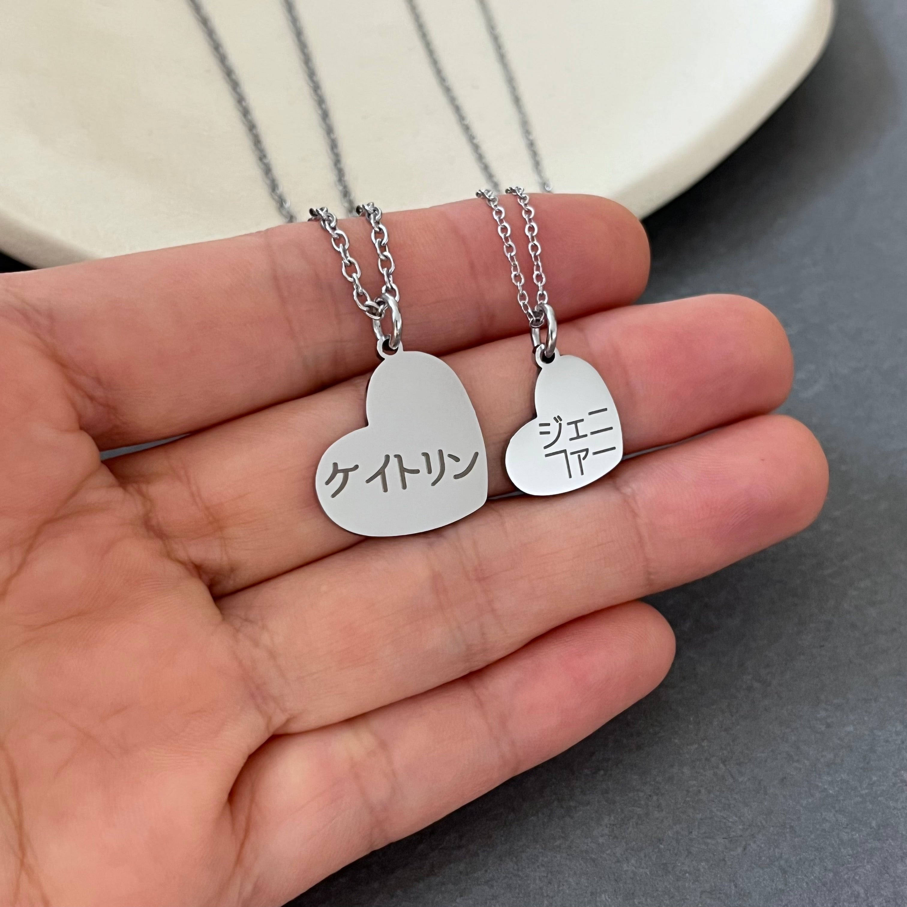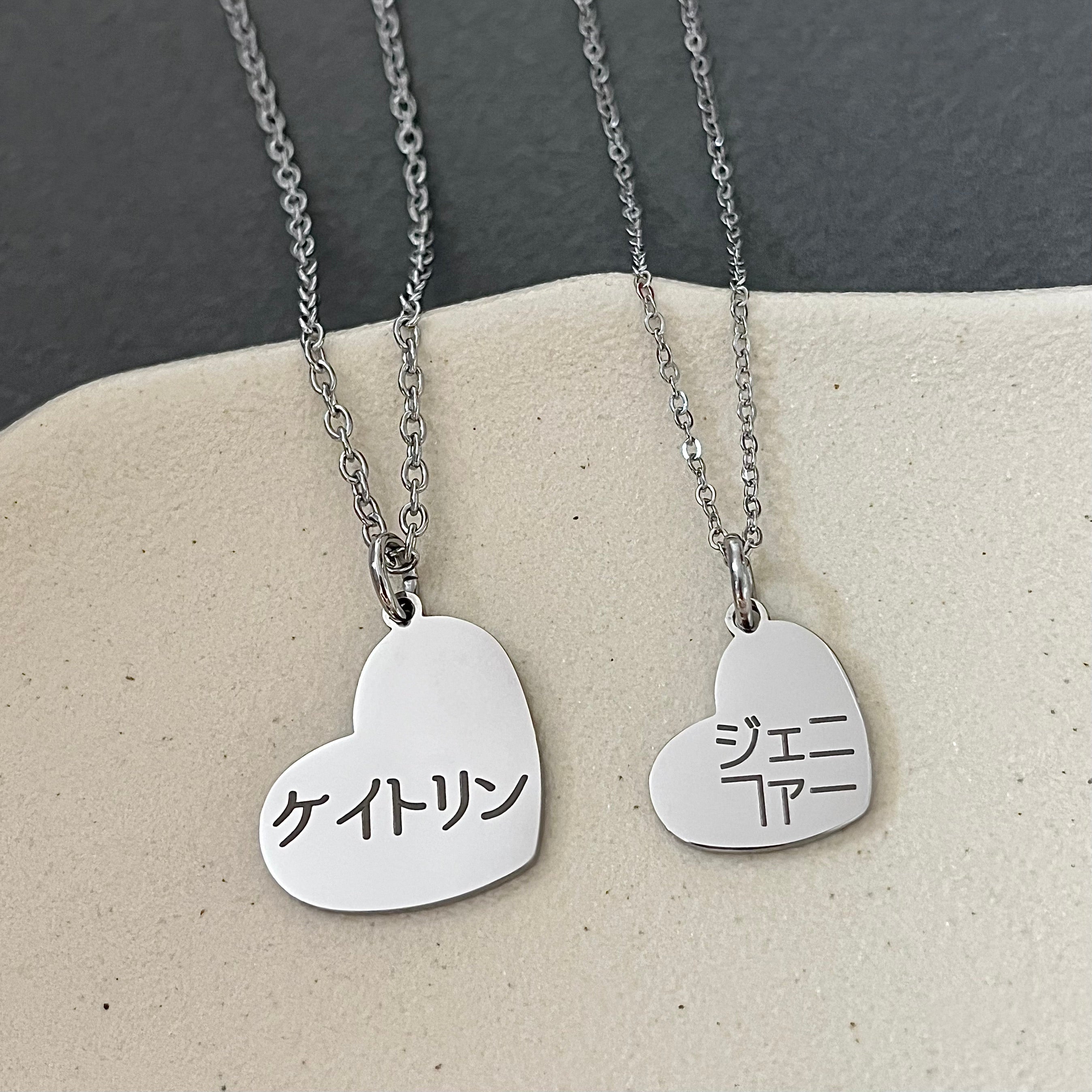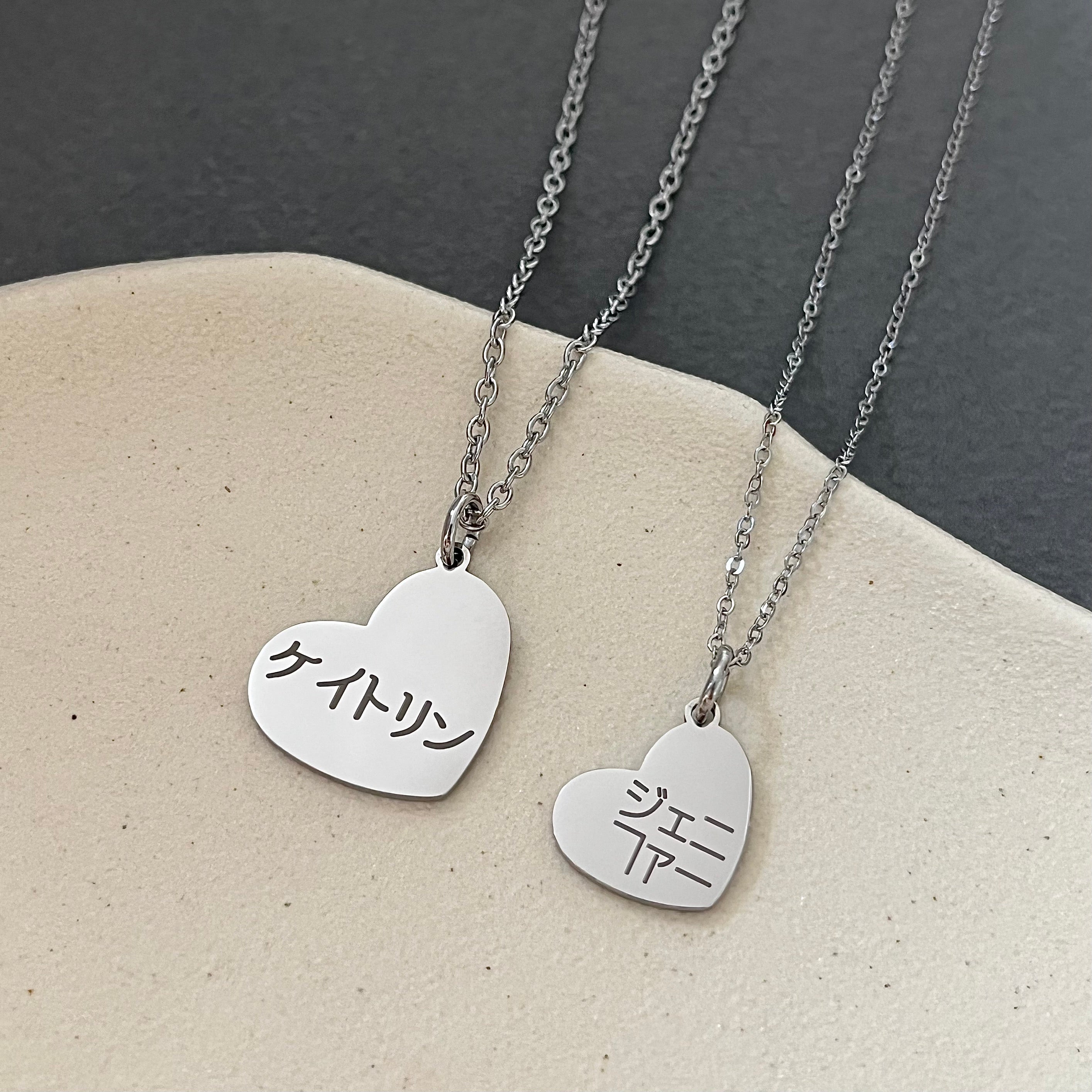 Collier en acier inoxydable avec nom japonais gravé personnalisé en forme de cœur incliné en 2 tailles de pendentif - Cadeaux japonais - Hiragana - Katakana -Kanji