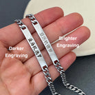 Les deux bracelets sont gravés avec Alejandro en chinois dans le style de police #1 (gravure plus claire) et #6 (gravure plus foncée).