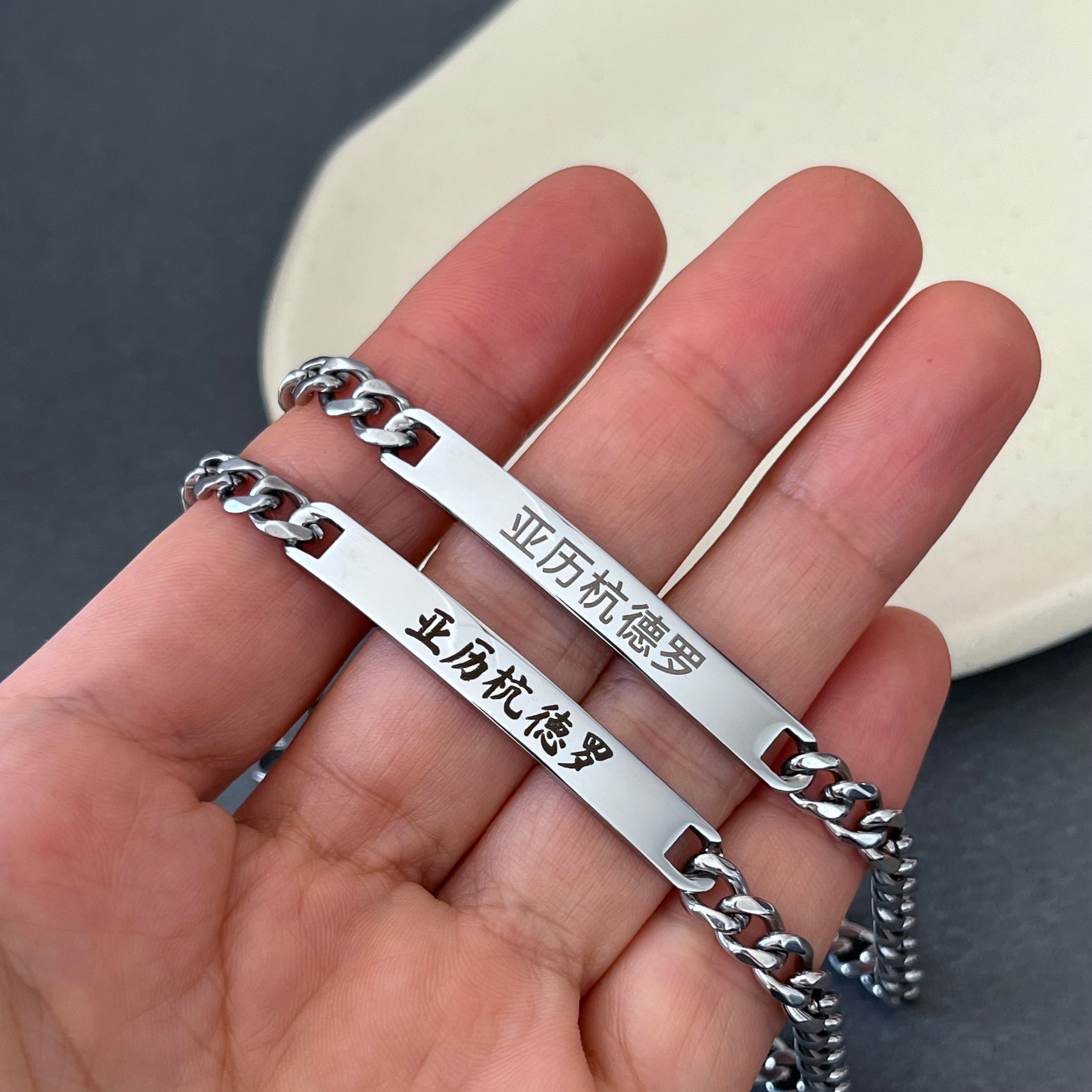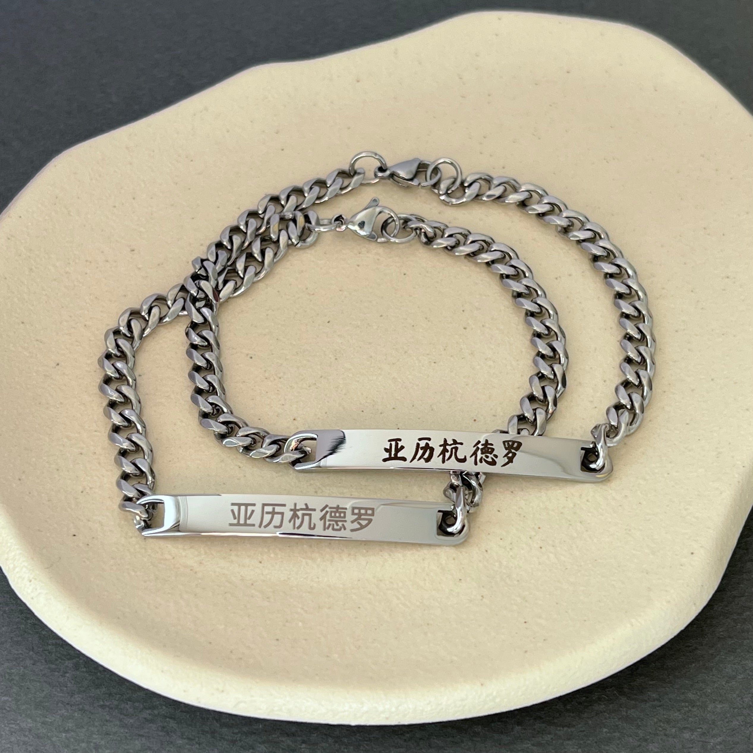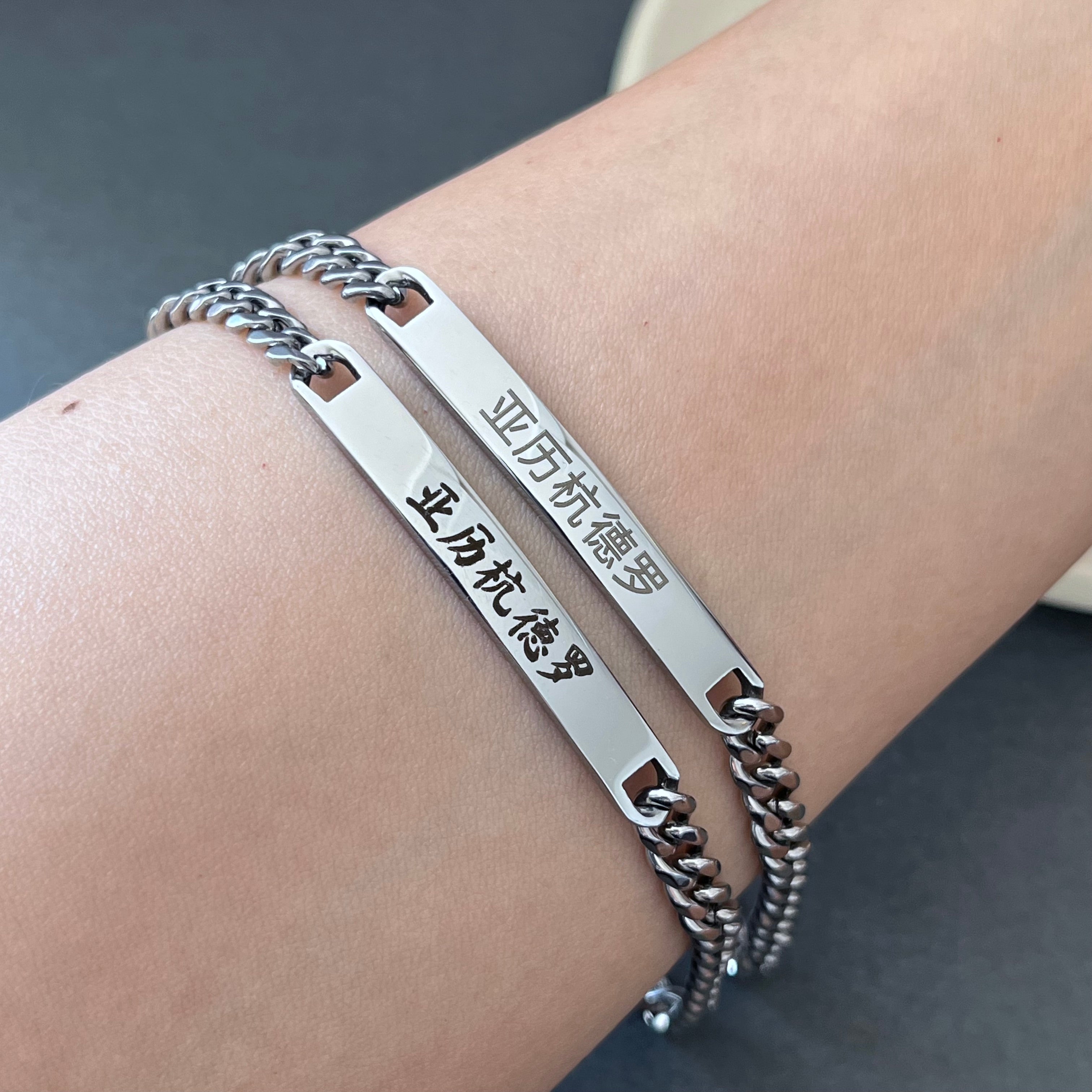 Il s'agit d'un bracelet personnalisé en acier inoxydable avec un nom chinois gravé. Les bijoux en acier inoxydable sont solides et ne ternissent ou ne se corrodent presque jamais.