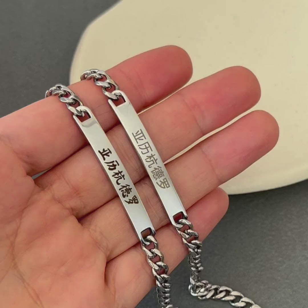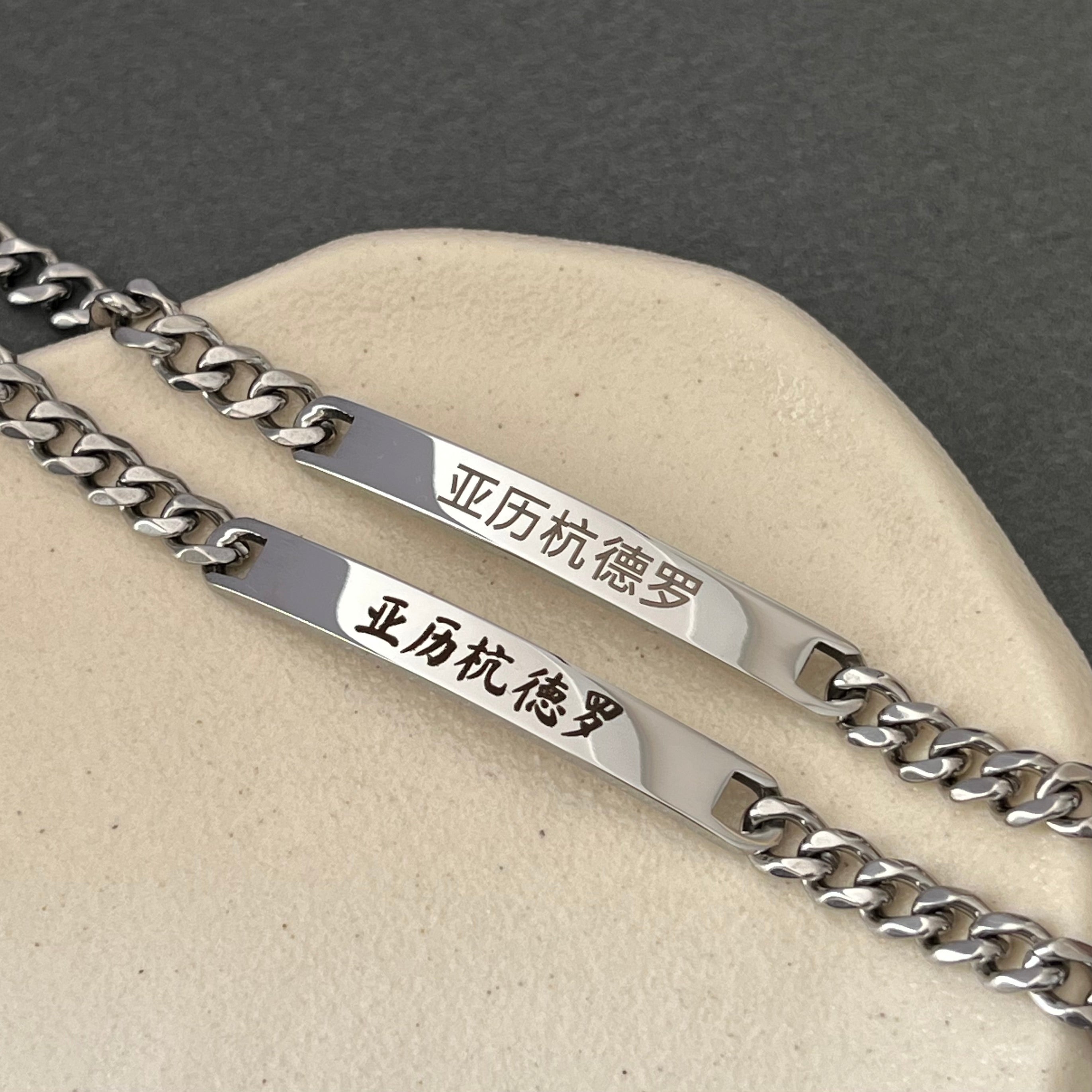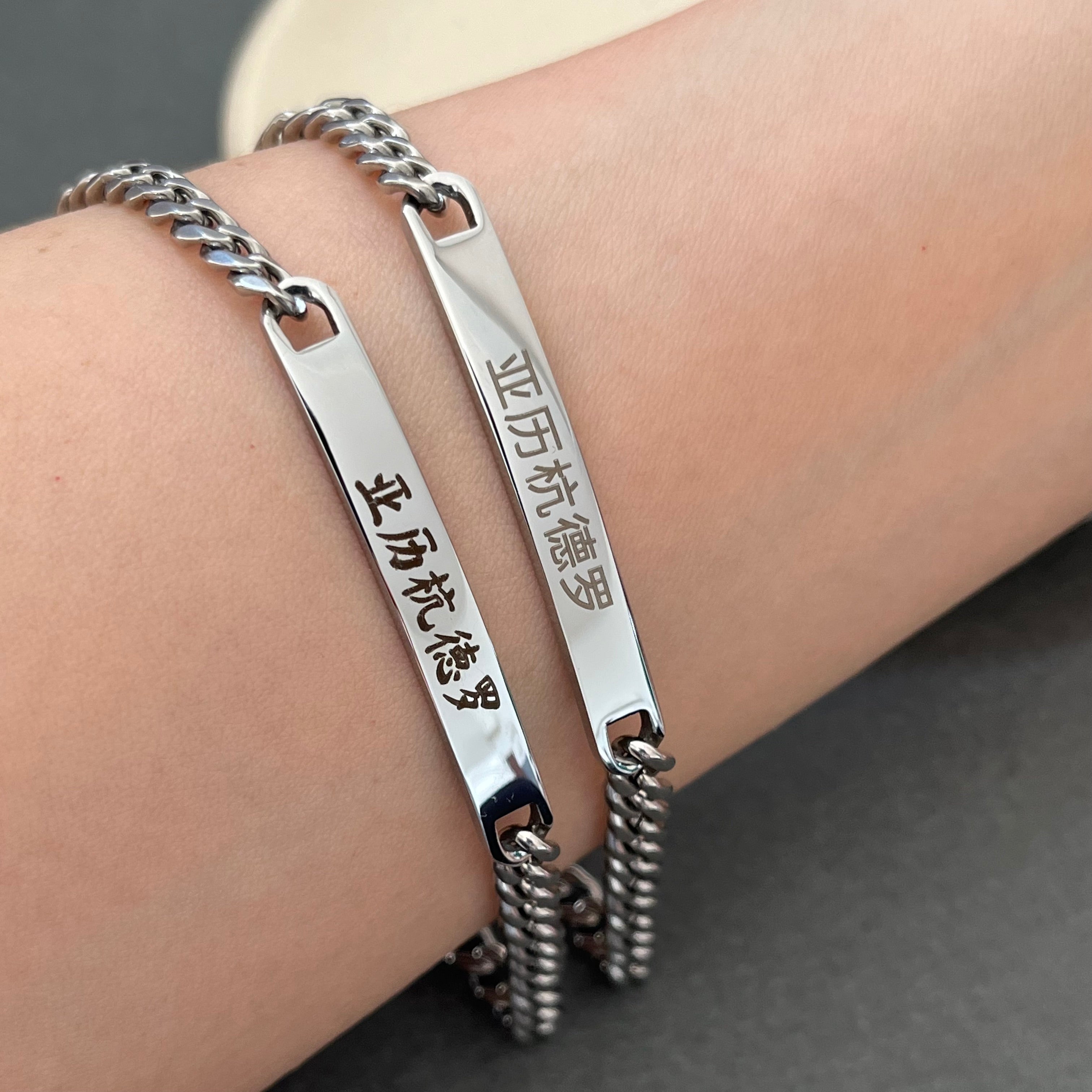 Il s'agit d'un bracelet personnalisé en acier inoxydable avec un nom chinois gravé. Les bijoux en acier inoxydable sont solides et ne ternissent ou ne se corrodent presque jamais.