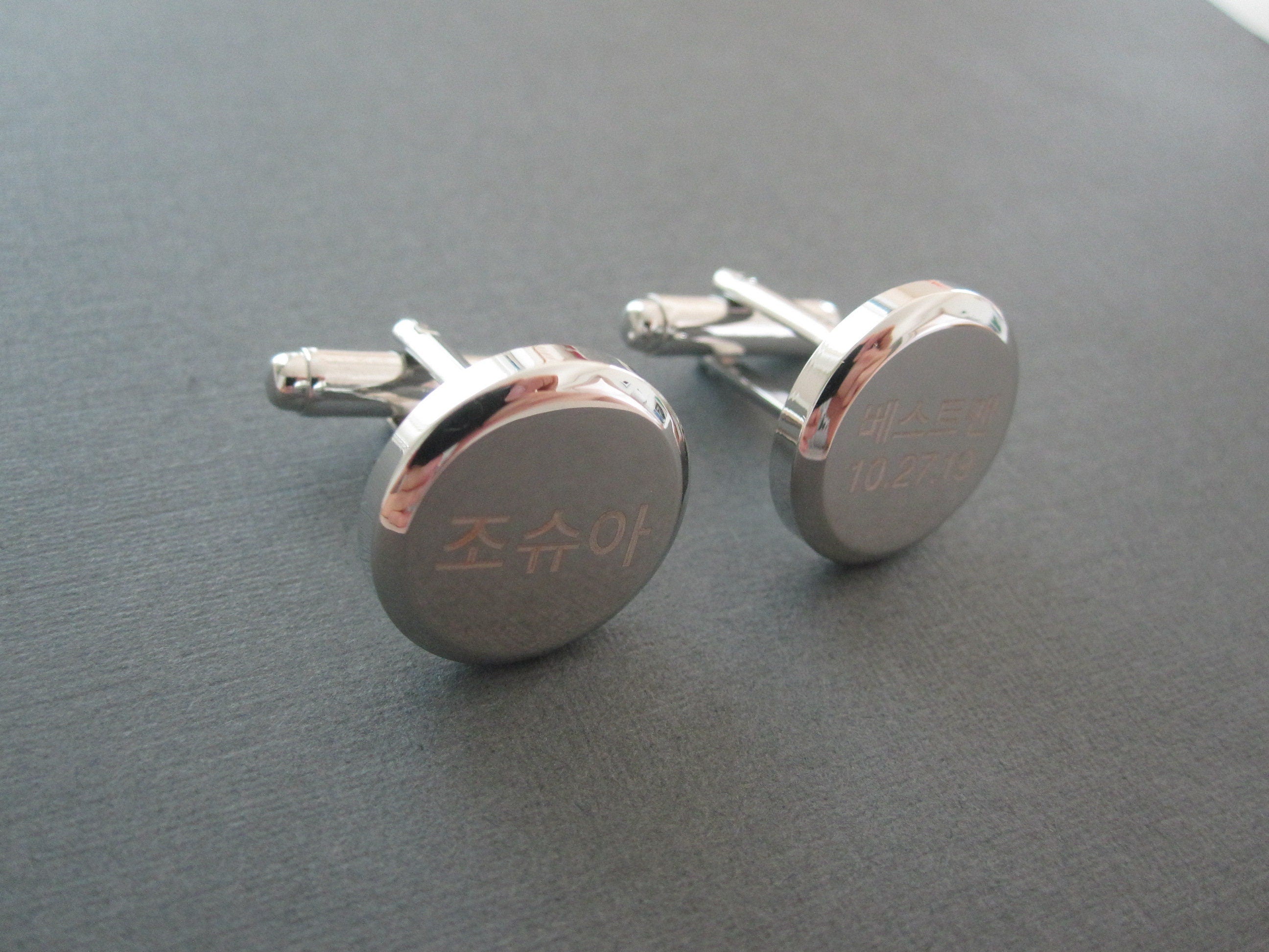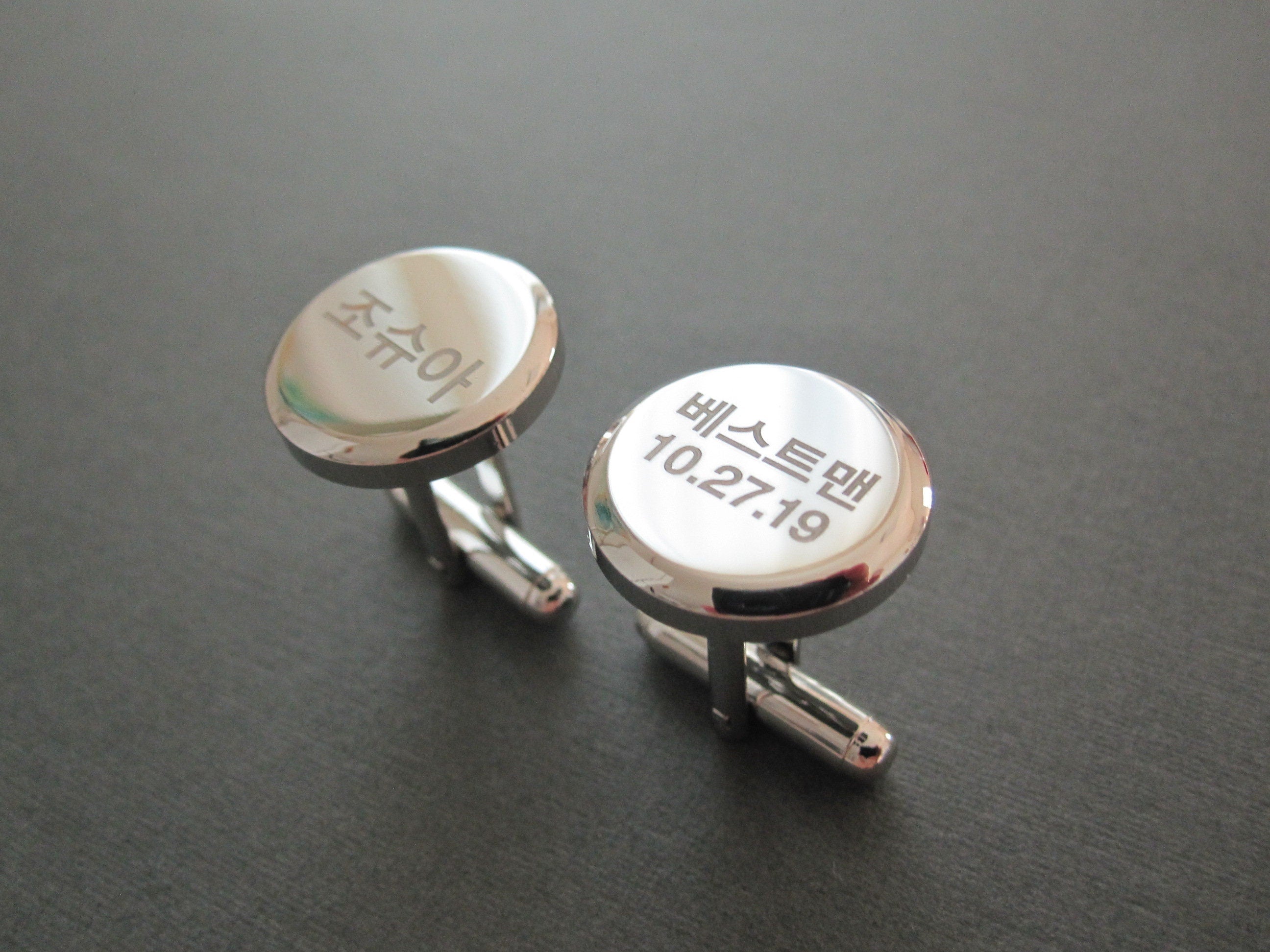 Les boutons de manchette ronds sont gravés avec Joshua (celui de gauche) et le témoin (celui de droite) en coréen dans la police #1. La date est gravée dans la police #18. Veuillez vérifier les options de police sur les images.