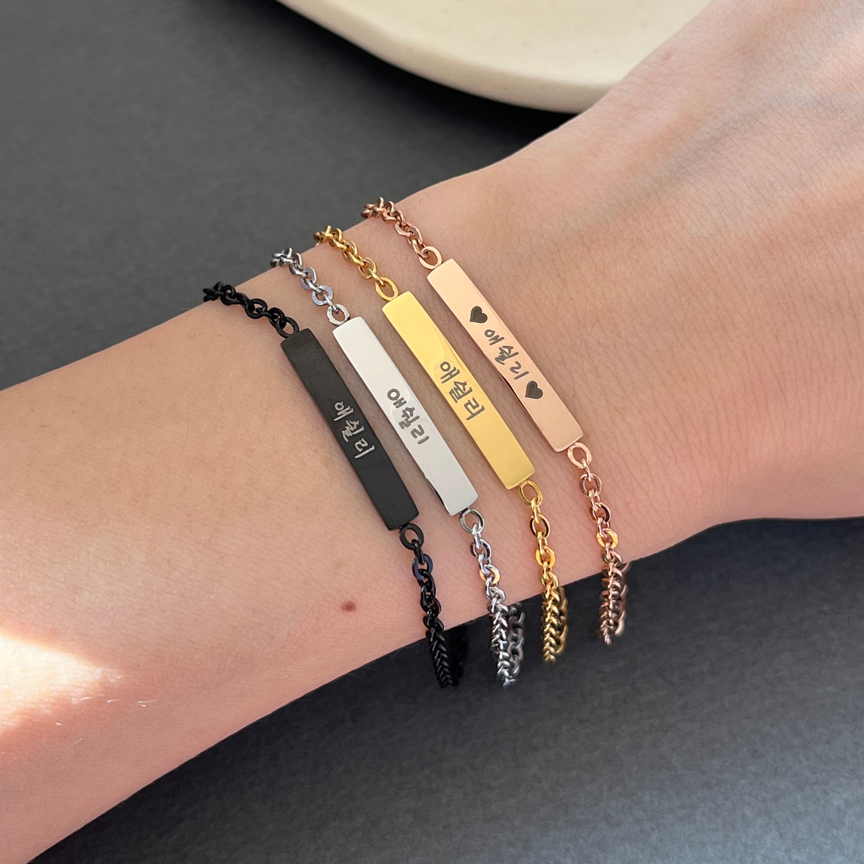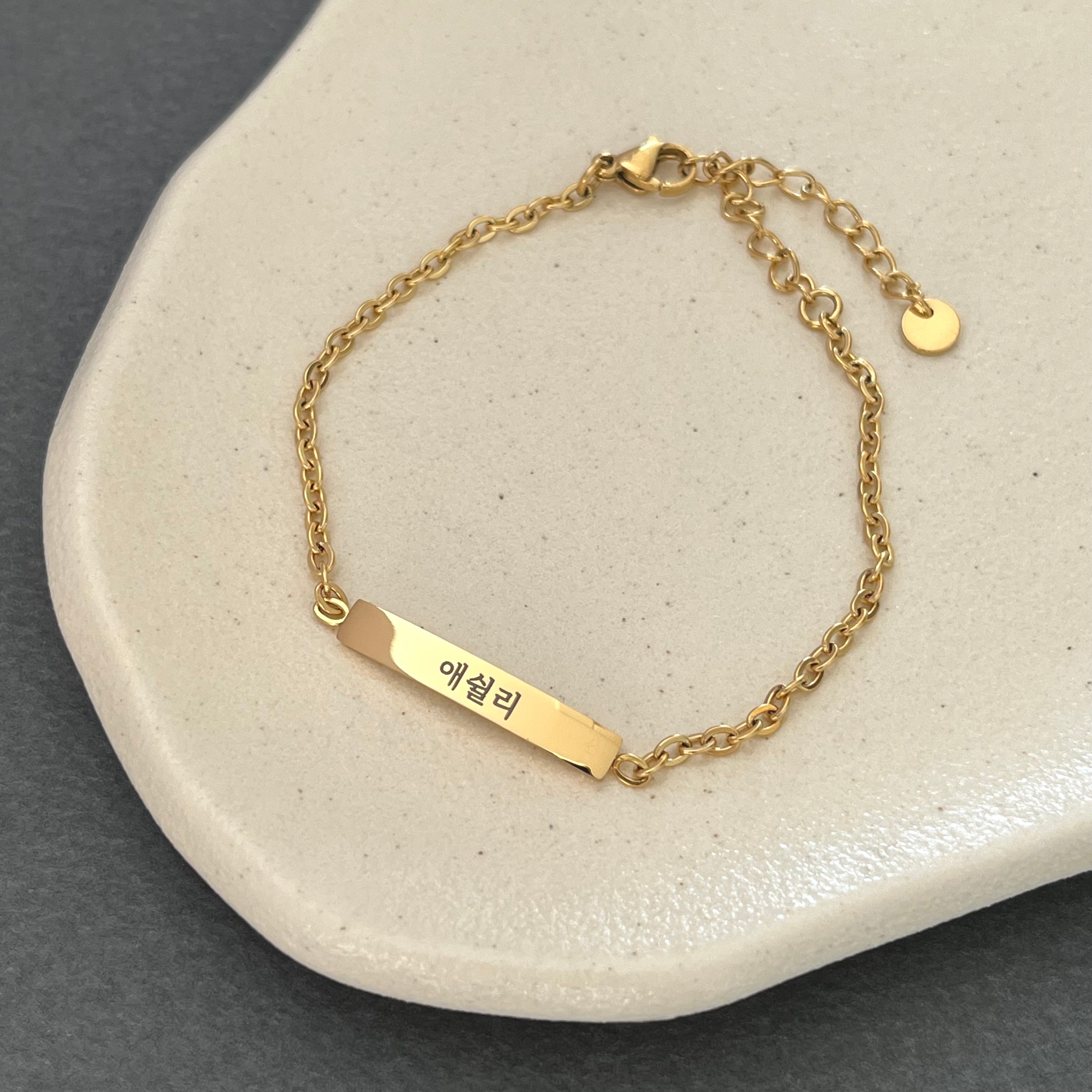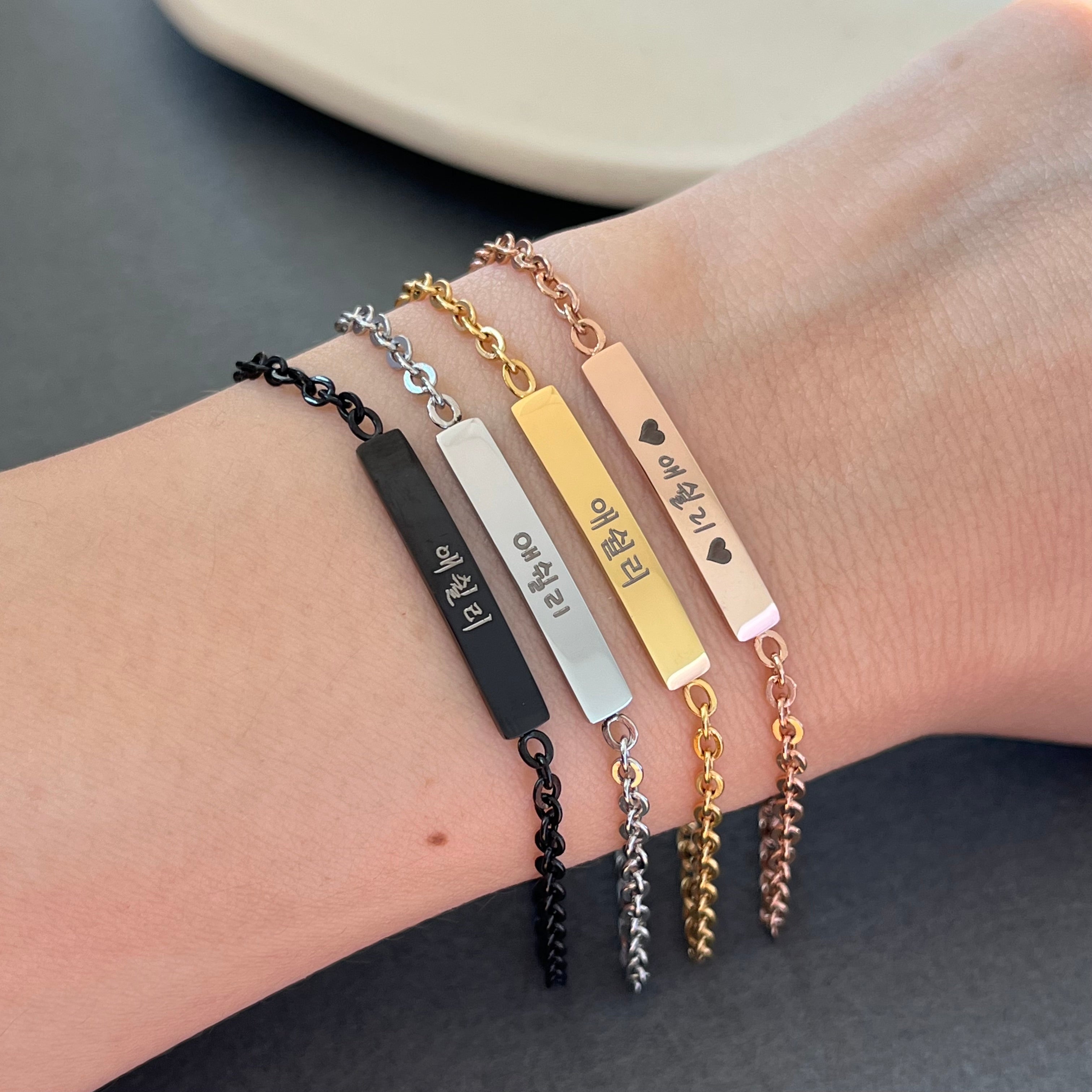 Il s'agit d'un bracelet mini barre délicat personnalisé avec un nom coréen en acier inoxydable.