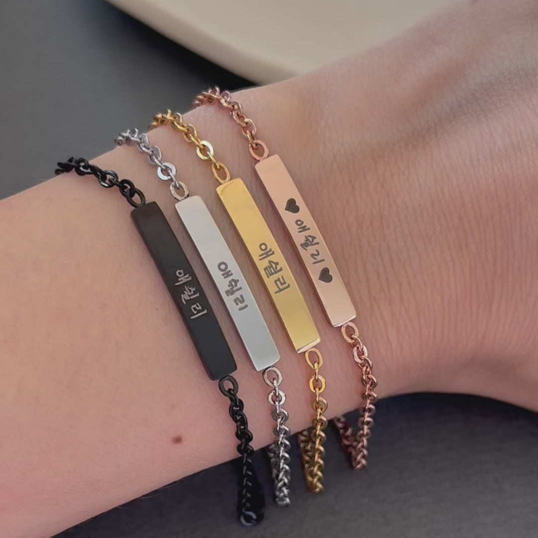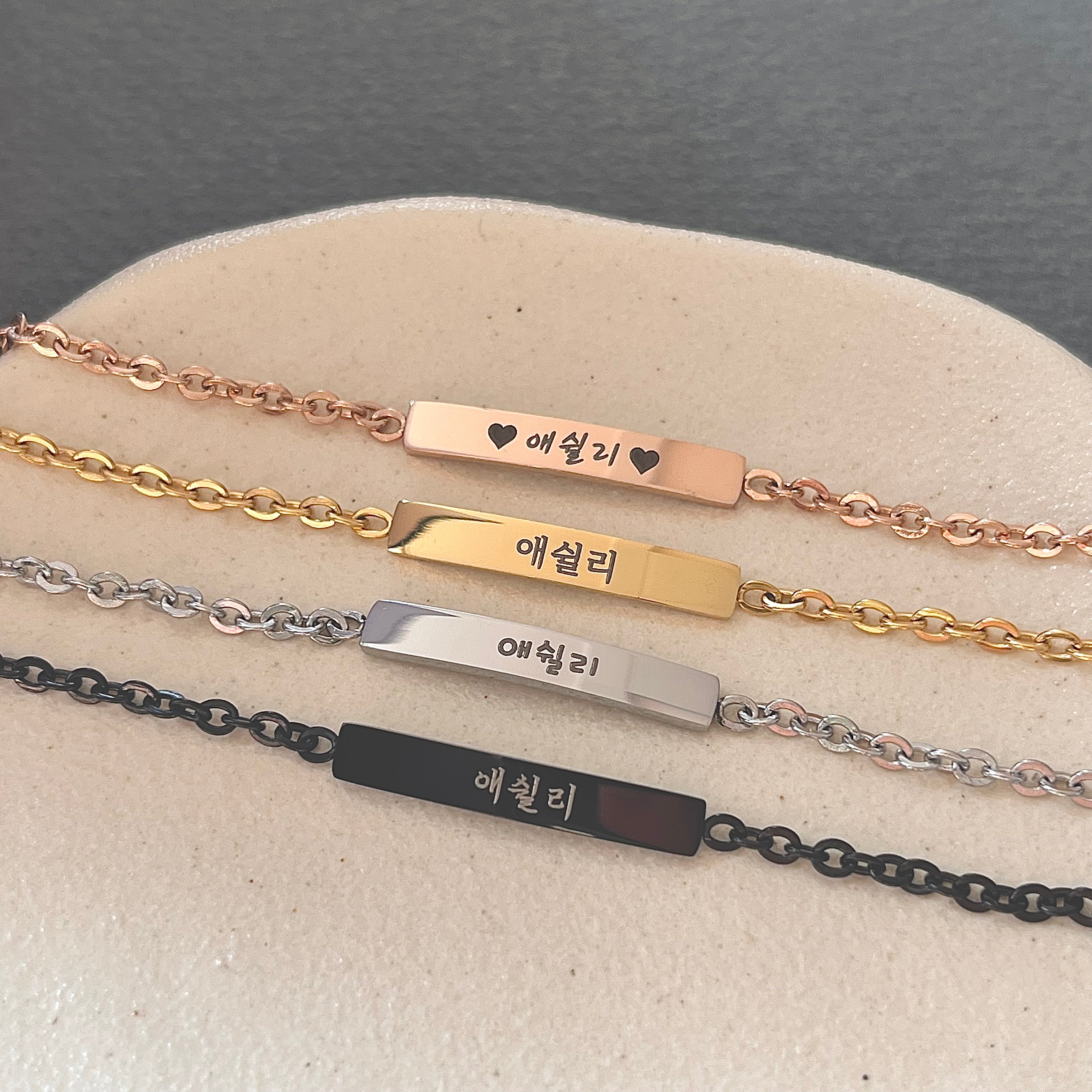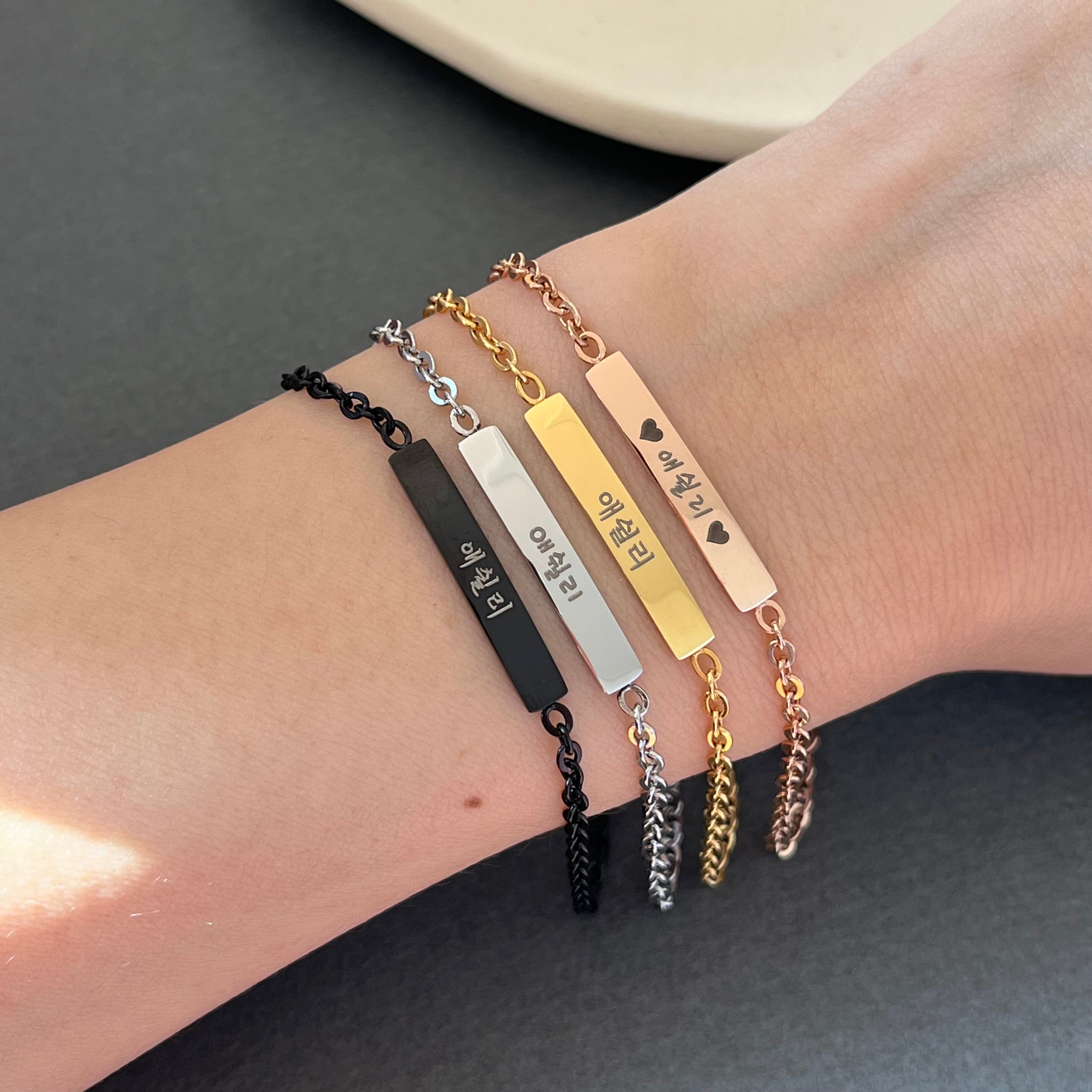 Il s'agit d'un bracelet mini barre délicat personnalisé avec un nom coréen en acier inoxydable.