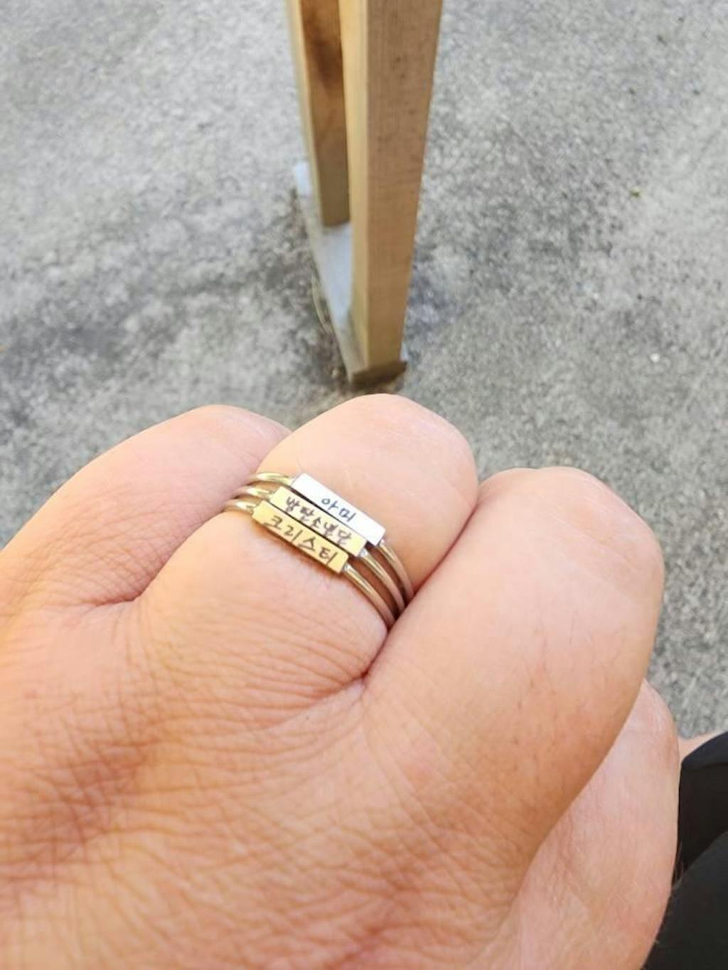 Voici une bague fine personnalisée en acier inoxydable avec prénom coréen gravé foncé.