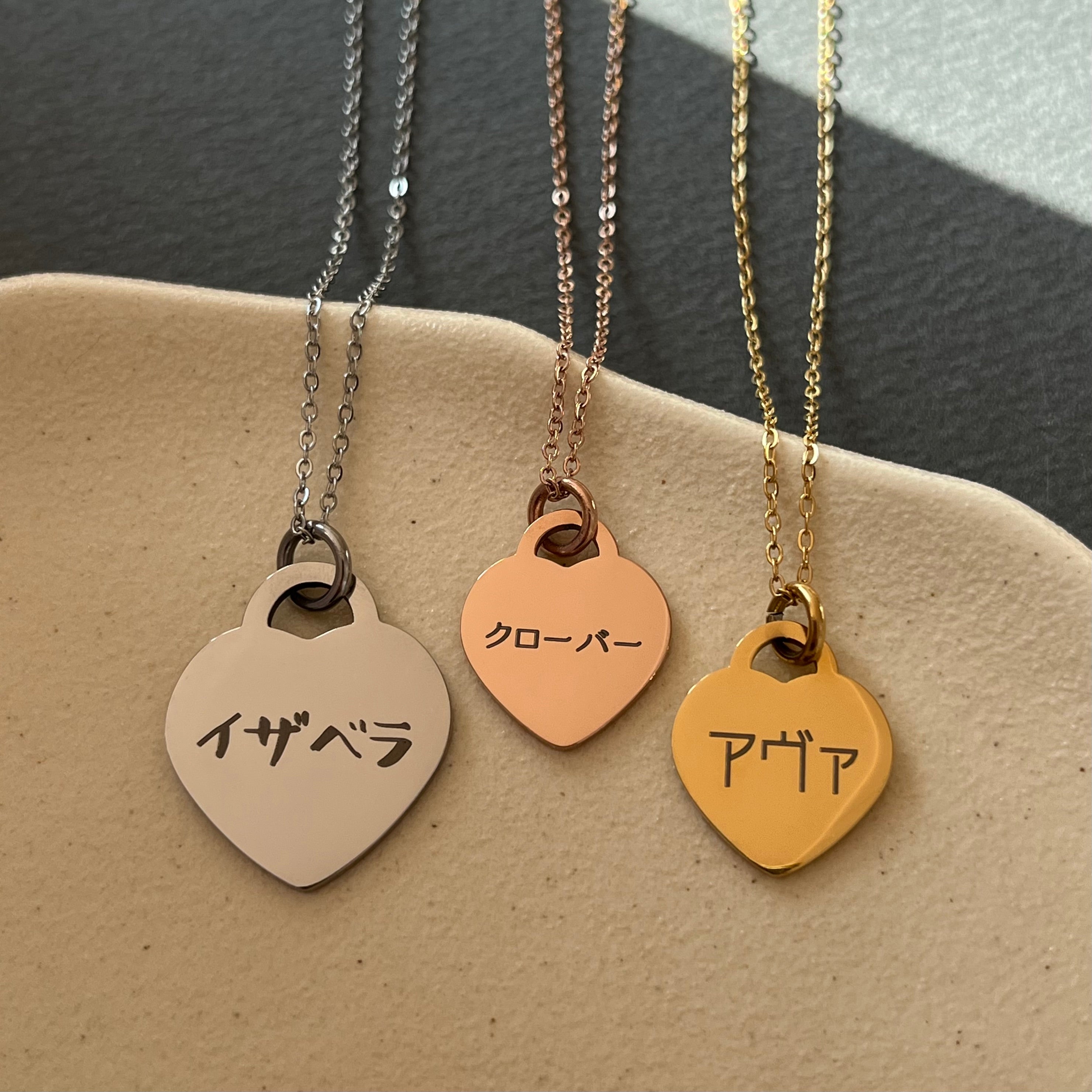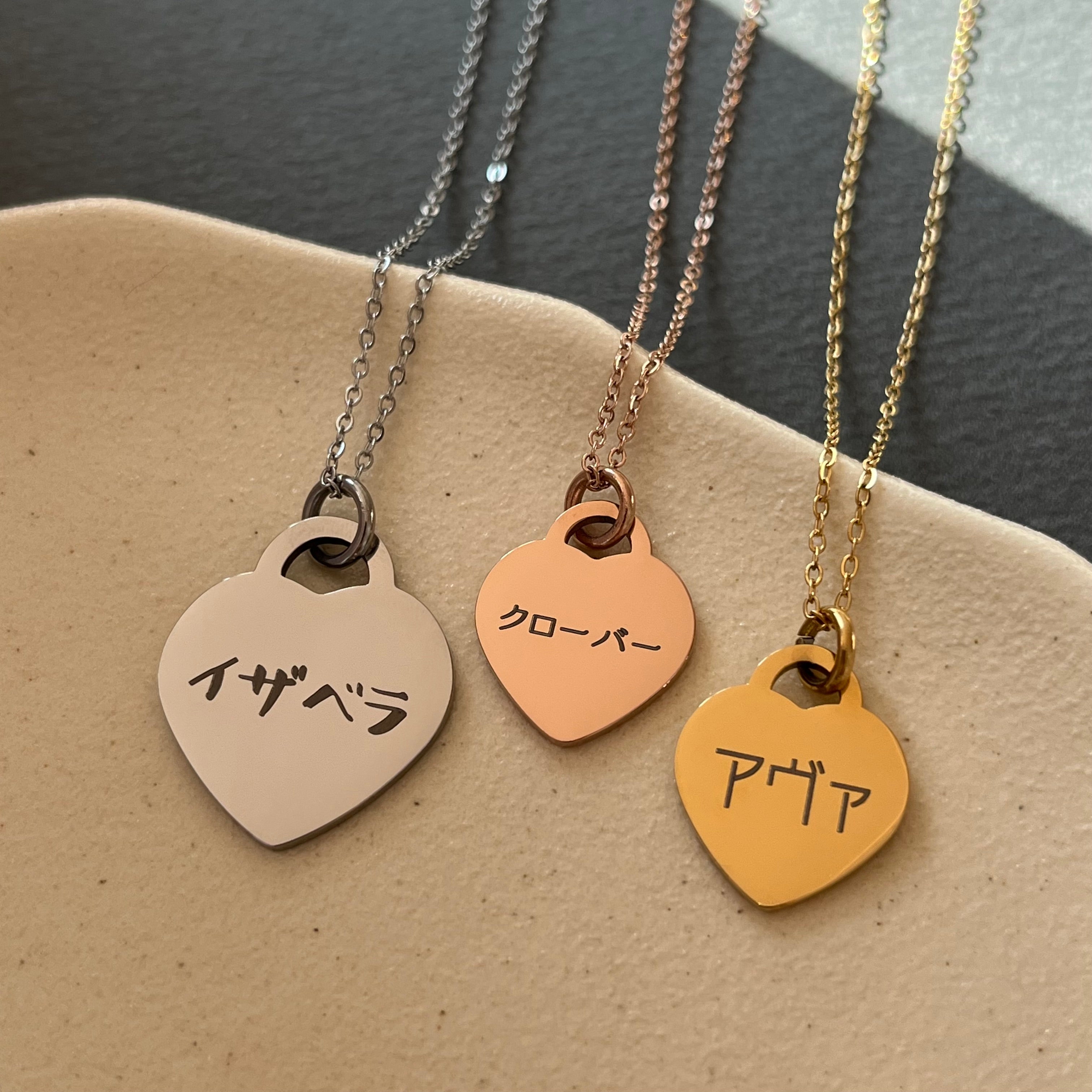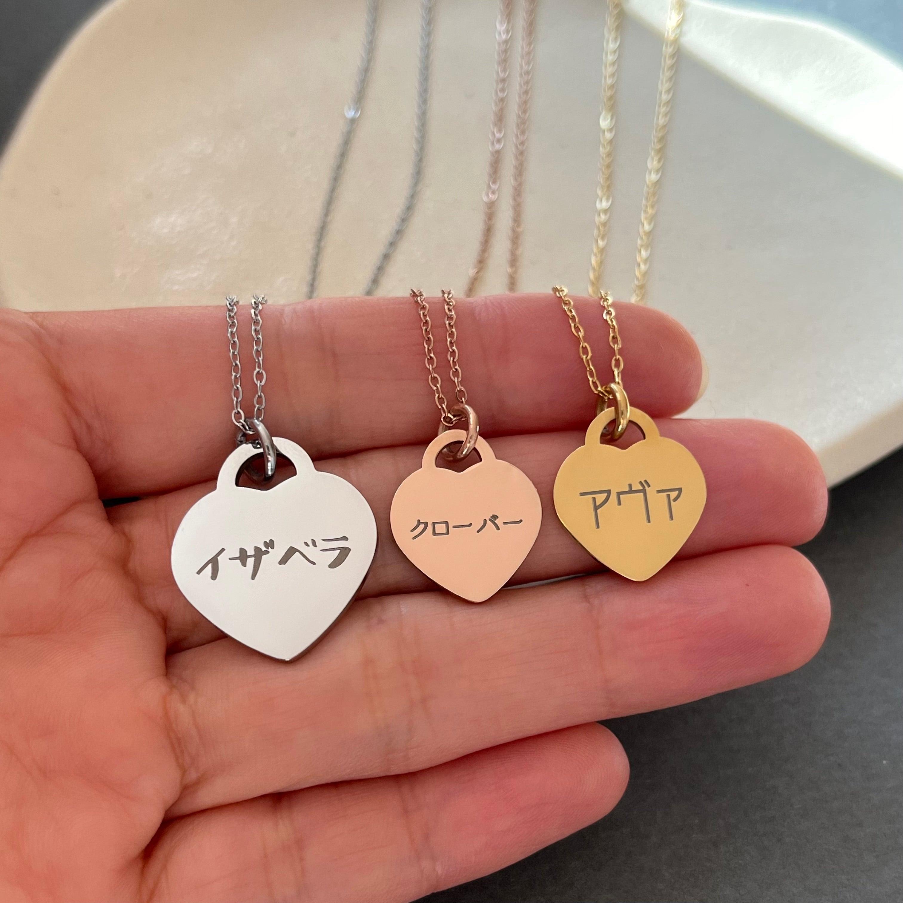 Personalized Engraved Japanese Name Heart Stainless Steel Necklace in 2 Pendant Sizes - Japan Gifts - Hiragana - Katakana -Kanji