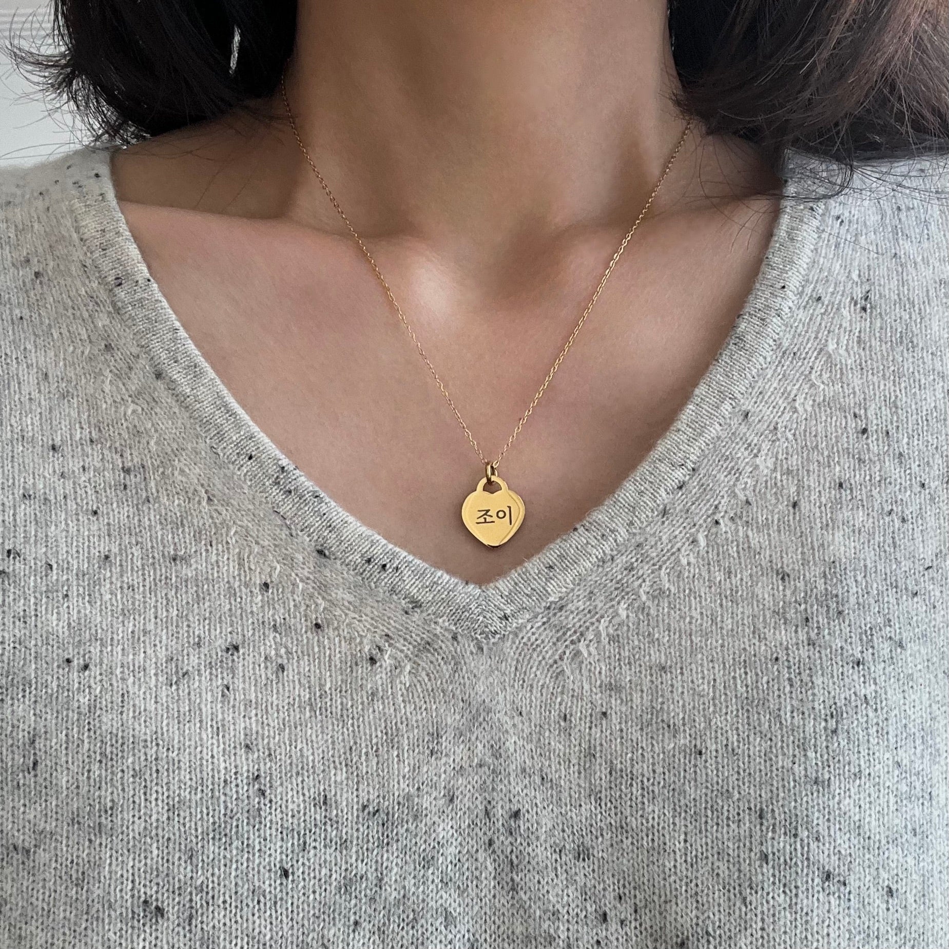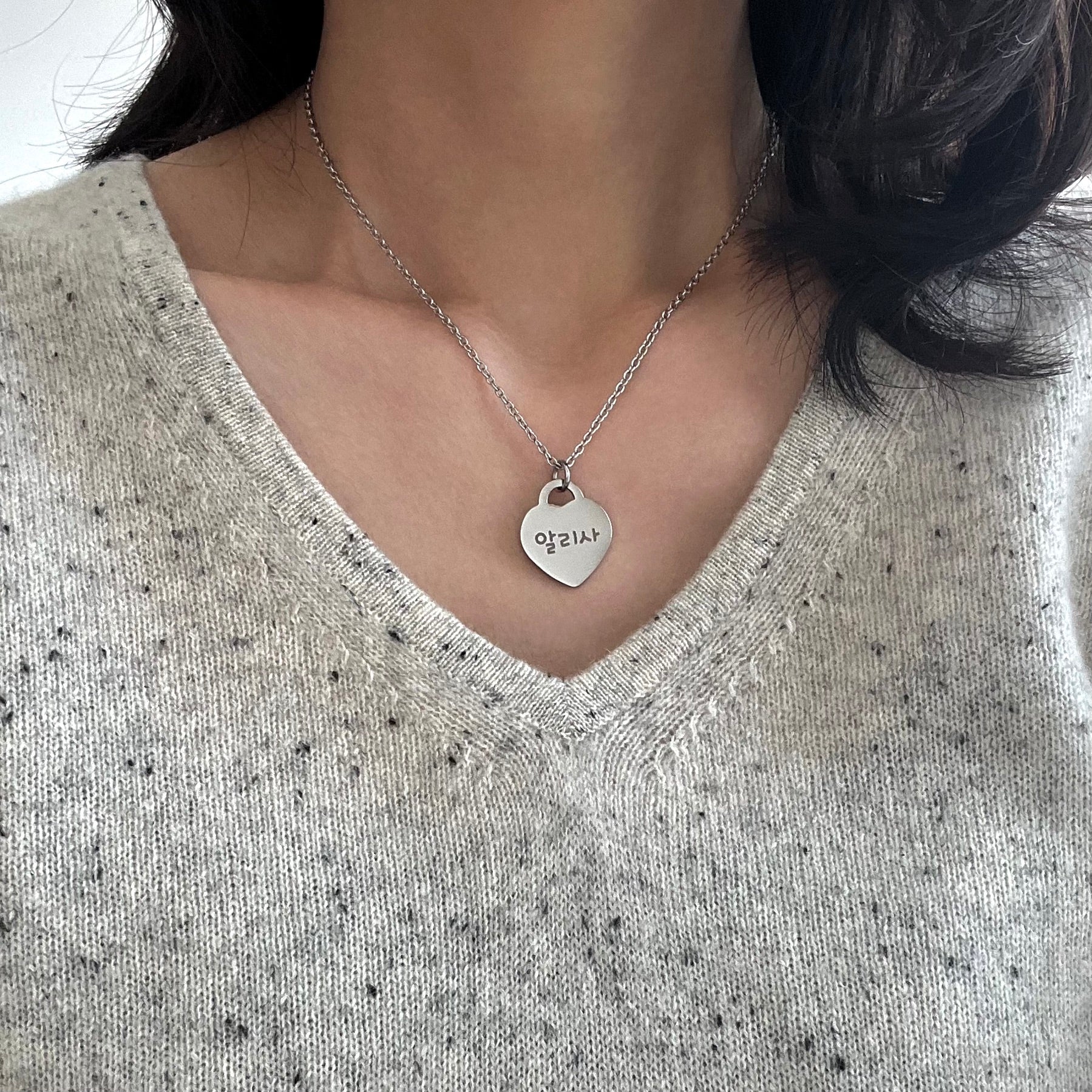 This is a personalized engraved Japanese name heart necklace in stainless steel.